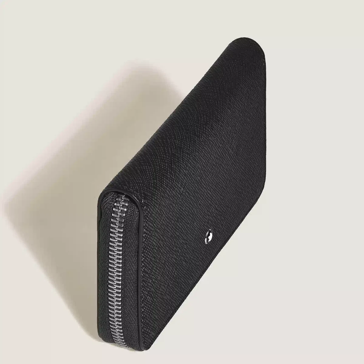 Diese funktionale Rundum-Geldbörse mit Reißverschluss verbindet zeitlosen Stil mit praktischer Funktionalität. Sie ist aus geprägtem Sartorial-Leder in klassischem Schwarz gefertigt und verfügt über einen markanten Metall-Reißverschlusszieher in Form einer Feder, der eine Hommage an die Schreibkunsttradition von Montblanc darstellt. Im Inneren bietet die Geldbörse 12 Kreditkartenfächer, ein sicheres Münzfach mit Reißverschluss und drei zusätzliche Fächer für Quittungen oder andere wichtige Dinge.