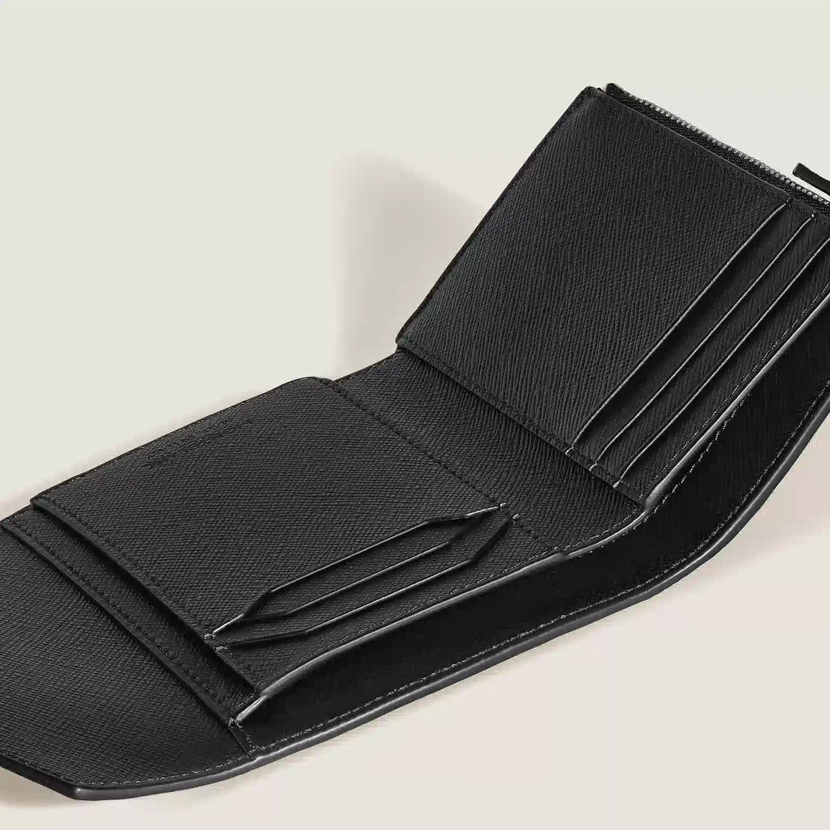 Diese dreifach gefaltete Brieftasche aus geprägtem Sartorial-Leder in einer raffinierten zweifarbigen Kombination aus edlem Blau und Schwarz ist sowohl stilvoll als auch praktisch. Sie passt bequem in Ihre Tasche und verfügt über einen Verschluss, hinter dem sich ein Reißverschlussfach für Münzen und Schlüssel, sechs Kreditkartenfächer, ein Fach für Banknoten und zwei zusätzliche Fächer für zusätzlichen Stauraum befinden.