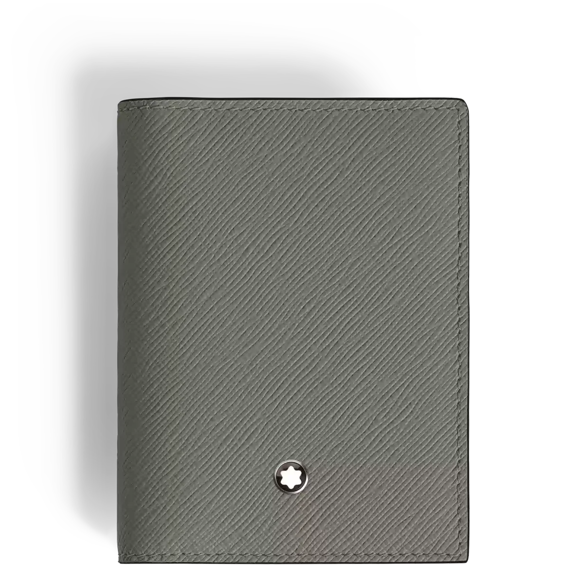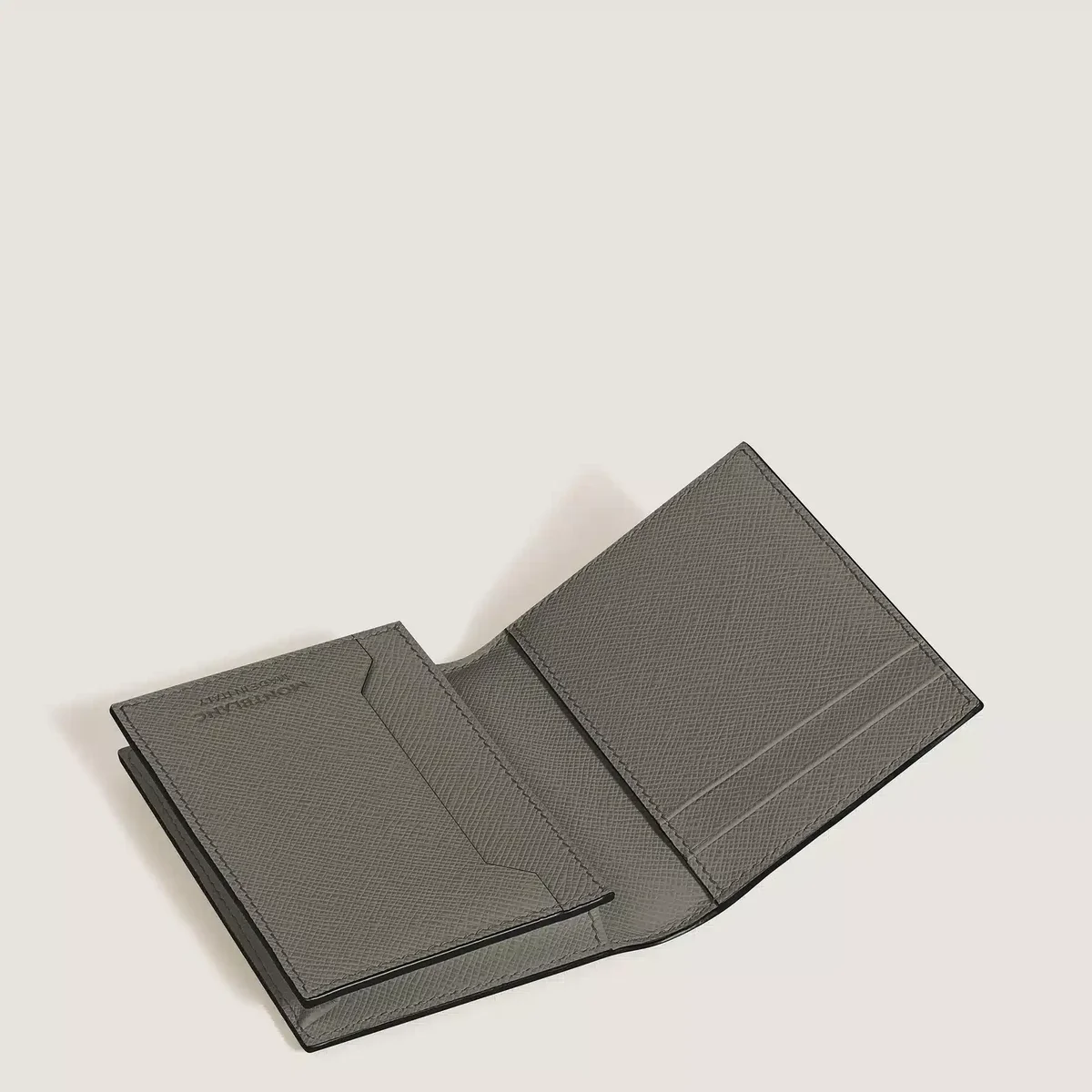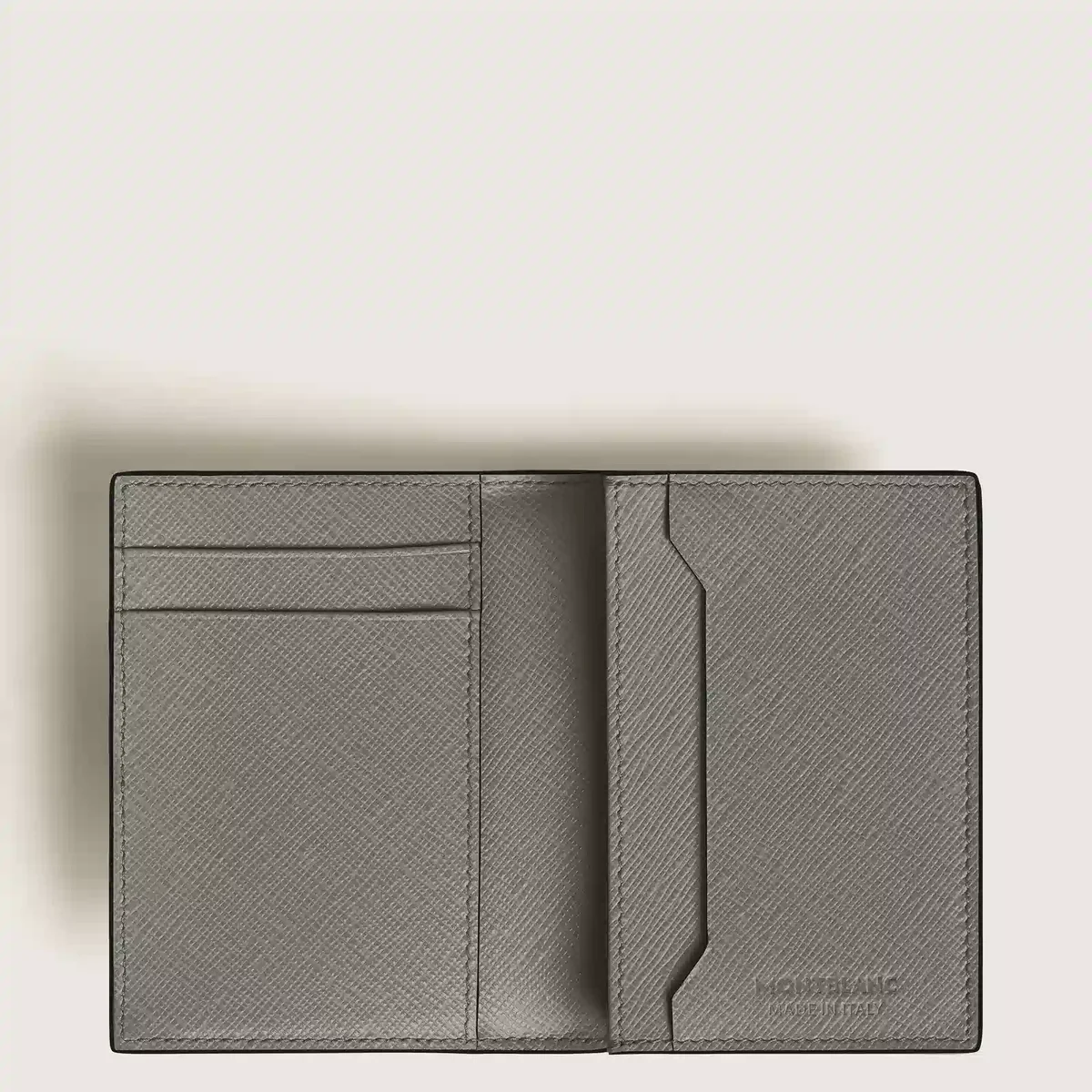 Obwohl dieser Lederkartenhalter kompakt ist, erweist er sich mit seinen funktionalen Details sowohl außen als auch innen als wahrhaft vielseitiger Begleiter. Im Inneren befinden sich drei Kreditkartenfächer und ein Visitenkartenfach sowie eine zusätzliche Tasche. Er ist aus mittelgrauem Saffiano-Leder gefertigt und verfügt außen über ein zusätzliches Fach für eine vierte Kreditkarte.