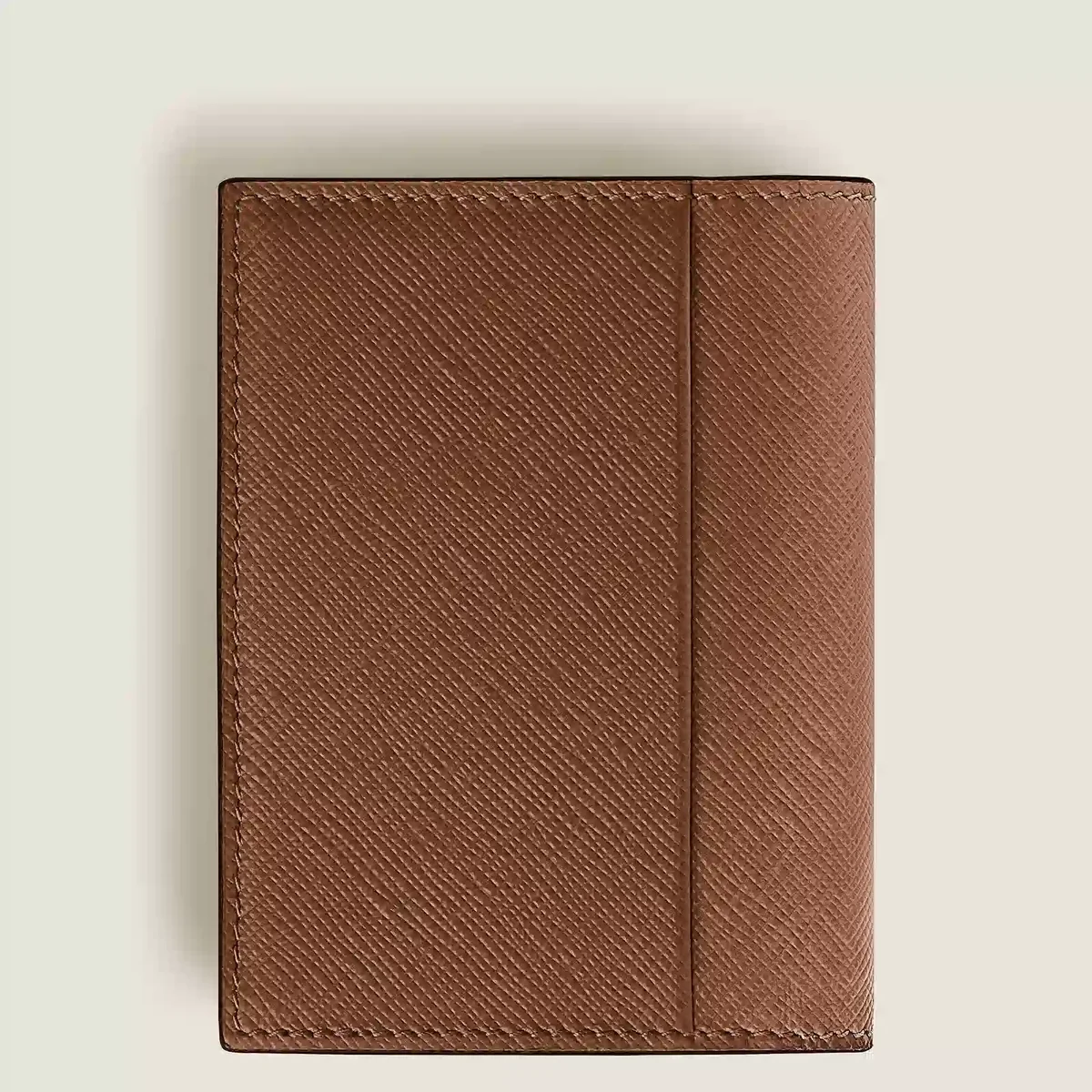 Dieser kompakte und dennoch vielseitige Kartenhalter ist aus geprägtem, eleganten Leder in einer eleganten fauve Farbe gefertigt. Er ist innen und außen mit funktionalen Details ausgestattet und verfügt über drei Kreditkartenfächer, ein Visitenkartenfach und eine zusätzliche Tasche im Inneren, während die Außenseite ein zusätzliches Fach für eine vierte Kreditkarte bietet.