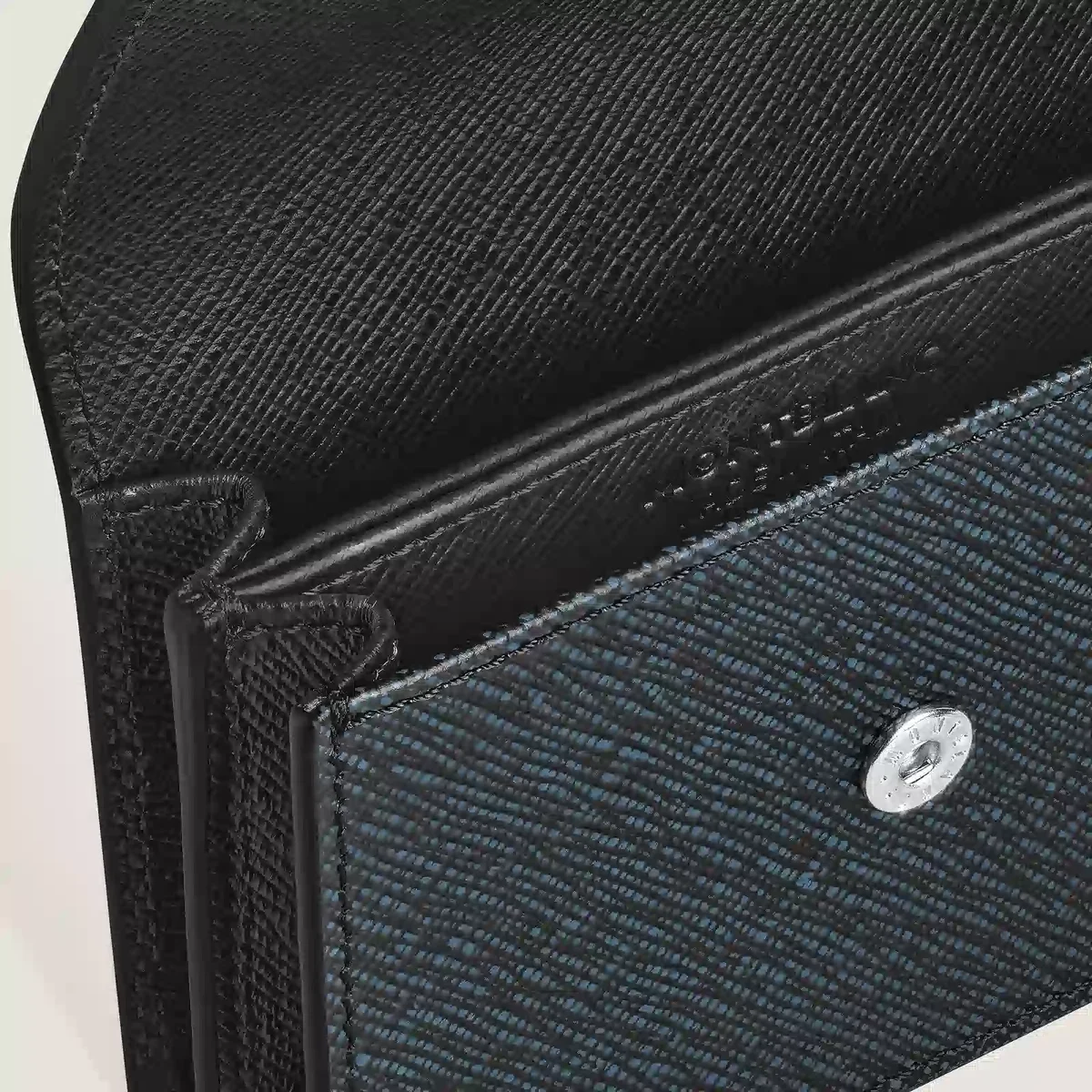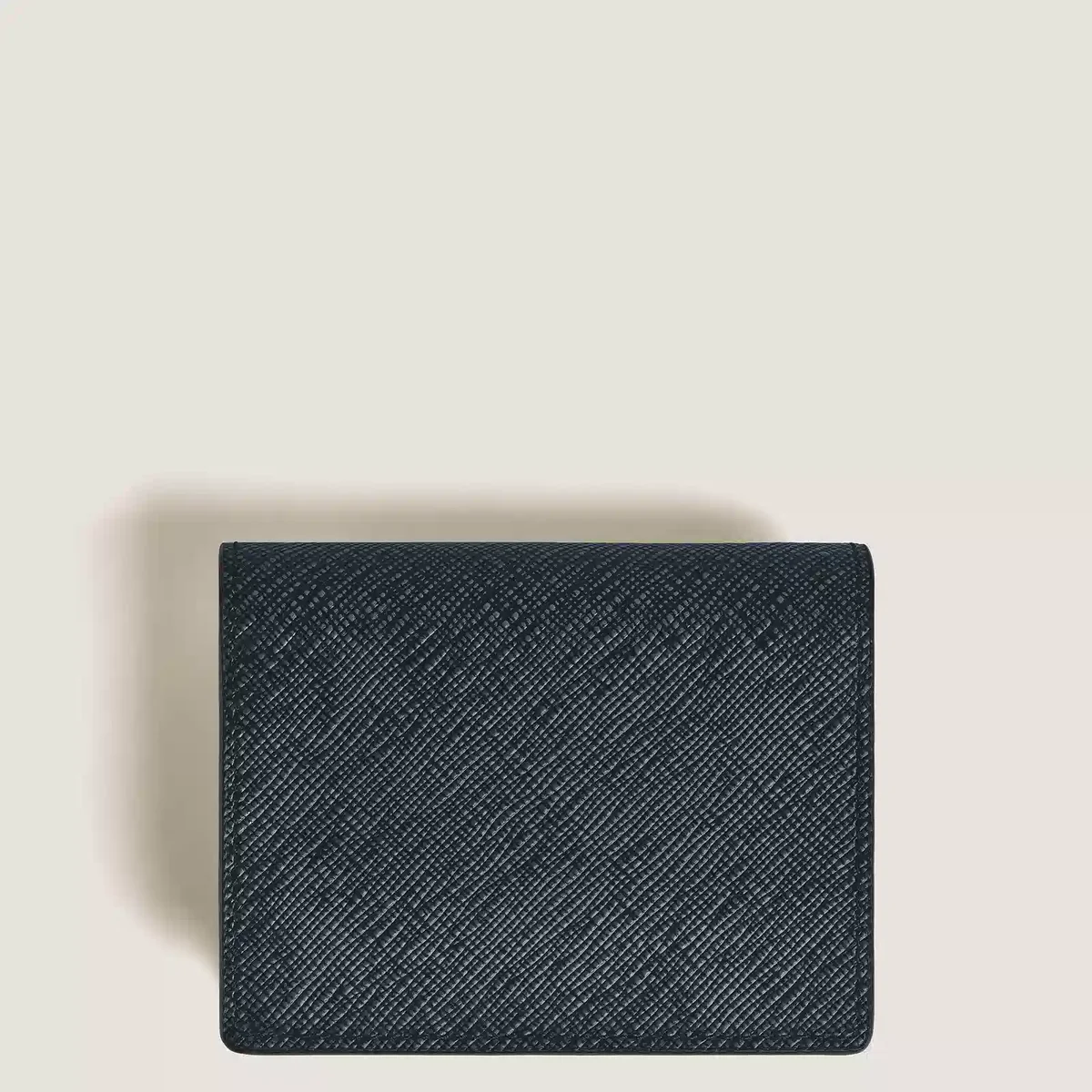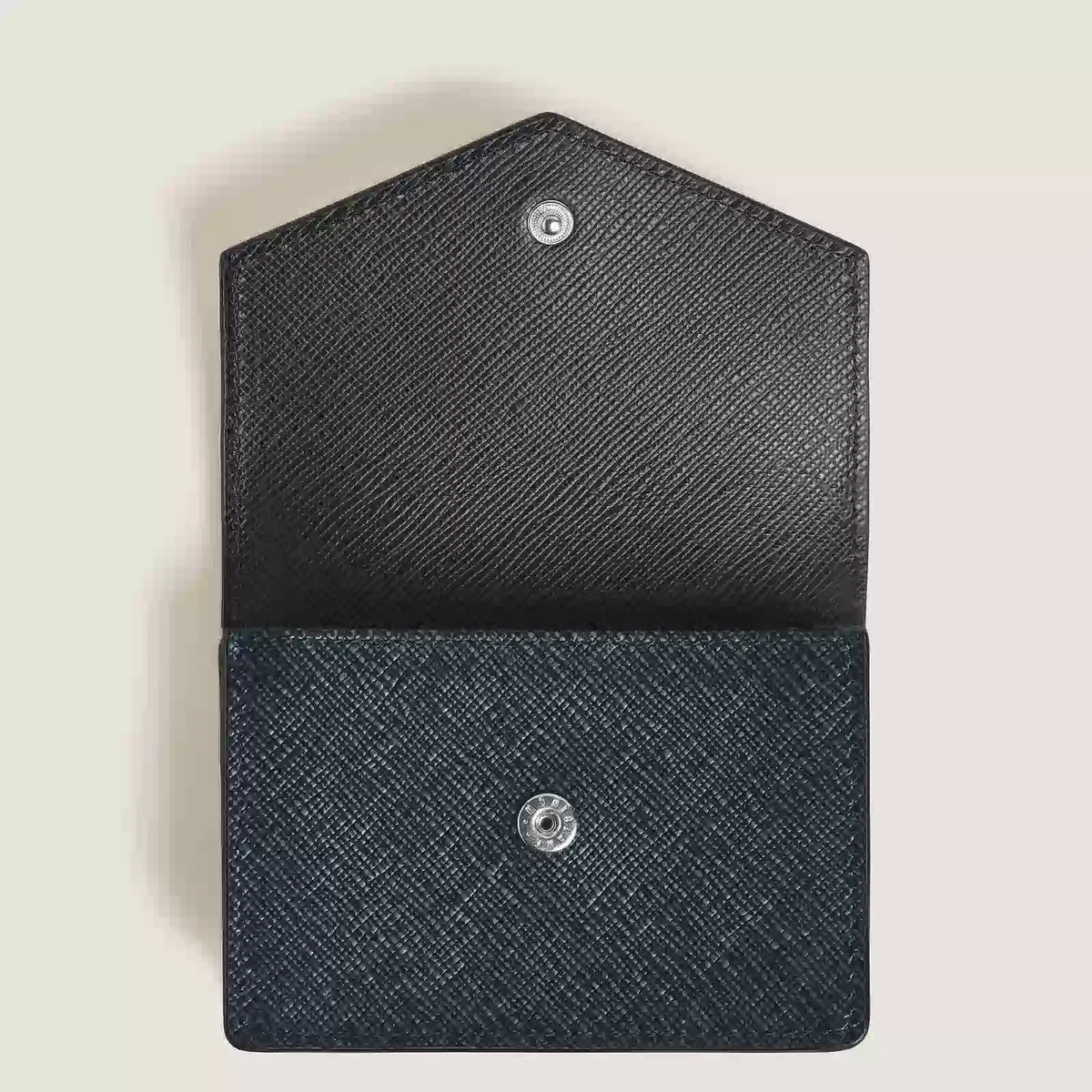Dieser elegante Kartenhalter wurde für alle entwickelt, die einen minimalistischen und funktionalen Stil schätzen. Er ist aus geprägtem Sartorial-Leder in einer raffinierten zweifarbigen Kombination aus edlem Blau und Schwarz gefertigt. Sein elegantes Design verfügt über einen Klappenverschluss mit Druckknopf, der Ihre Karten sicher aufbewahrt. Im Inneren bietet er zwei Fächer und eine zusätzliche Tasche, die reichlich Platz für Ihre wichtigsten Karten und ein paar Extras bieten.