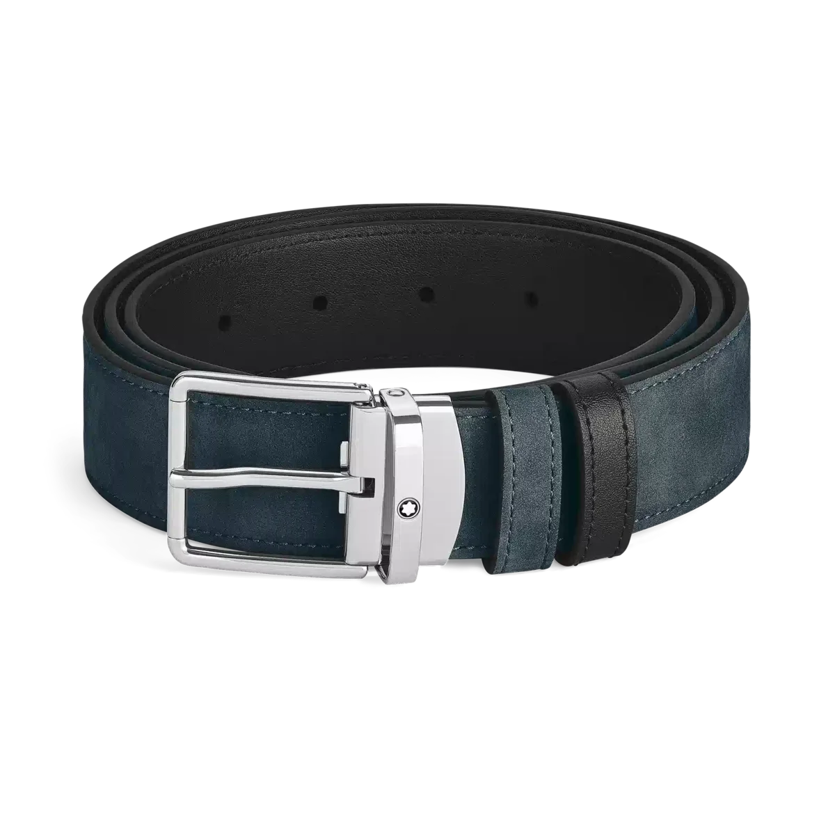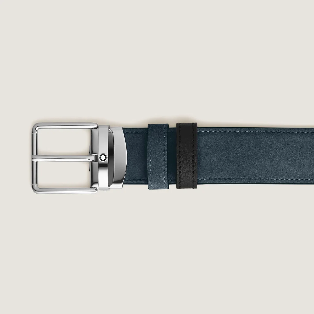 Dieser 35 mm breite Wendegürtel aus Leder verbindet nahtlos Funktionalität und Eleganz. Während die eine Seite mit ihrem weichen, samtigen blauen Wildleder einen lässigen Look vermittelt, präsentiert sich die Rückseite mit klassischem, weichem schwarzem Leder für einen eher traditionellen Look. Die Everyday-Schnalle mit ihrer schlanken, rechteckigen Silhouette ist aus schwarzem, gummiertem PVD gefertigt und verfügt über klare Kanten und ein dezentes Montblanc Logo an der Basis.