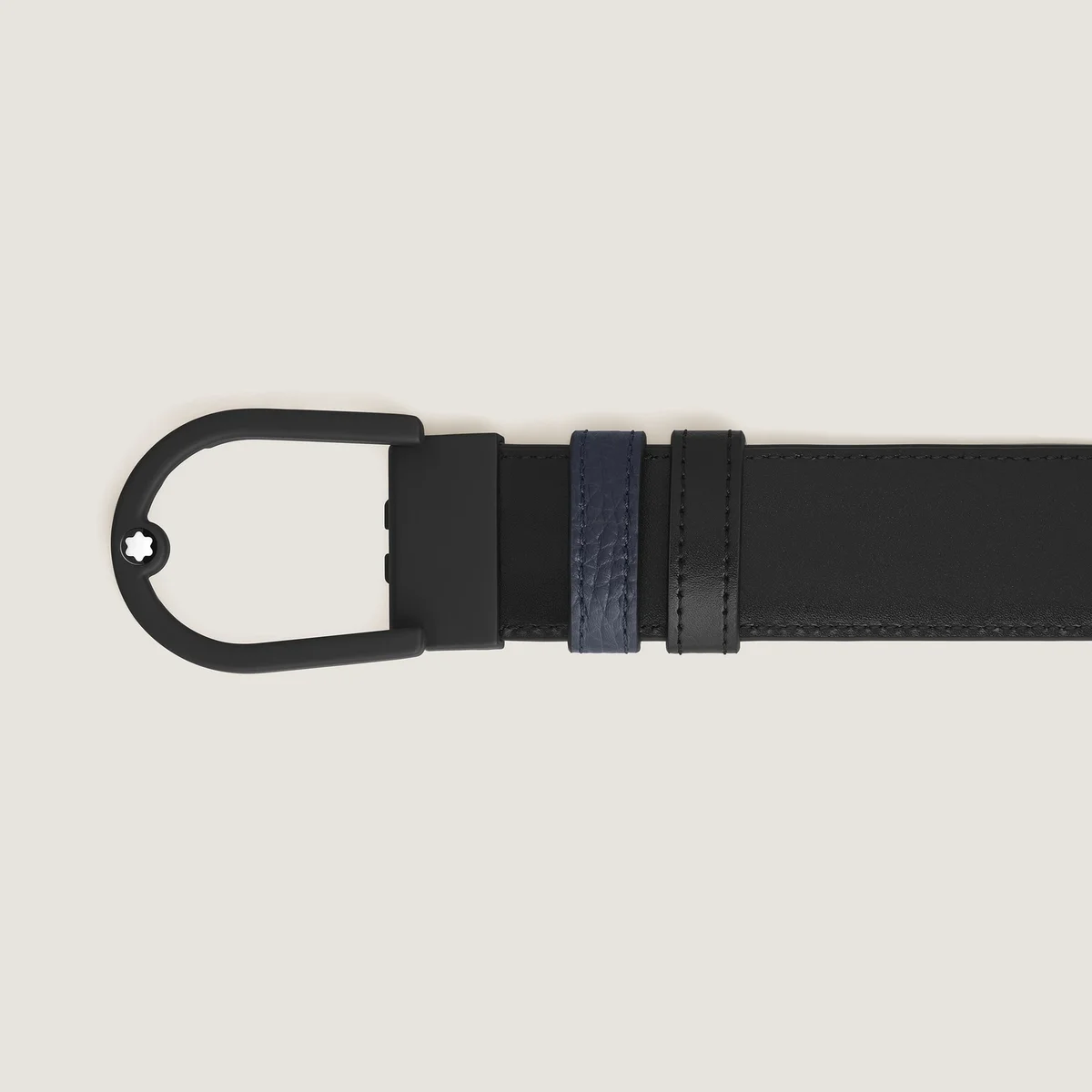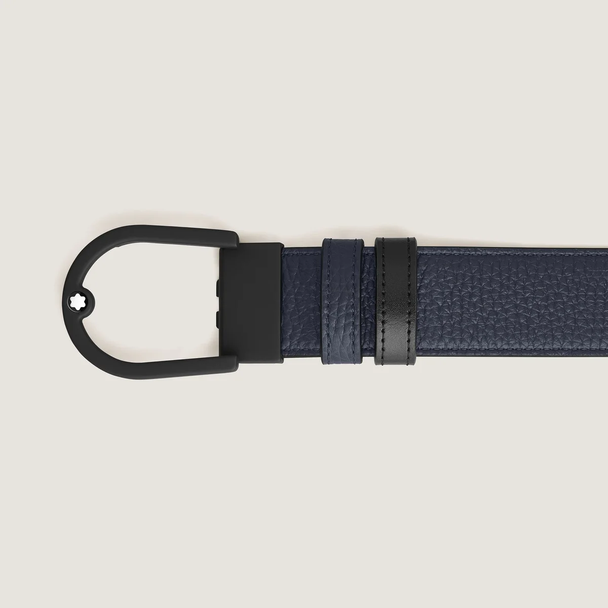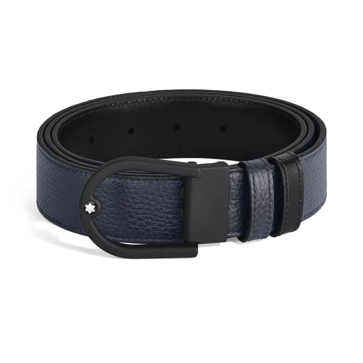 Dieser wendbare 35-mm-Gürtel kombiniert die elegante Silhouette einer gummierten PVD-beschichteten Schnalle mit der Vielseitigkeit zweier unterschiedlicher Lederriemen. Mit ihren klaren und geschwungenen Linien verleiht die Hufeisenschnalle Ihrem Stil einen Hauch von moderner Eleganz. Der Gürtelriemen bietet Vielseitigkeit und raffinierten Stil und vereint zwei unterschiedliche Looks in einem Accessoire: Während eine Seite genarbtes Leder in einem tiefen Mitternachtsblau präsentiert, verfügt die Rückseite über elegantes schwarzes Meisterstück-Leder für ein zeitloses, poliertes Finish.