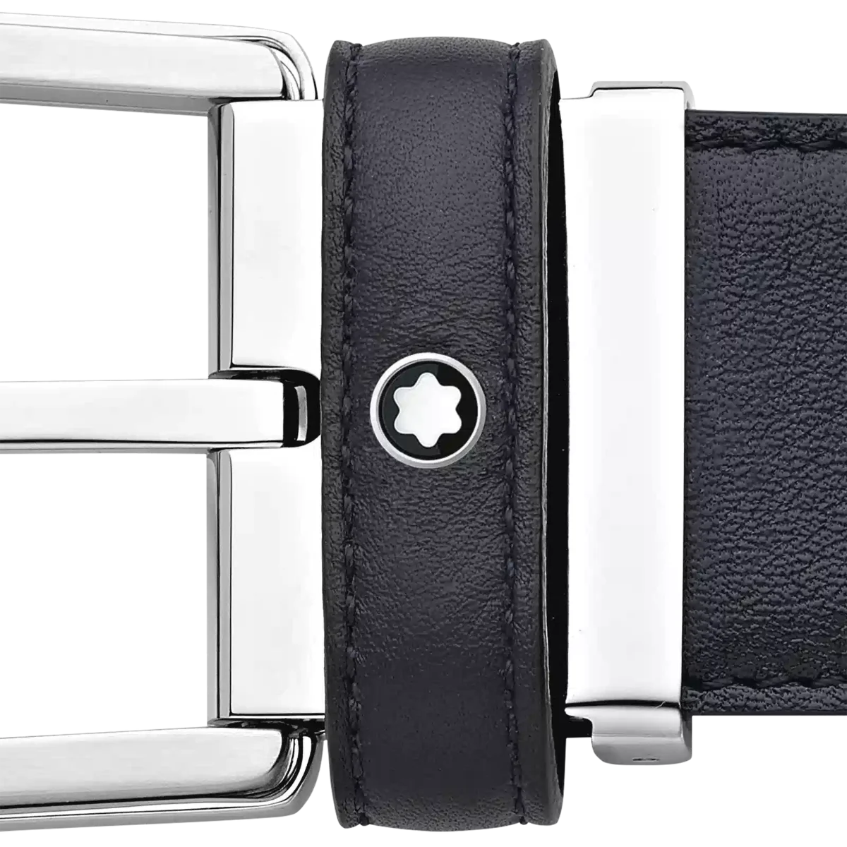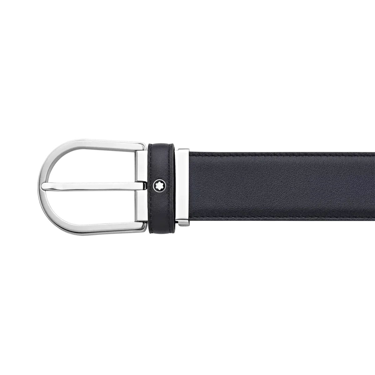 Entdecken Sie alle Details des blauen 35-mm-Ledergürtels mit Hufeisen-Schnalle. Kaufen Sie online im offiziellen Montblanc Store.