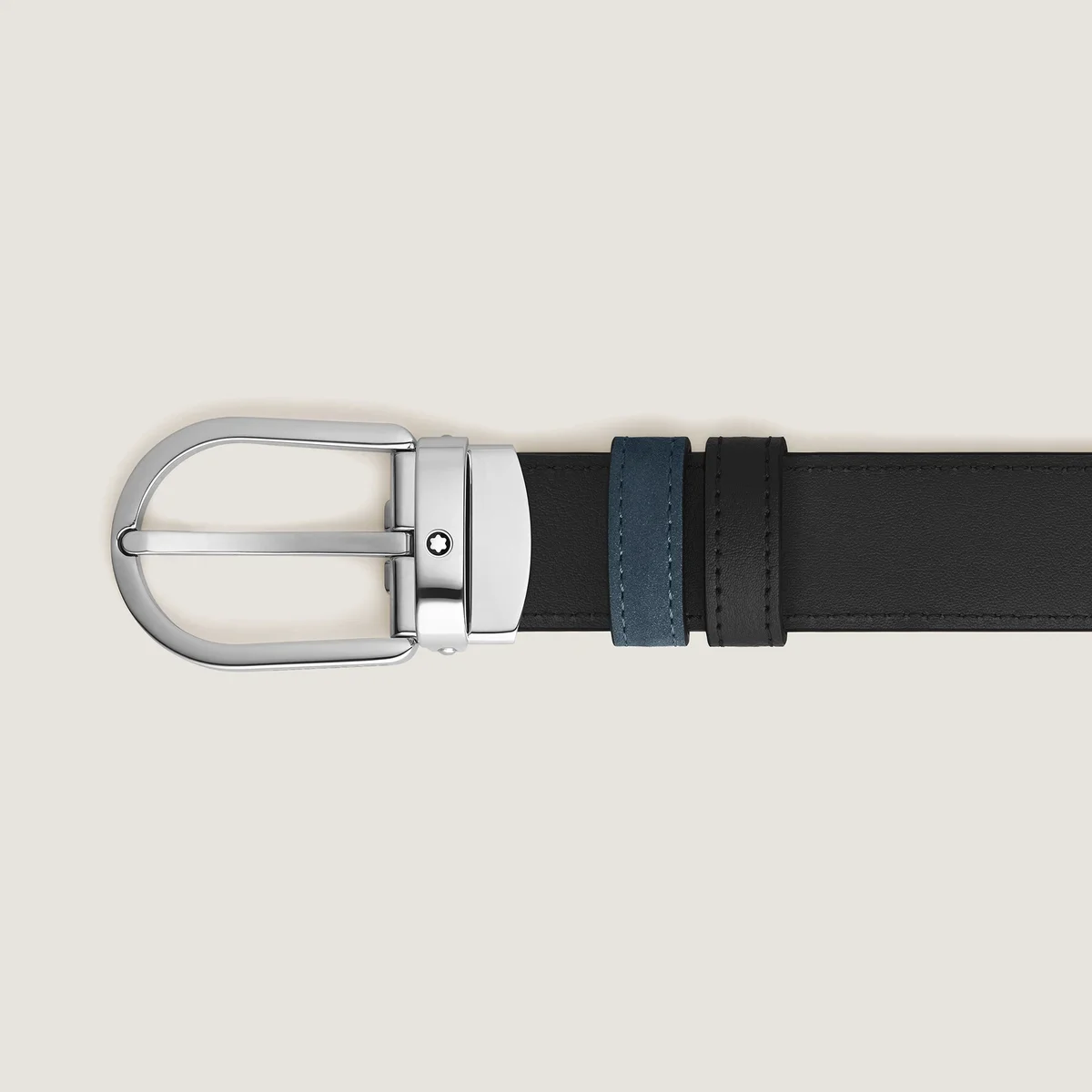Mit weichem, samtblauem Wildleder auf der einen Seite und glattem schwarzem Leder auf der anderen Seite bietet dieser wendbare 30-mm-Gürtel doppelt so viel Stil. Die Hufeisenschnalle mit glänzendem Palladium-Finish verleiht ihm einen zeitlosen Look, der durch das Montblanc-Emblem abgerundet wird.