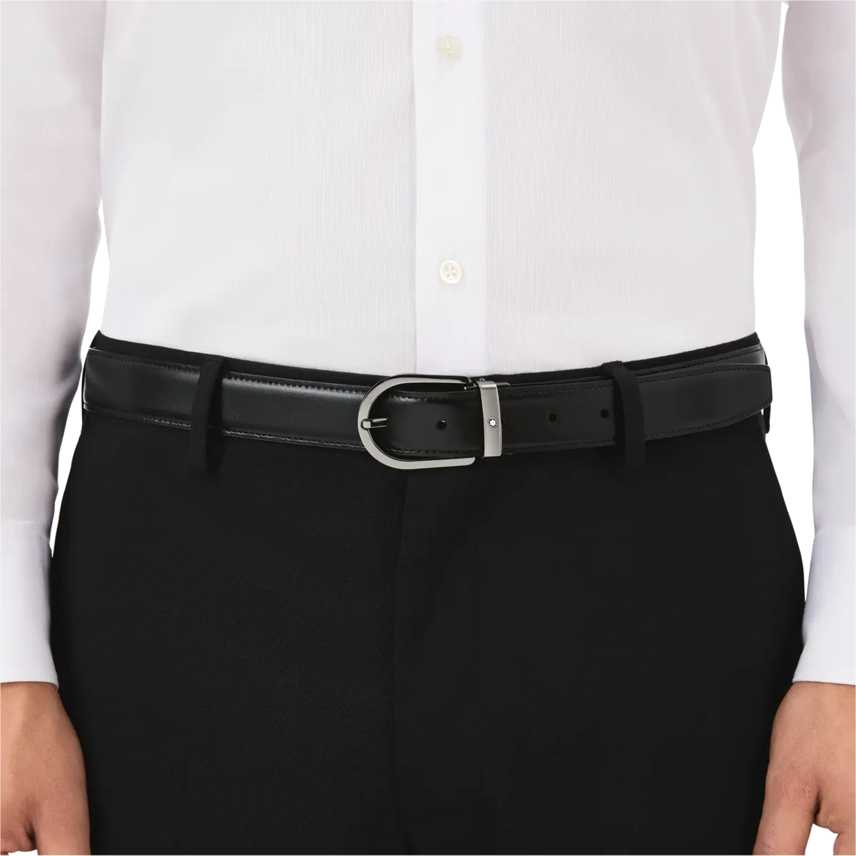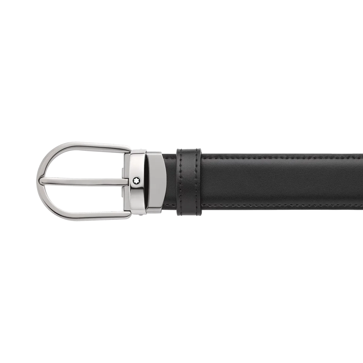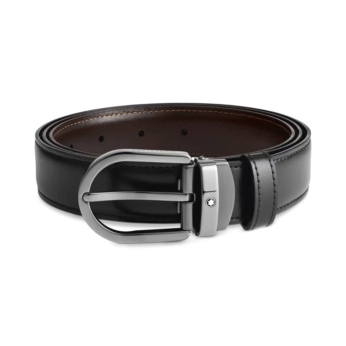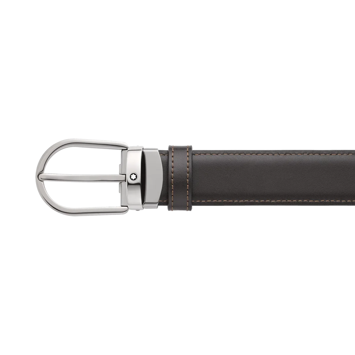 Hufeisenförmige Schnalle mit glänzender Ruthenium-Oberfläche. Selbstverstellbarer, 3 cm x 120 cm großer, wendbarer Lederriemen in Schwarz und Braun. Für einen klassischen Look mit dem gewissen Etwas.