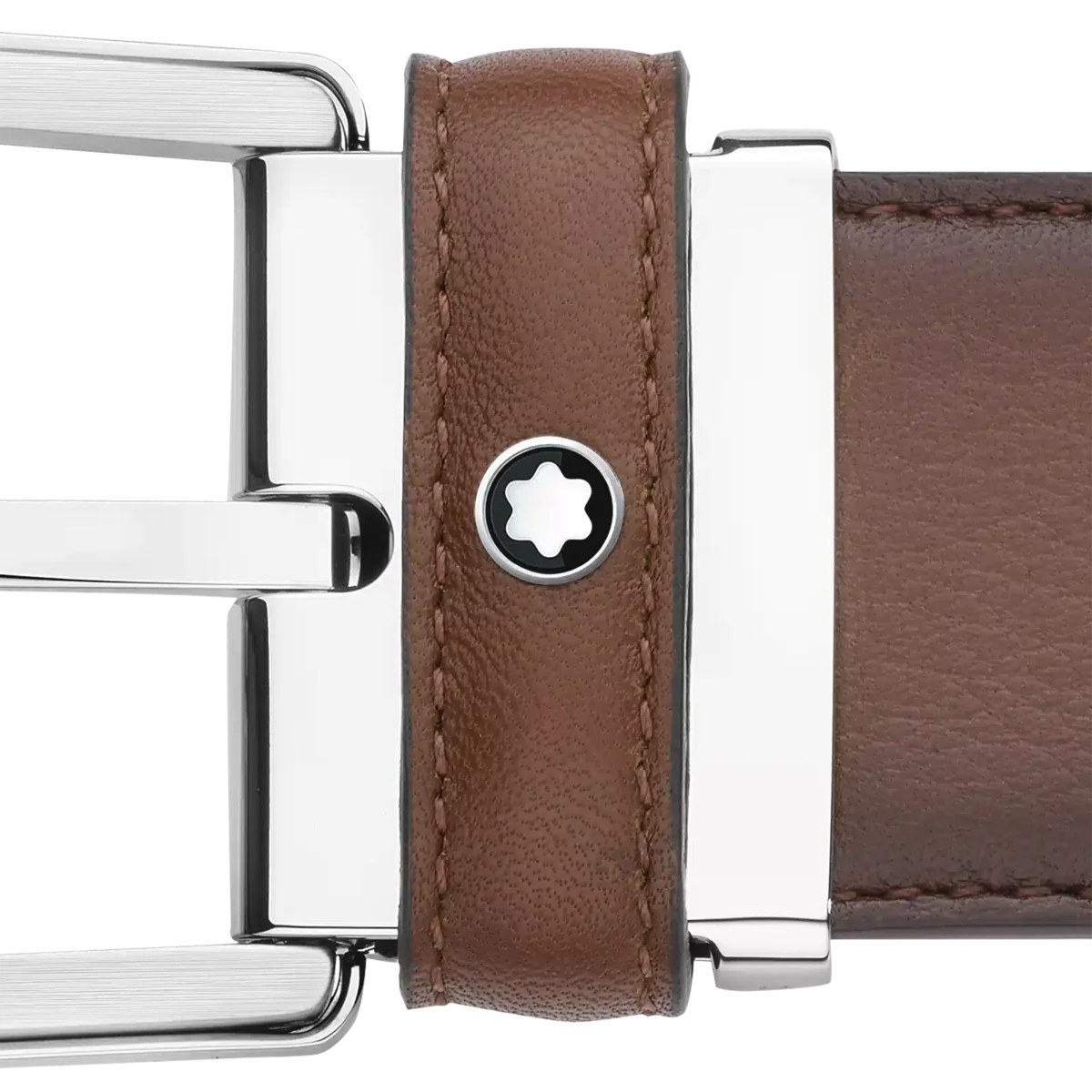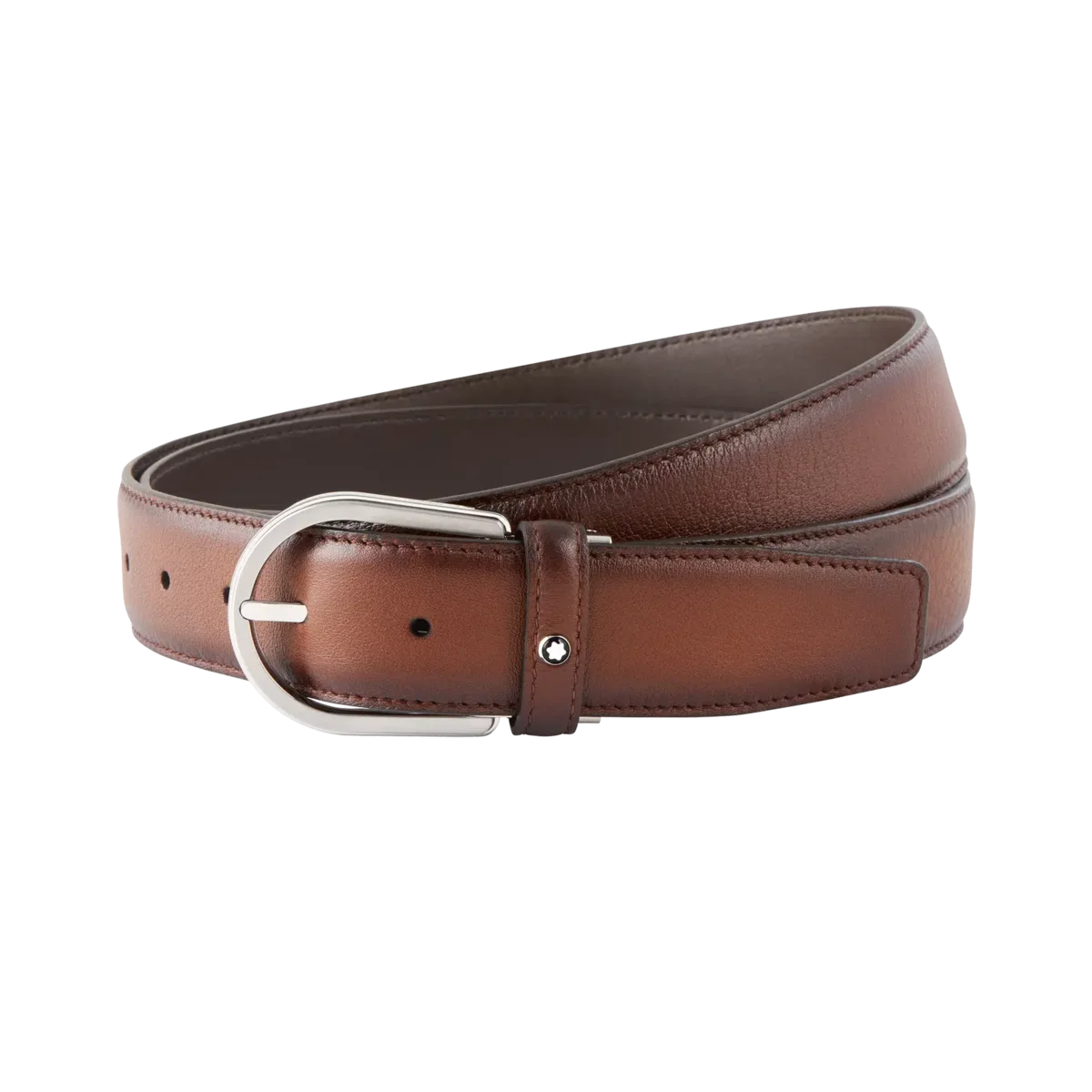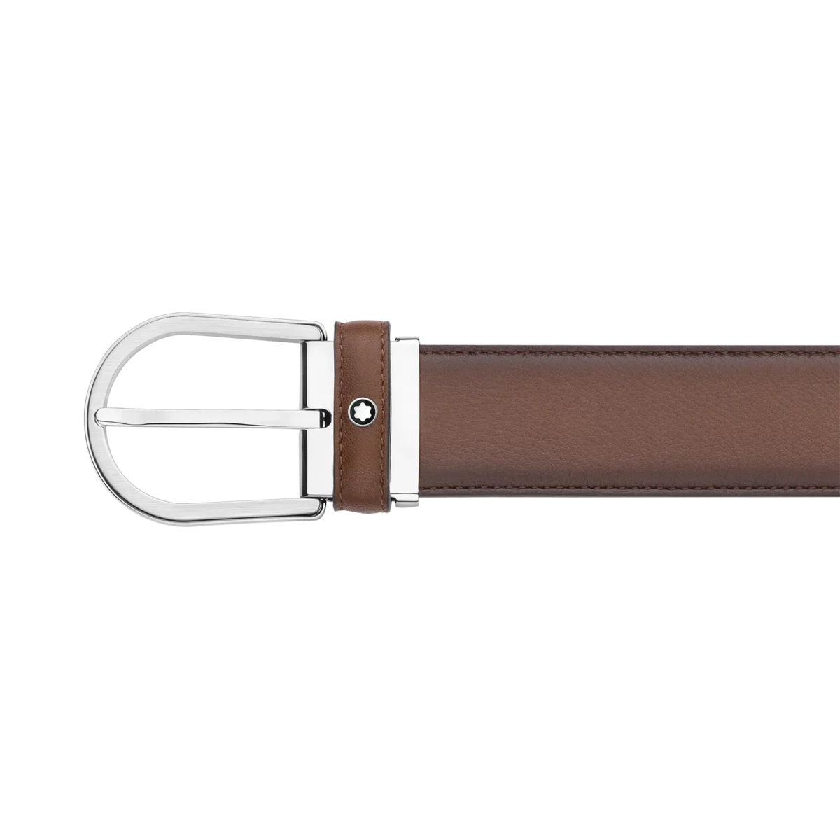 Entdecken Sie alle Details des braunen 35-mm-Ledergürtels mit Hufeisen-Schnalle. Kaufen Sie online im offiziellen Montblanc Store.