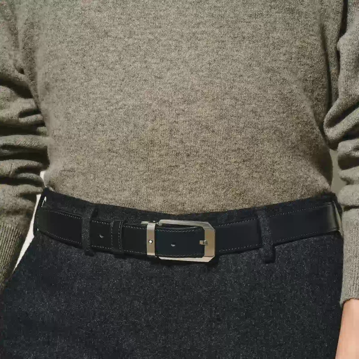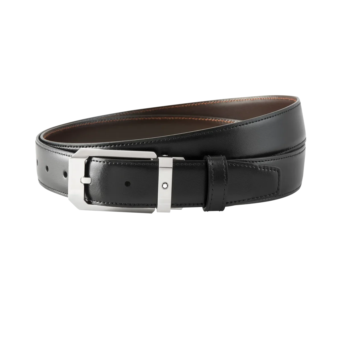 Rechteckige, glänzende Dornschließe aus Edelstahl. Selbstverstellbarer, 3 cm x 120 cm langer, wendbarer Lederriemen in Schwarz und Braun, passend zu jedem Business-Anzug. Dieses raffinierte und zurückhaltende, zeitlose Modell wird Kunden zufriedenstellen, die einen klassischen Business-Gürtel suchen.