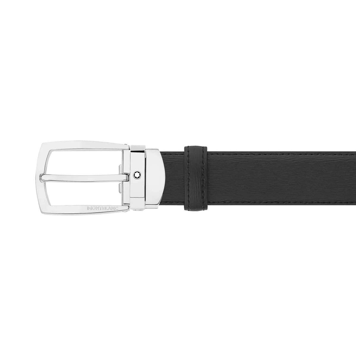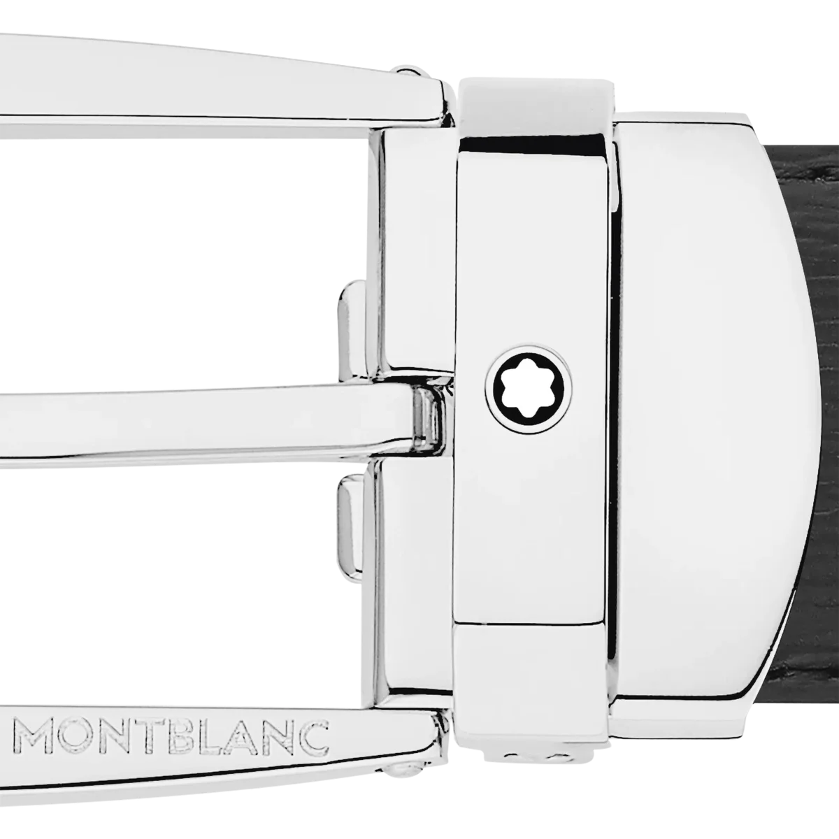 Trapezförmige, glänzende Dornschließe aus Edelstahl mit Ruthenium-PVD-Beschichtung. Selbstverstellbarer, 3 cm x 120 cm großer Riemen aus schwarzem Rindsleder mit exklusivem, dezentem Montblanc-Print, passend zur 4810 Westside Lederwaren-Kollektion. Mit der neuen gunmetal-farbenen Schnalle ist er der perfekte Gürtel für einen stilvollen Look.