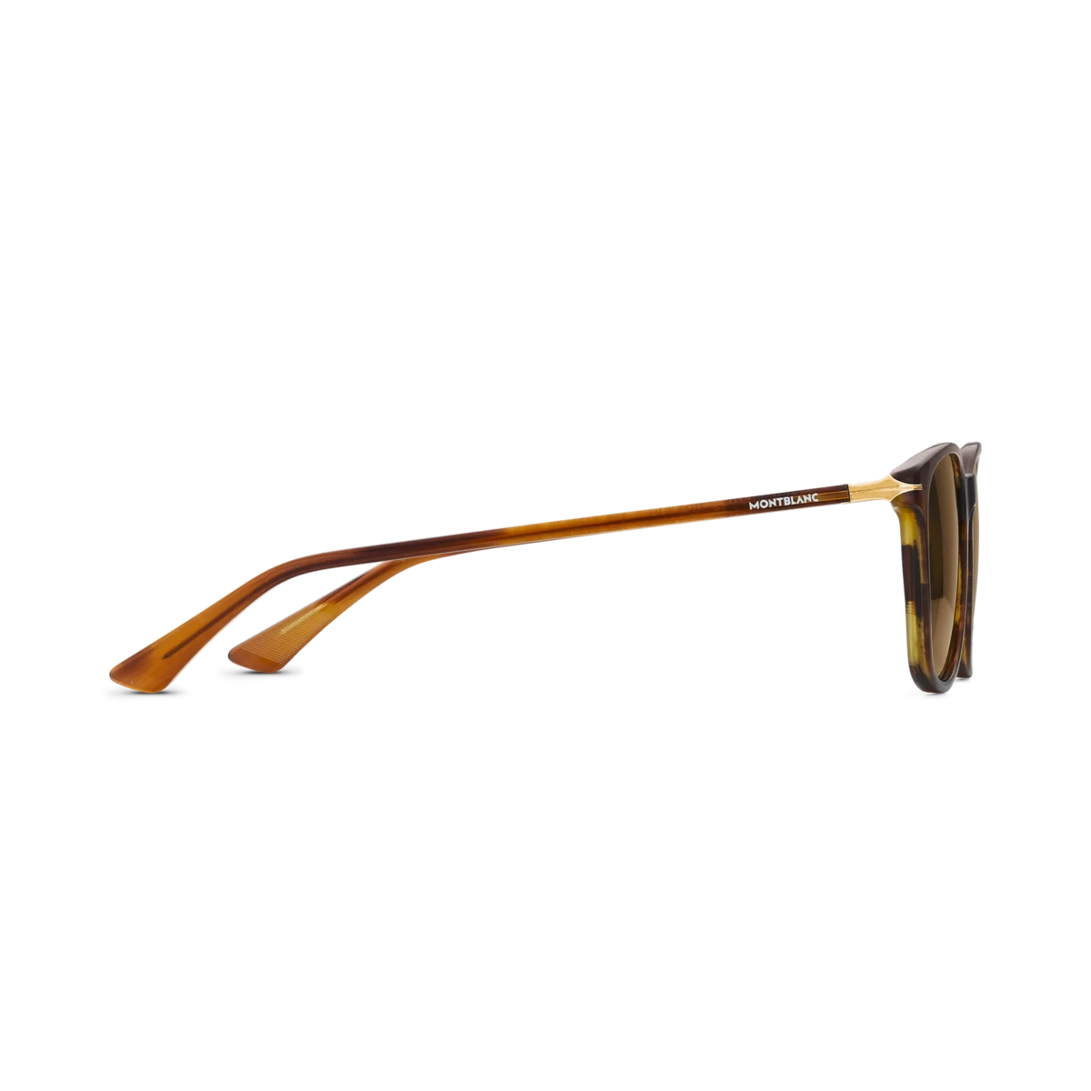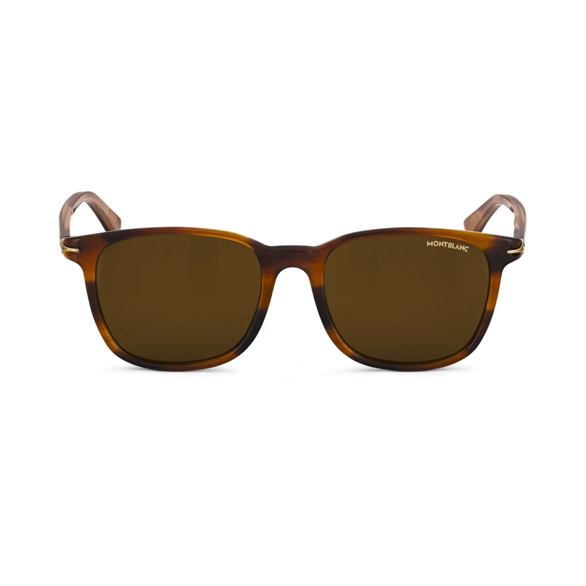 Diese quadratische Sonnenbrille verfügt über einen braunen Acetatrahmen und braune Gläser. Inspiriert vom Federkiel-Design der Schreibgeräte ziert ein dekoratives Federkiel-Detail das Acetat-Bügeldesign. Das Montblanc Logo ist auf das linke Glas gelasert.