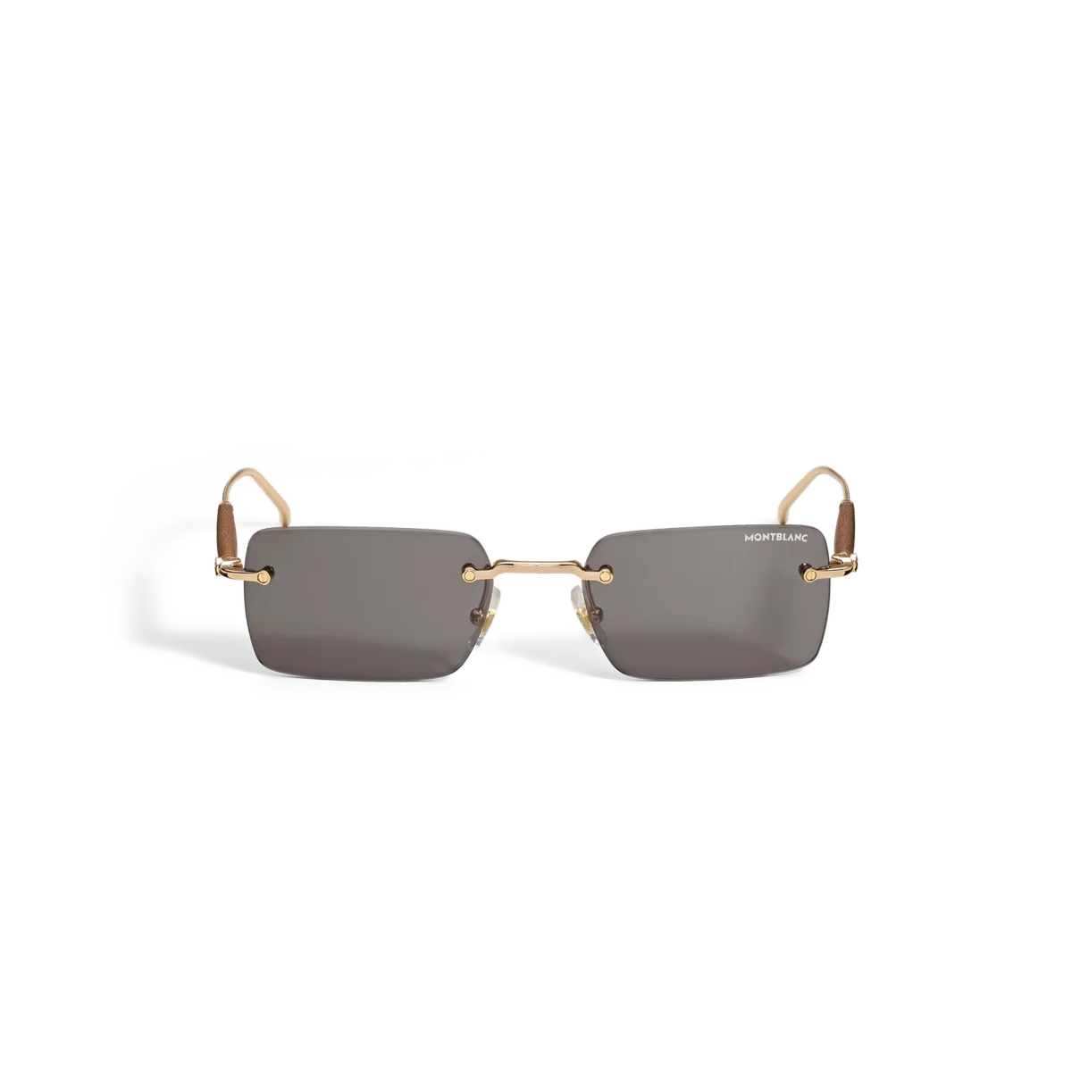 Diese randlose Sonnenbrille im eckigen Stil hat einen goldfarbenen Metallrahmen und graue Gläser. Die runden Bügel sind mit dem Montblanc Emblem verziert und mit einem Holzelement versehen. Das Montblanc Logo ist auf das linke Glas der Sonnenbrille gelasert.