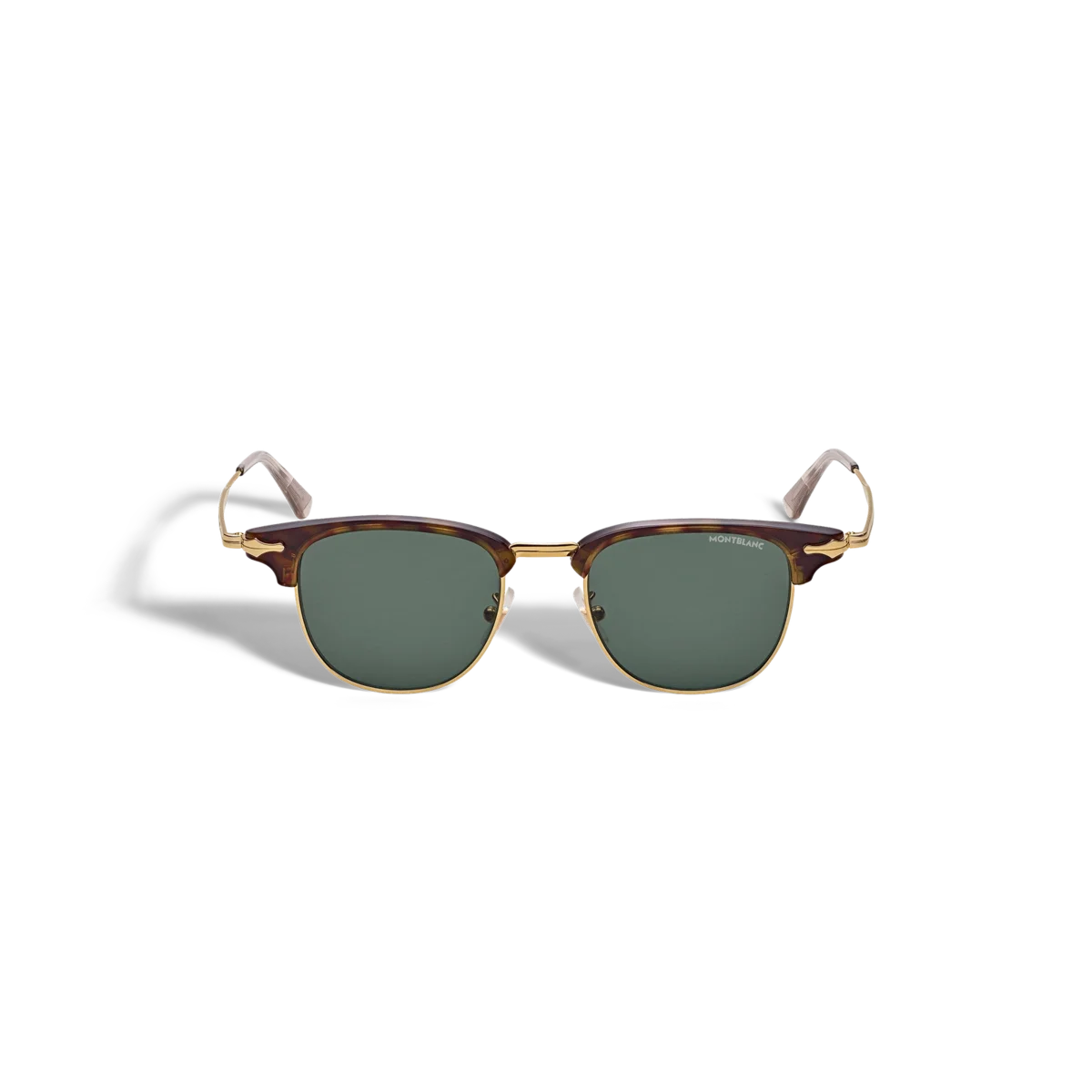 Diese Sonnenbrille im rechteckigen Stil hat einen goldfarbenen Metallrahmen und grüne Gläser. Inspiriert vom Federkiel-Design der Schreibgeräte ziert ein dekoratives Federkiel-Detail das Metallbügel-Design. Das Montblanc Logo ist auf die linke Linse gelasert und das Anti-Rutsch-Muster ist auf die Innenseite der Bügelenden gelasert, um den Tragekomfort zu erhöhen.