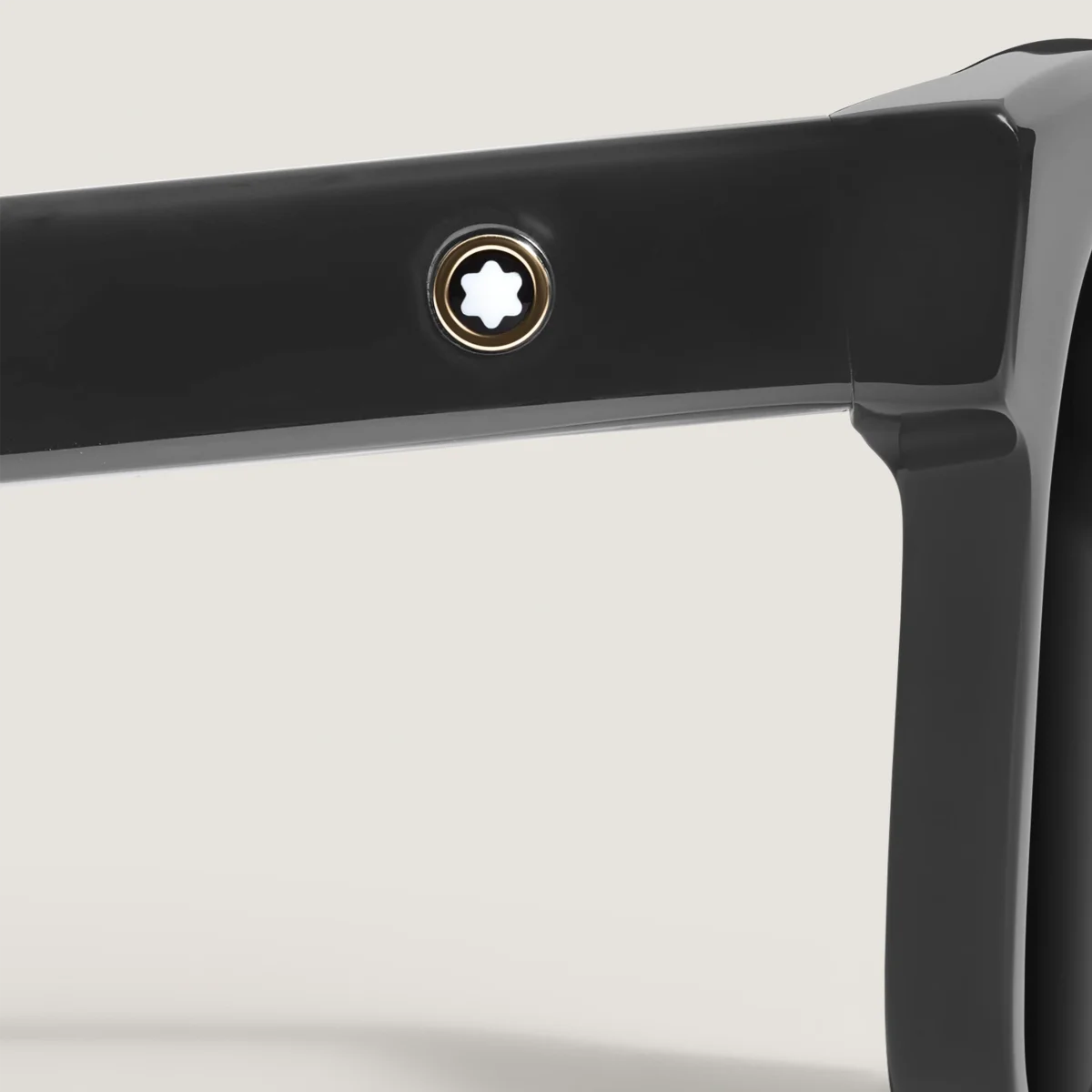 Diese Sonnenbrille im eckigen Stil hat einen schwarzen Acetatrahmen und graue Gläser. Die Nieten auf der Vorderseite sind mit einem Schneekappen-Detail verziert, und das Montblanc Extreme 3.0-Muster ist in das Design der Innenseite der Bügel integriert. Das Montblanc Emblem ist in das Bügeldesign integriert. Das Montblanc Logo ist auf das linke Glas gelasert und die Innenseite der Bügelenden ist mit einem rutschfesten Muster versehen, um den Tragekomfort zu erhöhen. Ident-Nr. MB135578