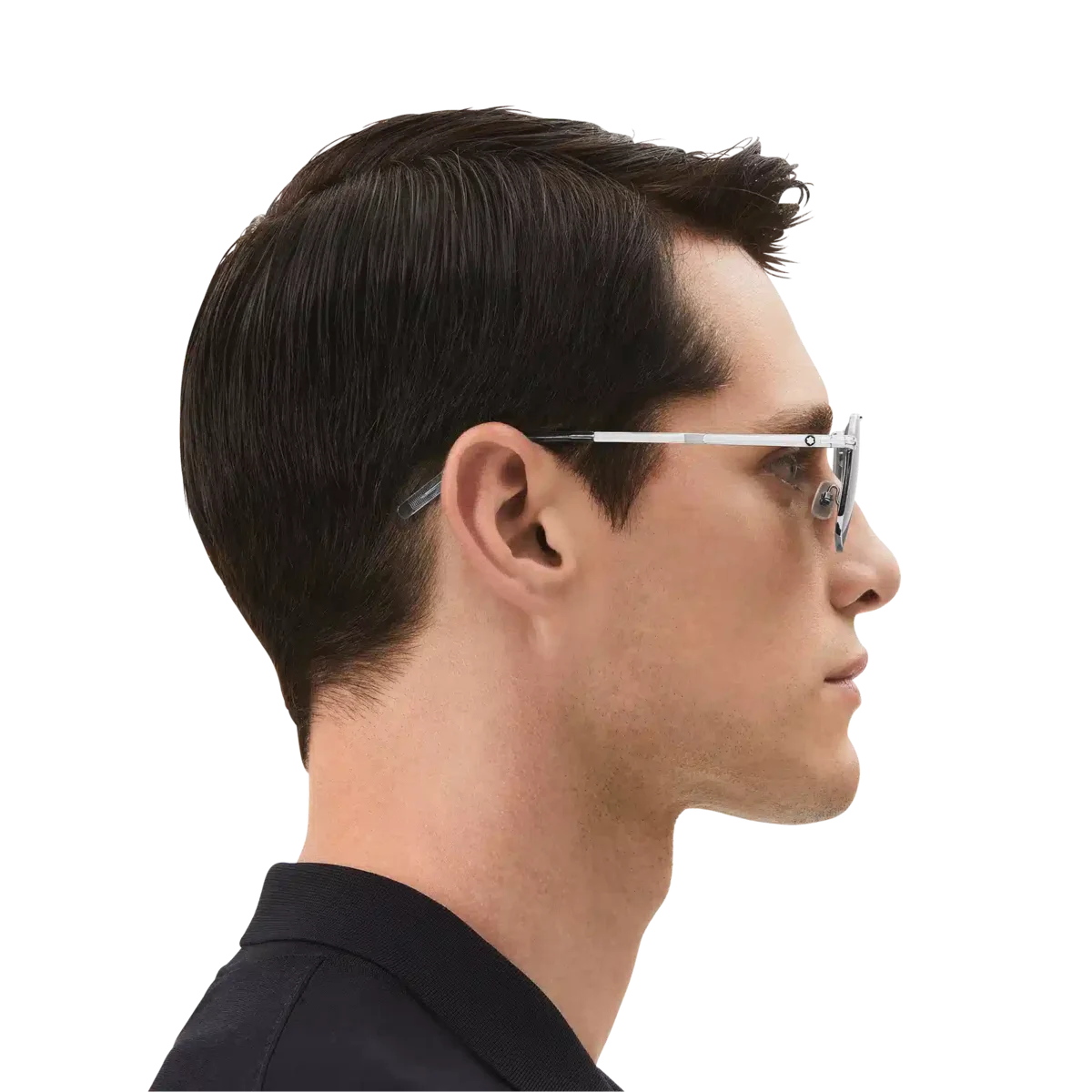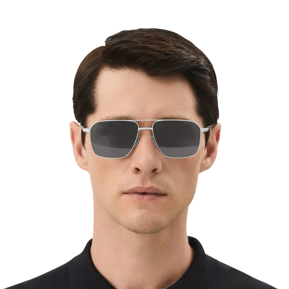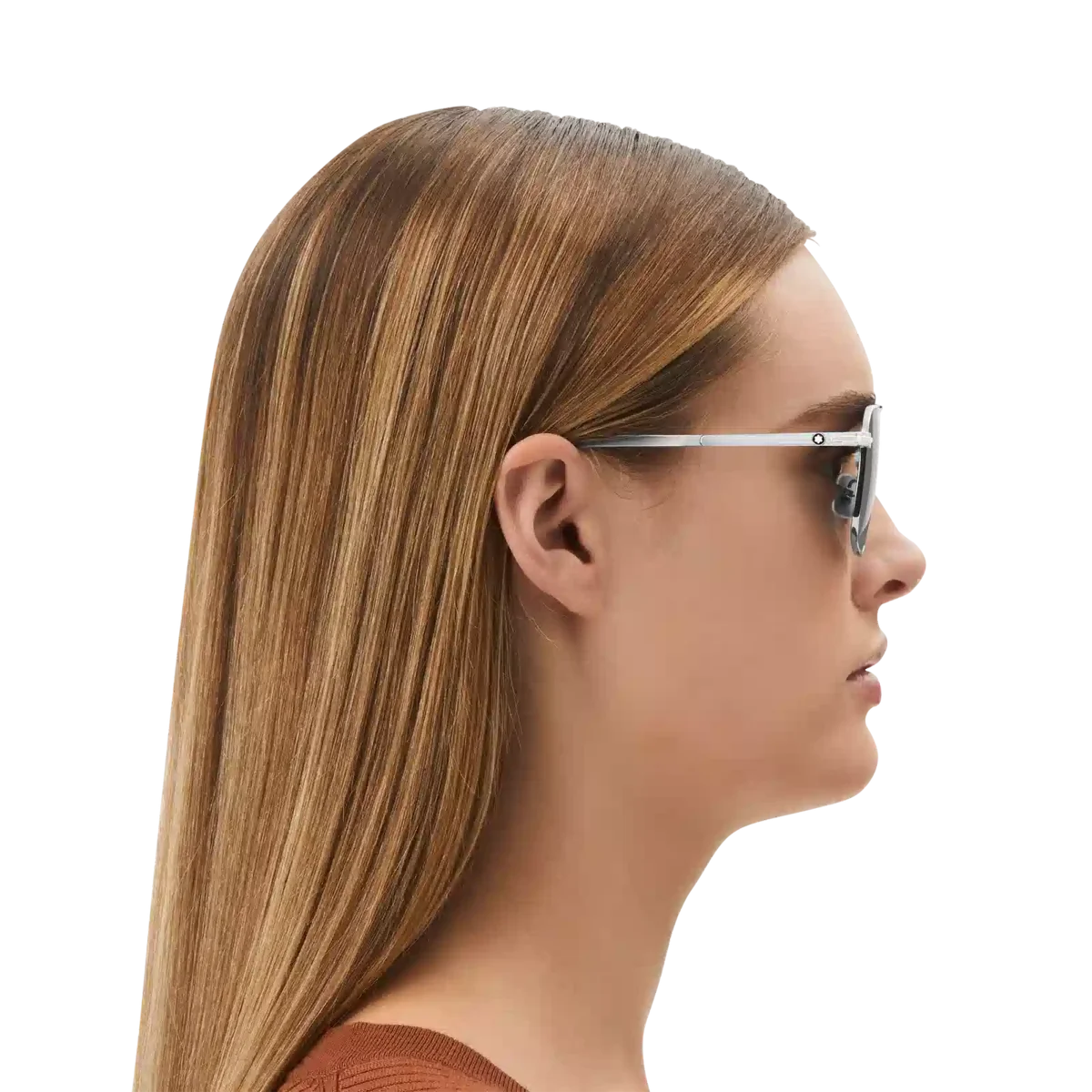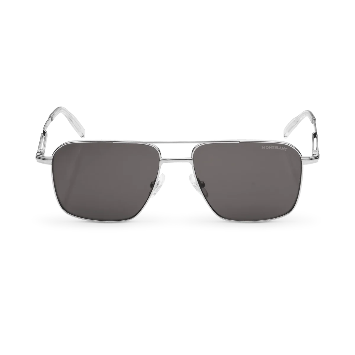 Diese Sonnenbrille im rechteckigen Stil hat einen silberfarbenen Metallrahmen und graue Gläser. Sie verfügt über einen doppelten Metallsteg auf der Vorderseite. Das silberfarbene Clip-Detail ist das Kernelement des Bügel-Designs. Es ist eine Hommage an ein wichtiges Element des Meisterstück-Schreibgeräts, mit dem der Rahmen auch an Taschen befestigt werden kann. Das schneebedeckte Montblanc Emblem ist in das Clip-Detail des Bügels eingearbeitet und das Montblanc Logo ist auf die linke Linse gelasert. Ident-Nr. MB131313