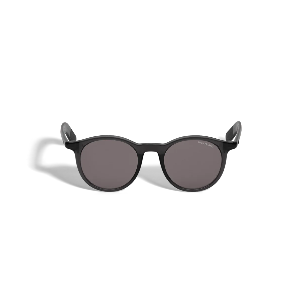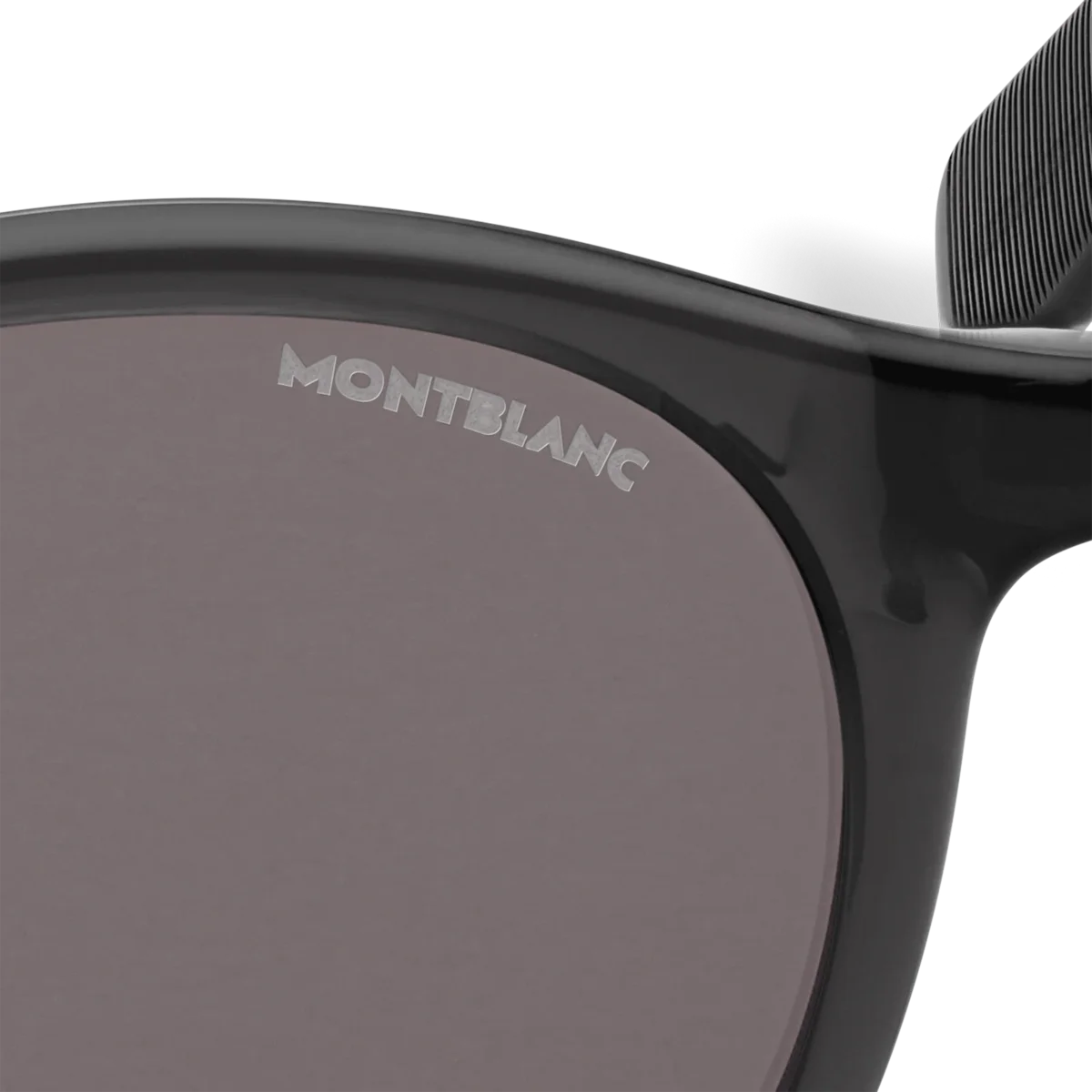 Diese Sonnenbrille im runden Stil hat einen schwarz gefärbten, eingespritzten Acetatrahmen und graue Gläser. Das Montblanc Emblem ist in das Bügeldesign eingearbeitet. Das Montblanc Logo ist auf das linke Brillenglas gelasert, und die Innenseite der Bügelenden ist mit einem rutschfesten Muster versehen, um den Tragekomfort zu erhöhen.