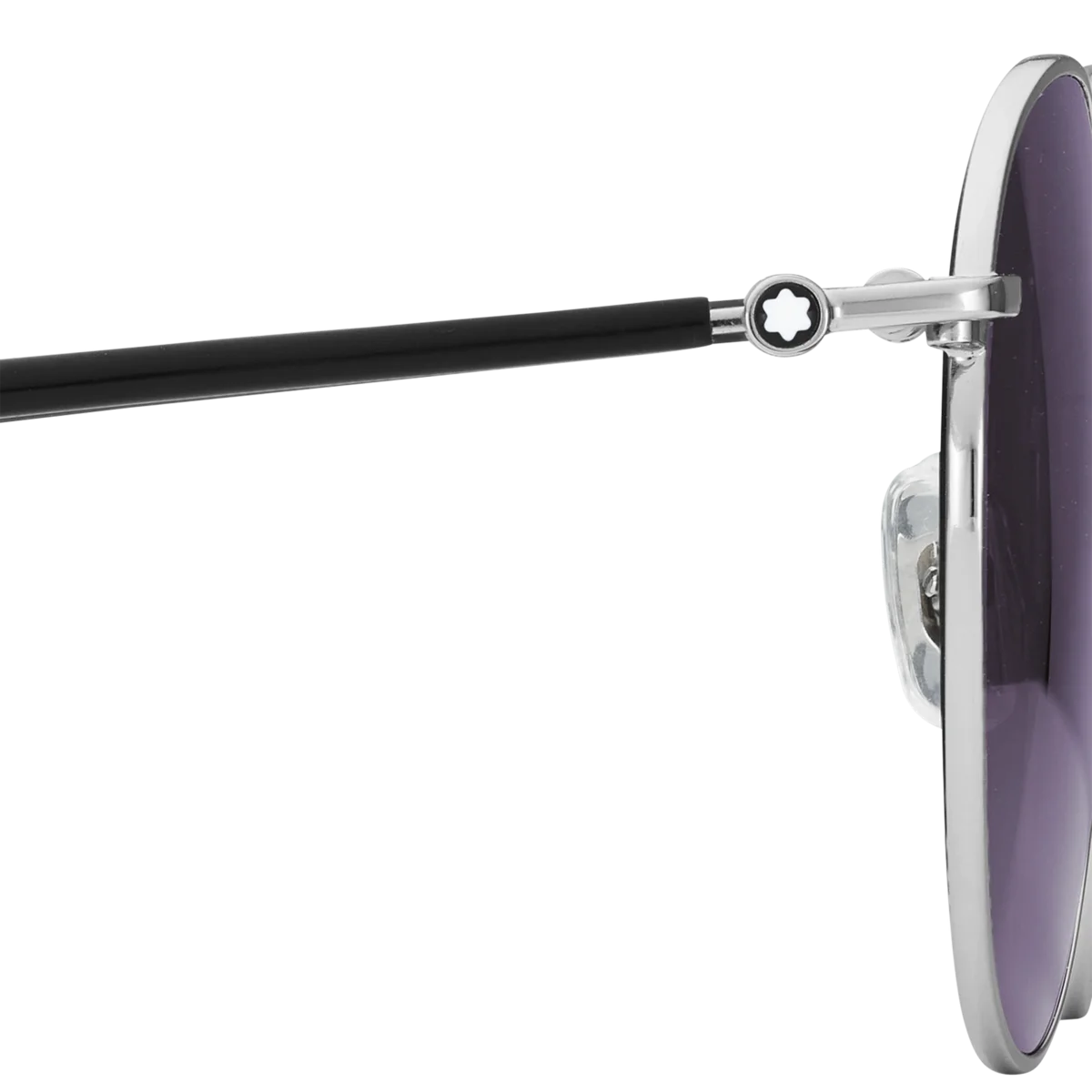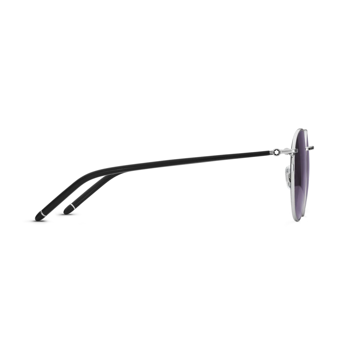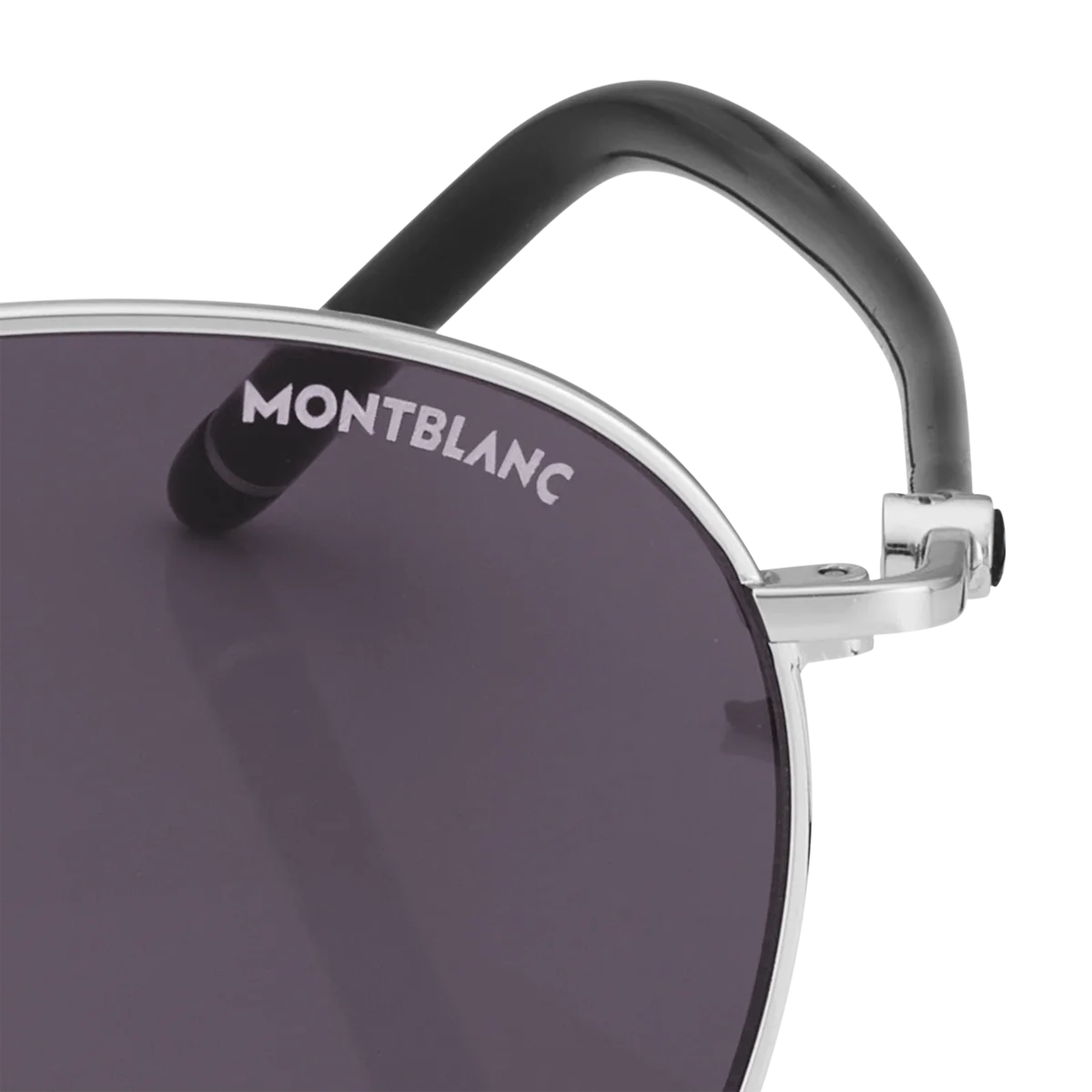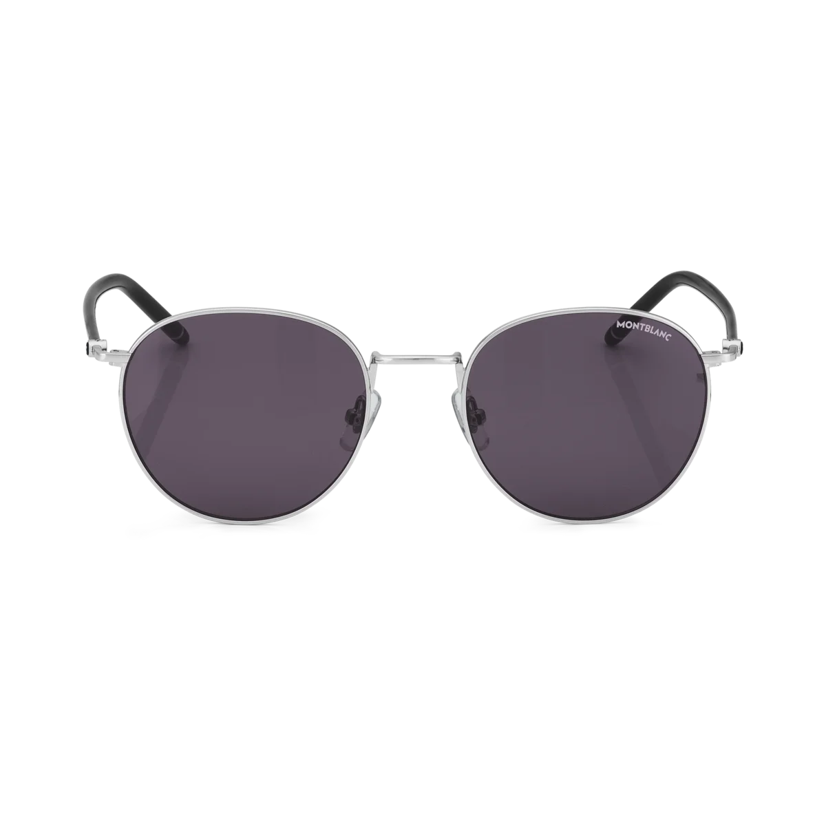 Diese runde Sonnenbrille verfügt über einen silberfarbenen Metallrahmen und graue Gläser. Die röhrenförmigen Bügel sind von den Meisterstück Schreibgeräten inspiriert und mit einem schwarzen Emaille-Detail an den Bügelenden verziert. Das Montblanc Logo ist auf das linke Glas gelasert und das Schneekappenlogo ist in die Bügel eingearbeitet.