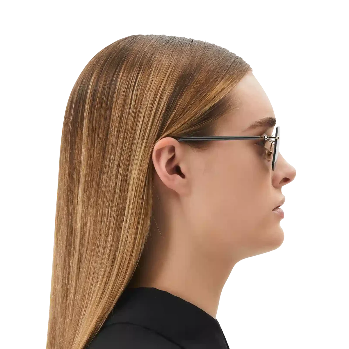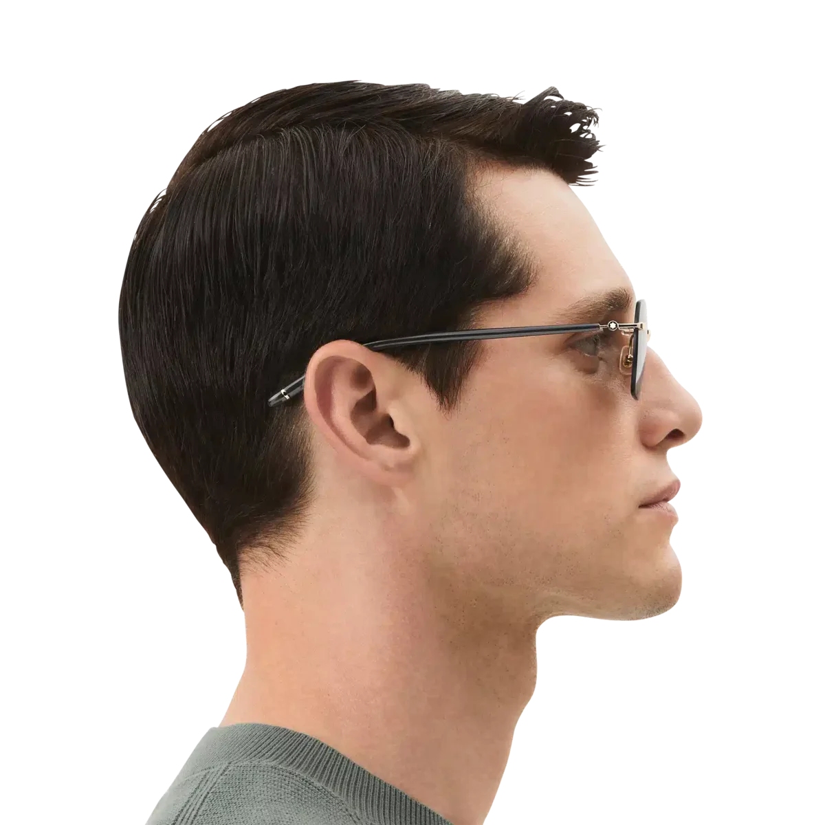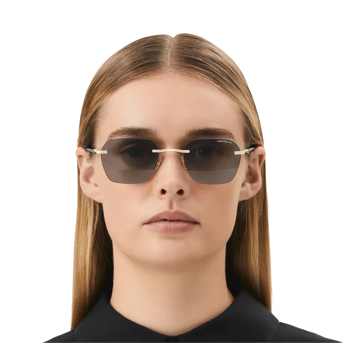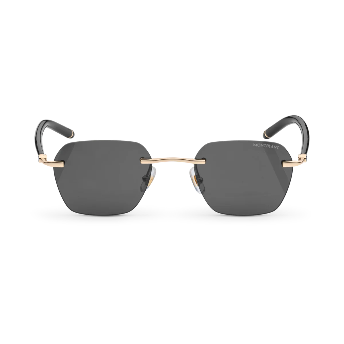 Diese leichte, randlose Sonnenbrille im eckigen Stil hat einen goldfarbenen Metallrahmen und graue Gläser. Der von den Meisterstück Schreibgeräten inspirierte Bügel ist mit einem 3-Ring-Detail verziert. Das Montblanc Logo ist auf das linke Glas gelasert und das Schneekappenlogo ist auf den Bügeln eingearbeitet. Das rutschfeste Muster ist auf die Innenseite der Bügelenden gelasert, um den Tragekomfort zu erhöhen.