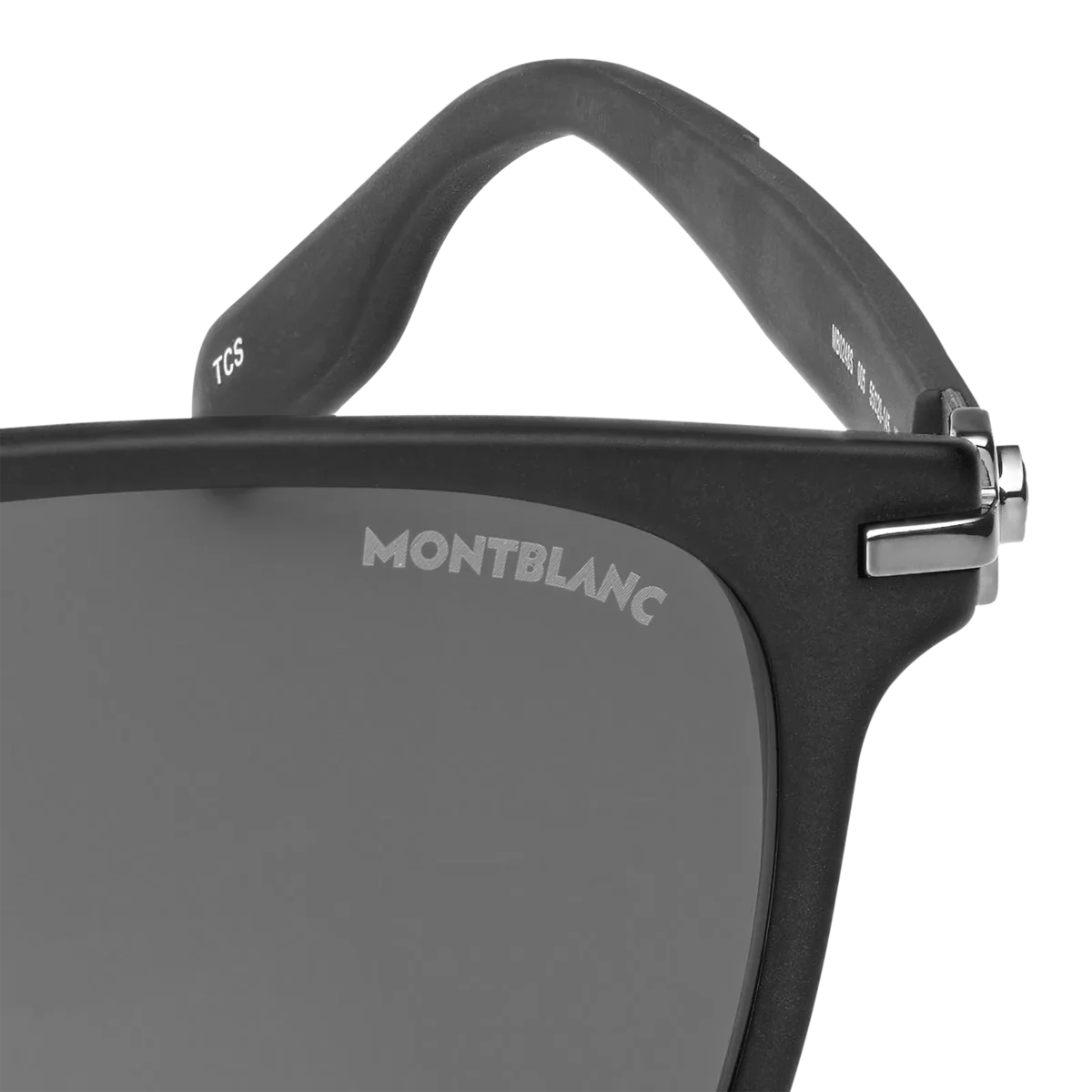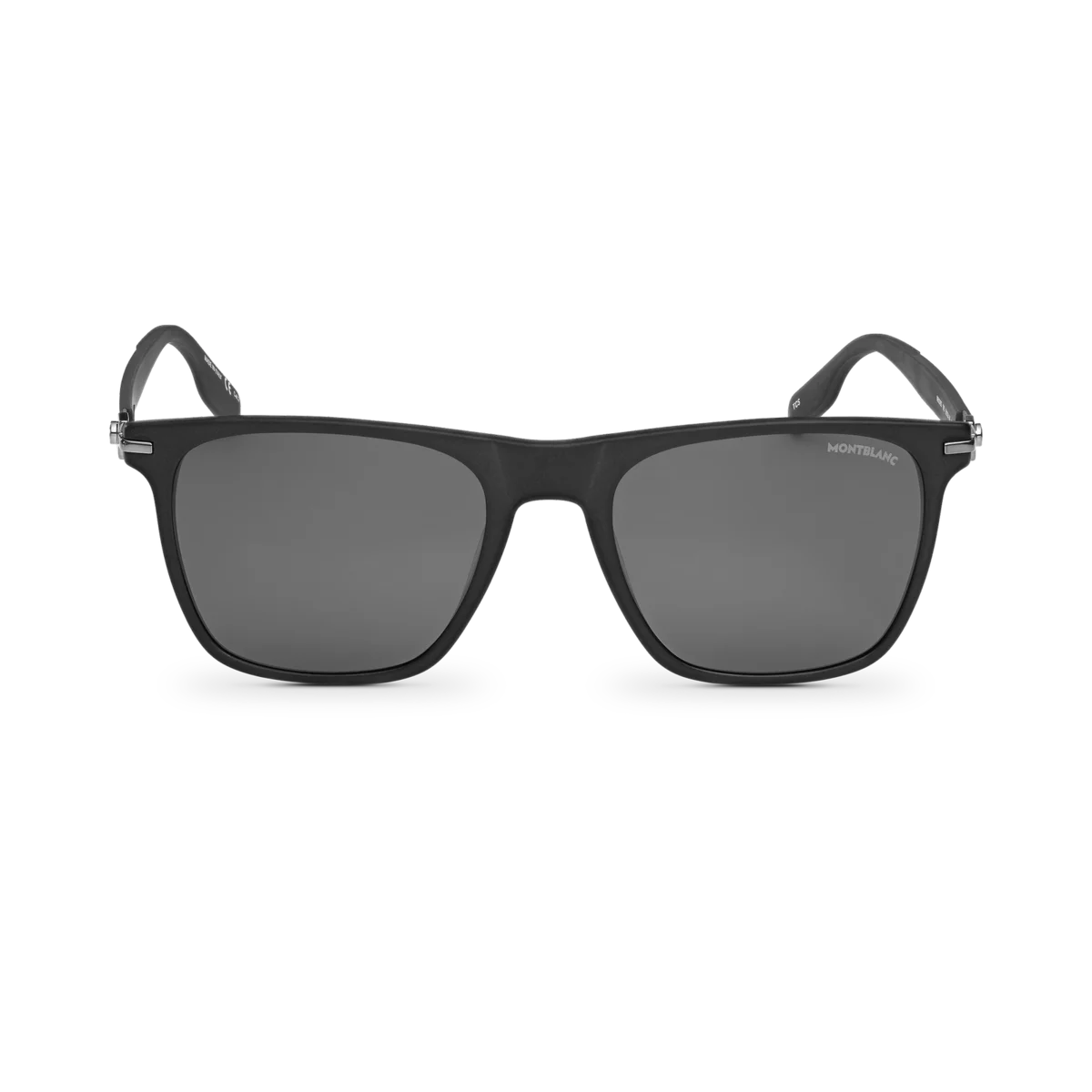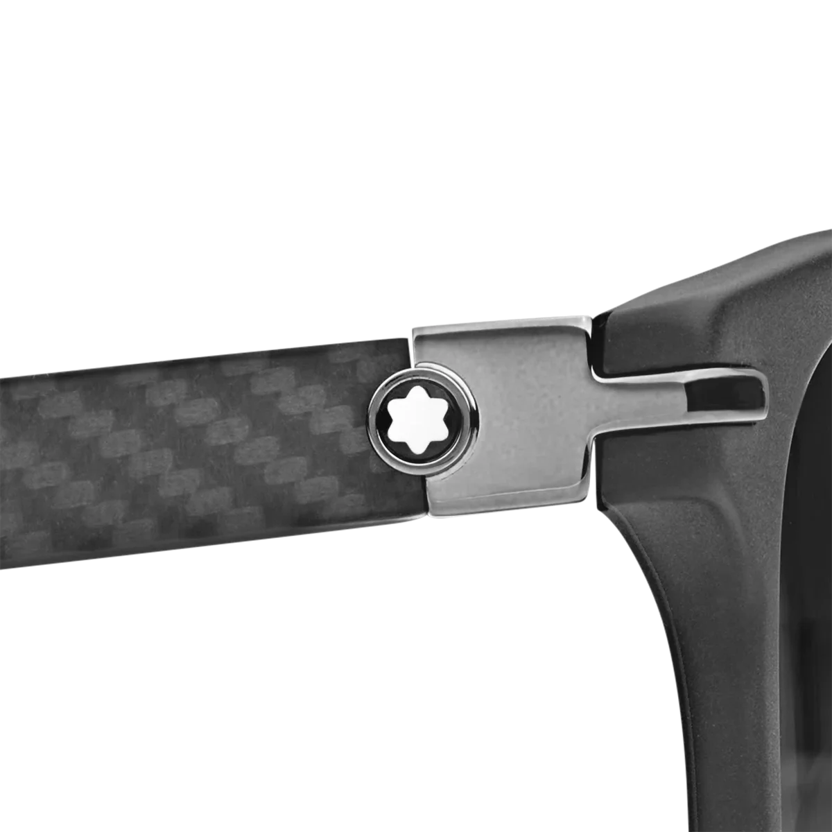 Diese Sonnenbrille im quadratischen Stil hat einen schwarz gefärbten Acetatrahmen und graue Gläser. Die Enden der Bügel sind grau gefärbt und passen somit zur Farbe der Gläser. Die Bügel sind mit Carbonfaser und Gummi verstärkt, was die Flexibilität erhöht und sie leichter macht.