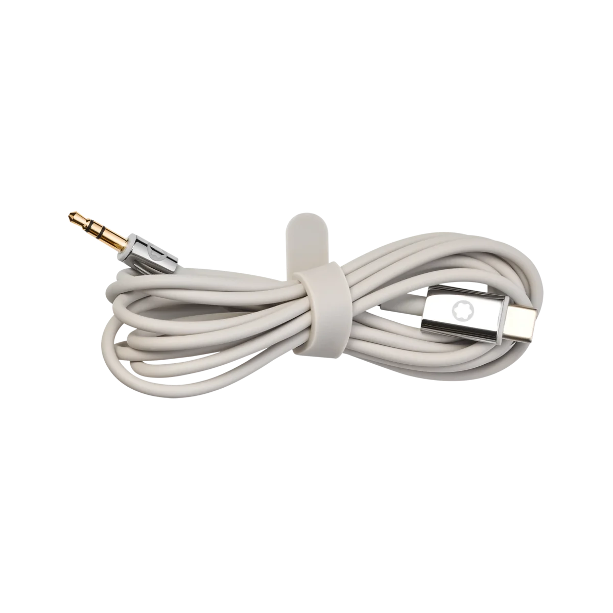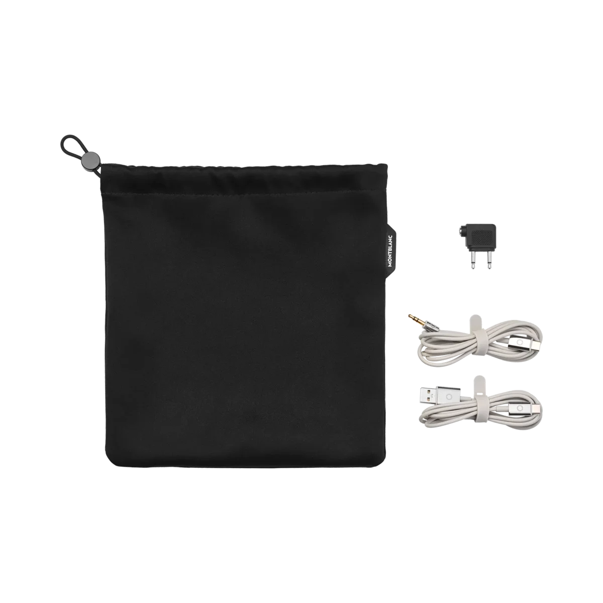 Zusätzliches Reiseset für Ihre Montblanc MB 01 Kopfhörer mit einer schwarzen Tasche, einem grauen USB-C-Ladekabel, einem grauen Audiokabel und einem schwarzen Reiseadapter.