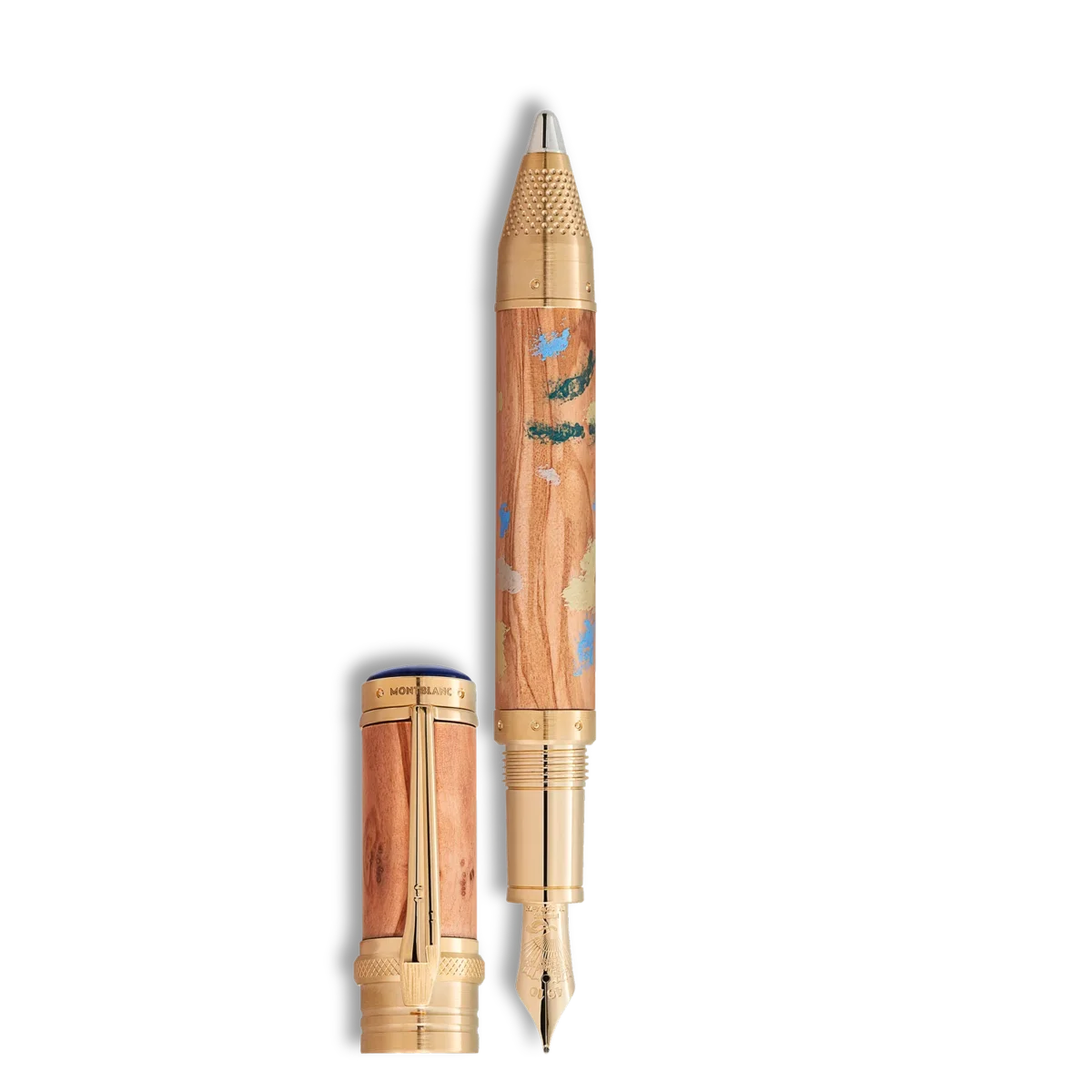 Große Künstler haben im Laufe der Geschichte die menschliche Erfahrung in einer universellen Sprache aus Form und Schönheit zum Ausdruck gebracht. Die Montblanc Masters of Art Collection würdigt ihren unvergänglichen Beitrag zum Streben nach Perfektion in der Kunst – ein Streben, das Montblanc sowohl feiert als auch selbst verfolgt.Pierre-Auguste Renoir ist einer der bedeutendsten Vorläufer der Moderne, dessen sonnendurchflutete Gemälde den Ton für eine ganze Bewegung angaben: den Impressionismus. In Anerkennung der bahnbrechenden Leistungen dieses angesehenen und faszinierenden französischen Impressionisten hat Montblanc die Masters of Art Homage to Pierre-Auguste Renoir Limited Edition 4810 geschaffen.Als würde man Renoir über die Schulter schauen, ist die Edition aus Olivenholz gefertigt und mit Farbe bespritzt, als stamme sie direkt aus der Hand des Künstlers. Renoir selbst hätte wahrscheinlich kein anderes Holz gewählt, da er die alten Olivenbäume in seinem Garten in Südfrankreich liebte und viele prächtige Exemplare in seinen Bildern verewigte. Renoir hielt Momente wechselnder Stimmungen fest und hielt sie mit lebhaften Farben und schnellen Pinselstrichen auf Leinwand fest. Ein auffälliges Merkmal der Edition ist der goldbeschichtete Clip in Form von zwei Pinseln, wie sie Renoir verwendete, um sowohl die feinen Details als auch die großflächigeren Bereiche seiner Meisterwerke zu gestalten. Die Kappe ist mit ultramarinblauem Edelharz verziert, das das Montblanc-Emblem umgibt. Der Ring auf der Kappe trägt die Gravur 1874, das Jahr, in dem diese neue Generation von Künstlern, die Impressionisten, ihre erste Ausstellung hatte. Das Jahr 1874 markiert somit die Geburt des Impressionismus als eigenständige Bewegung. Der zarte Faltfächer mit zwei Quasten, der die handgefertigte, massive Au 750 Goldfeder ziert, ist eine Hommage an die Bedeutung des Fächers, eines Accessoires, das in vielen seiner Werke, insbesondere in seinen einfühlsamen Frauenporträts, zu sehen ist. Als Hommage an Renoirs zeichnerisches Können ist eine Silberstift-Spitze aus weichem 925er Sterlingsilber in den goldbeschichteten Konus integriert, mit der man eigene Silberstift-Skizzen anfertigen kann.