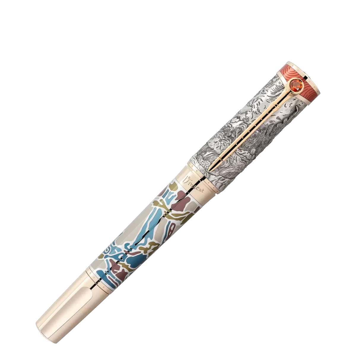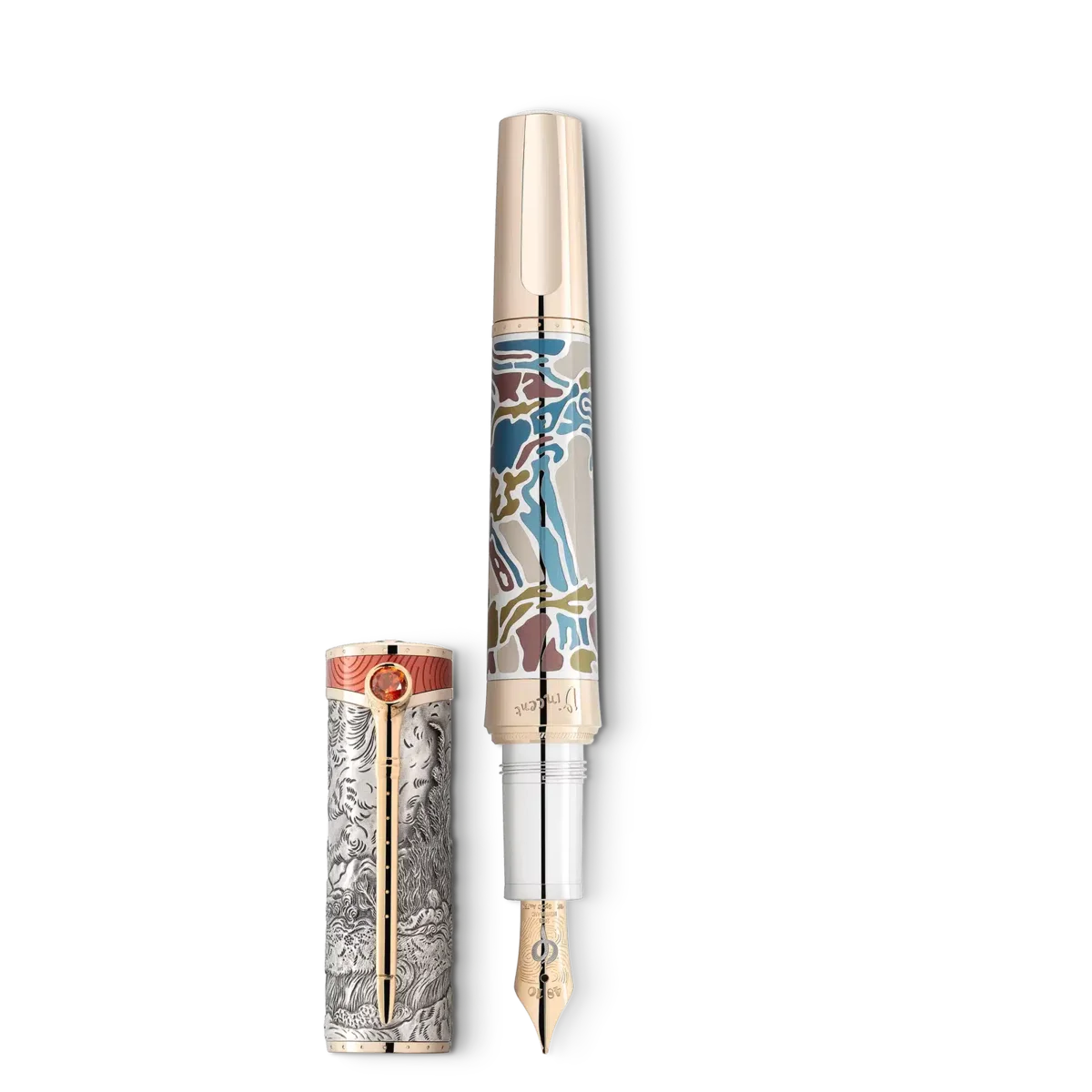 Mit dem Montblanc Masters of Art Homage to Vincent van Gogh Limited Edition 161 würdigt Montblanc Vincent van Gogh, einen der beliebtesten Maler des späten 19. Jahrhunderts. Diese Edition betont insbesondere seine Zeit in Saint-Rémy-de-Provence und Auvers-sur-Oise mit Designdetails, die unter anderem sein letztes Werk „Baumwurzeln” widerspiegeln. In Saint-Rémy und Auvers-sur-Oise perfektionierte Van Gogh seine Fähigkeit, Naturlandschaften aus der Perspektive seiner Emotionen zu malen. „Weizenfeld und Zypressen“ ist ein solches Gemälde, das einen stürmischen Himmel über einer Landschaft voller Bewegung zeigt. Van Gogh malte diese Ansicht dreimal aus der Anstalt in Saint-Rémy. Seine Zeichnung derselben Ansicht, die er mit Bleistift, Rohrfeder und Feder und Tinte anfertigte, ist in der Gravur auf der Kappe aus 925er Sterlingsilber interpretiert.Die Gravur „1890” auf dem Schaftring – neben Vincents Signatur in Blau – erinnert an das Jahr, in dem er sein letztes Gemälde, „Baumwurzeln”, malte. Der Schaft aus 925er Sterlingsilber ist mit Lackintarsien verziert, deren Design und Farben sich an „Baumwurzeln” orientieren, das eine Gruppe von Bäumen zeigt, deren Wurzeln durch Erosion an einem Hang freigelegt wurden. Van Gogh entwickelte einen lockereren, freieren Stil und wurde gleichermaßen kompetent im Umgang mit Pinsel und Palettenmesser – das er für klumpige, impulsive „Impasto“-Arbeiten verwendete. Sein Palettenmesser inspirierte den Clip, während seine schwungvolle Pinselführung in der Lackierung der Kappenoberseite verewigt ist. Darüber hinaus spiegelt sich seine Vorliebe für das Pfeifenrauchen, auf die er in vielen seiner Selbstporträts Bezug nimmt, in einem subtilen Detail des Clips wider: Der obere Teil ist wie ein Pfeifenkopf geformt und mit einem Citrin verziert. Als Hommage an Vincents Faszination für traditionelle japanische Holzschnitte ist die Gesamtform von einem japanischen Holzschnitzmesser inspiriert. Die Art und Weise, wie Van Gogh Inspiration in der japanischen Kunst fand, demonstriert die Universalität der Kunst und künstlerischer Konzepte wie dem Goldenen Schnitt oder 1,61 (Phi), die nicht nur als Inspiration für die Prägung des Phi-Symbols auf der handgefertigten, massiven Au 750 Goldfeder diente, sondern auch für die Limitierung auf 161 Stück.Van Goghs vielfältige kreative Impulse werden durch die Facetten des blauen Lacks symbolisiert, der die Kappe krönt. Eingebettet in dieses blaue Feld wie einer von Vincents leuchtenden Sternen – ein Bild, das sich in seinen Werken immer wieder findet – ist das Montblanc Emblem aus massivem 750er Gold. Mit Signaturgold und/oder Signaturgoldbeschichtung erinnert Montblanc an den edlen Farbton von Gelbgold, der zu einem geschätzten Farbton für die Schreibgeräte des Hauses geworden ist. Ident-Nr. MB129161 Physisches Gewicht 146 g