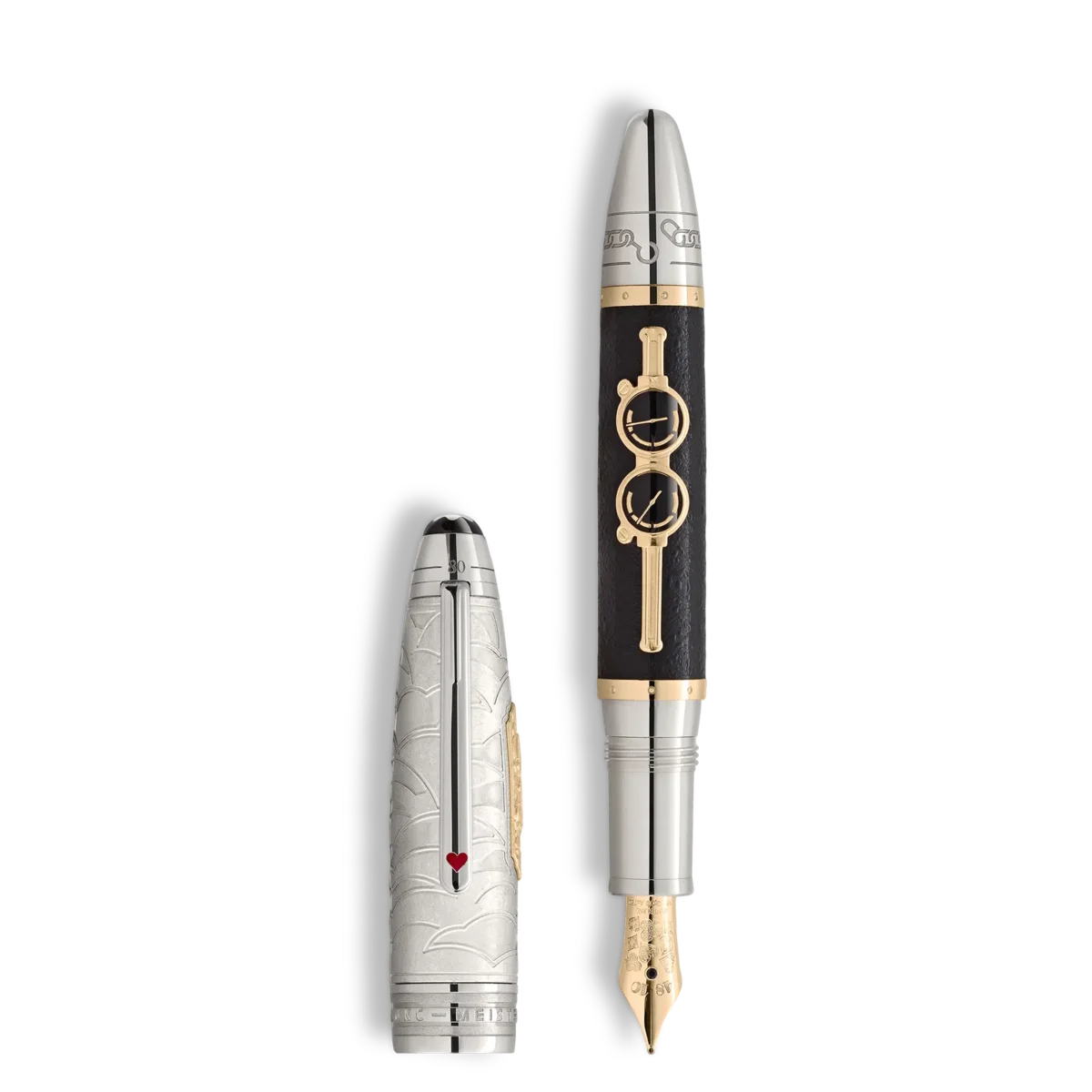 Die Meisterstück Around the World in 80 Days Kollektion ist von Jules Vernes berühmtem Abenteuerroman inspiriert. Der Limited Edition 811 Füllfederhalter aus 925er Sterlingsilber und strukturiertem Lack erzählt die epische Reise von Mr. Fogg und Passepartout. Auf der letzten Etappe ihrer Reise von Yokohama zurück nach London über die Vereinigten Staaten durchqueren die beiden den riesigen amerikanischen Kontinent mit dem Zug, was auf der Au750/18 Karat massivgoldenen Kartusche dargestellt ist, die in die Kappe aus 925er Sterlingsilber eingelegt ist. Das Design der Kappe fängt den aufsteigenden Rauch der Lokomotive ein, während eine 3D-Einlage, die Druckventile darstellt, den strukturierten Schaft ziert. Der Clip ziert eine rot lackierte Herzkarte, die die Verbindung zwischen Phileas Fogg und Prinzessin Aouda symbolisiert. Darüber hinaus stehen die Kartenfarben für Foggs gewagte Wette, die Reise in nur 80 Tagen zu absolvieren. Auf der Kappe ist die Zeitachse der Reise eingeprägt – 36 Tage von Yokohama nach London, was insgesamt 80 Tage um die Welt ergibt. Auf dem Konus ist ein Sicherheitskettenmuster zu sehen, das einen entscheidenden Moment widerspiegelt, als Passepartout den Zug von der Lokomotive abkoppelt, um die Besatzung zu retten, die von den Sioux angegriffen wurde. Das Schreibgerät ist mit einer handgefertigten 18-Karat-Goldfeder verziert, die mit einem 1,5 mm großen schwarzen Spinell und einem Kartensymbolmuster versehen ist.