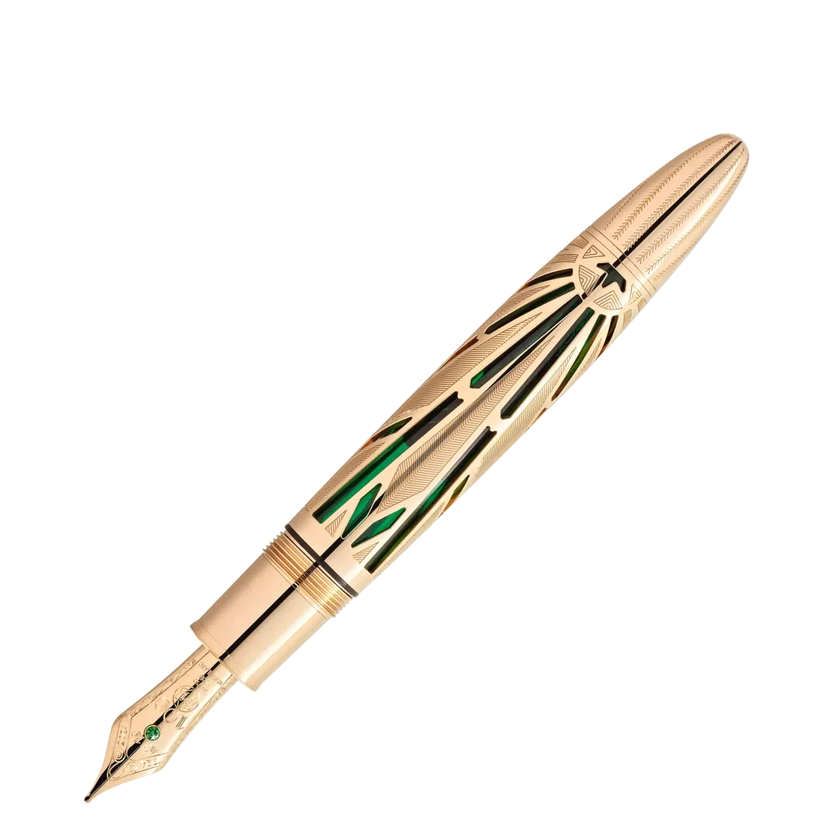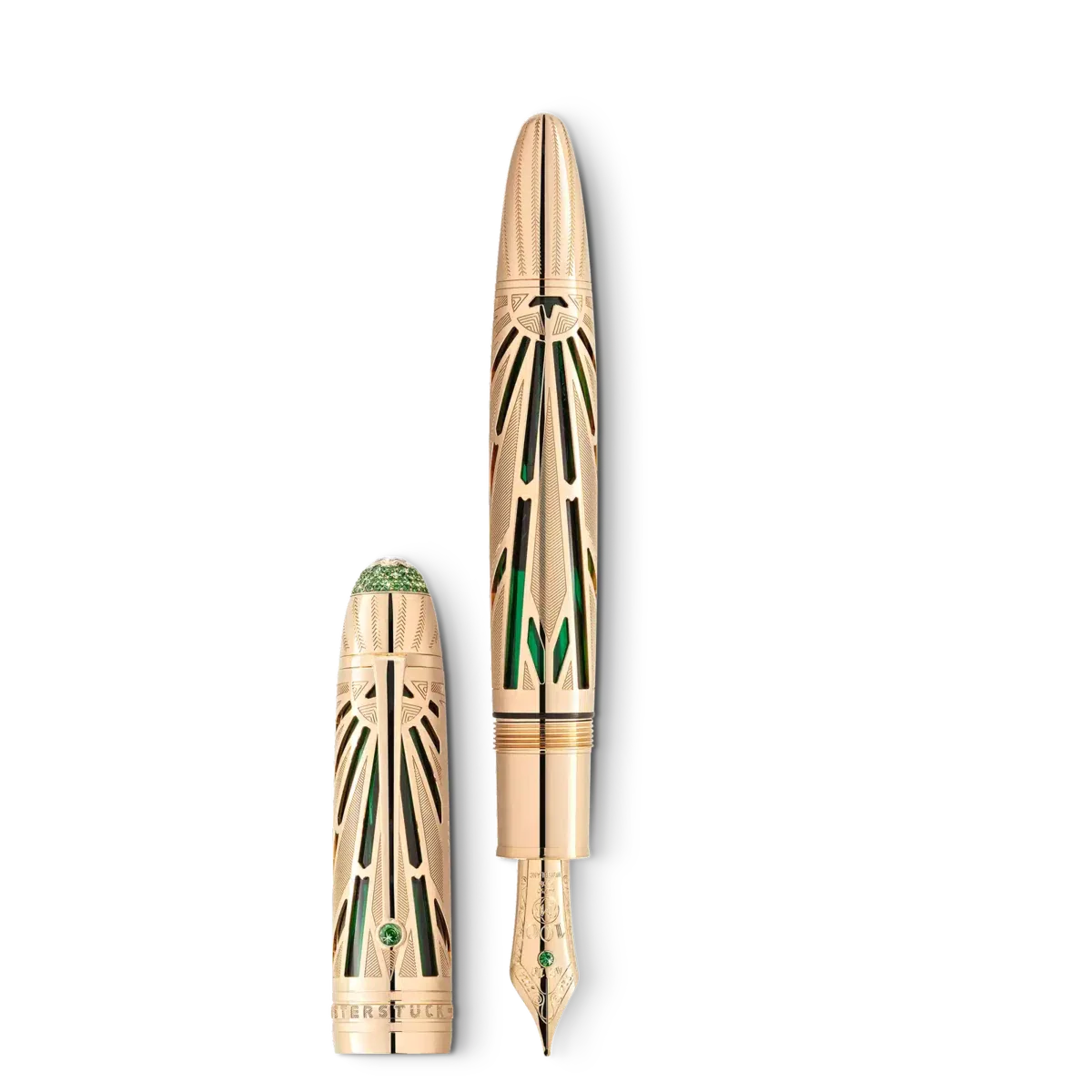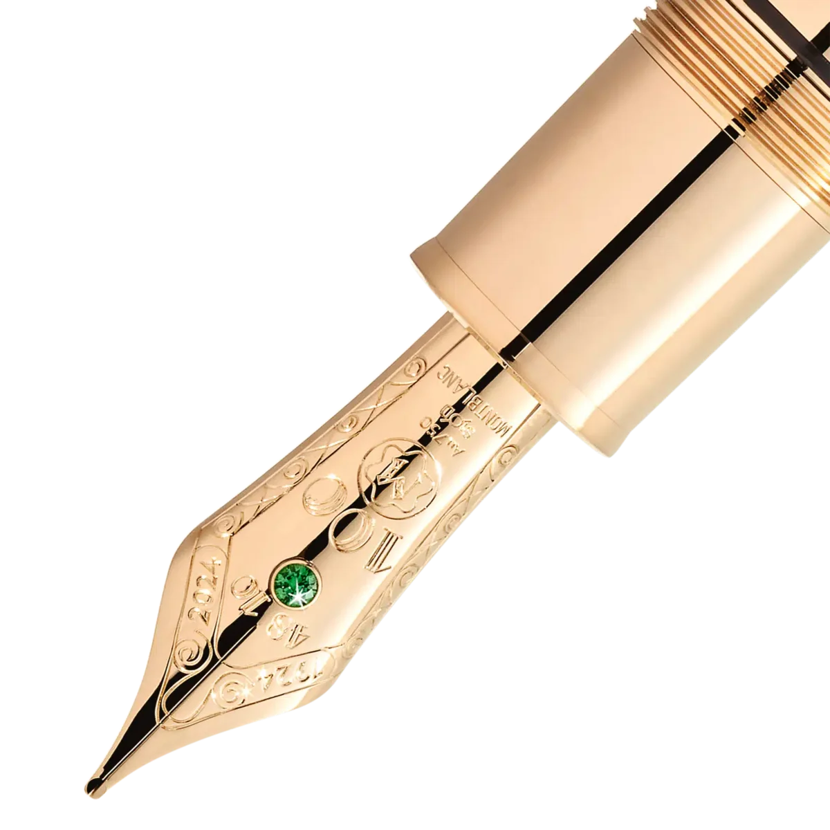 Seit seiner Einführung im Jahr 1924 gilt der Meisterstück von Montblanc weithin als das Inbegriff eines edlen Schreibgeräts, das für raffinierten Geschmack und eine kühne Selbstdarstellung steht. Ob zum Verfassen eines Liebesbriefes oder zum Unterzeichnen eines historischen Dokuments – der Meisterstück hat die Seiten der Geschichte nachhaltig geprägt. Um diesen Meilenstein zu würdigen, hat Montblanc tief in seinen Archiven gegraben und die Meisterstück Origin Kollektion geschaffen, die eine Hommage an die reiche Geschichte und das Erbe der Marke darstellt. Die Kollektion ist inspiriert von frühen Entwürfen aus unseren Archiven sowie von Designmerkmalen der ersten Meisterstück-Editionen, die den Gründungsgeist einfangen und mit modernem Flair versehen. Diese Limited Edition ist meisterhaft aus skelettiertem massivem Au750 Signature Gold gefertigt, mit Handgravuren, die von Archivmustern inspiriert sind, und mit einer durchscheinenden Unterlage aus grünem Lack. Der Clip ist eine Hommage an die frühen Clipformen einiger der ersten Meisterstück-Schreibgeräte und weckt ein Gefühl von Nostalgie. Er ist mit einem Tsavorit verziert. Bei genauerer Betrachtung entdeckt man das ursprüngliche Meisterstück-Logo, das seit seiner Einführung als Symbol für hohe Qualität die Kappe ziert. Die Kappenspitze ist mit einem Diamanten im Montblanc-Schliff besetzt, der von Tsavoriten in verschiedenen Größen umgeben ist. Diese Jubiläumsausgabe wird von einer massiven Au750 Signature Gold-Schmuckfeder mit einem Tsavorit und einer speziellen Handgravur gekrönt, die stolz die Zahl „100” sowie die Jahreszahlen „1924” und „2024” zeigt. Auf weitere 100 Jahre Exzellenz mit Meisterstück!