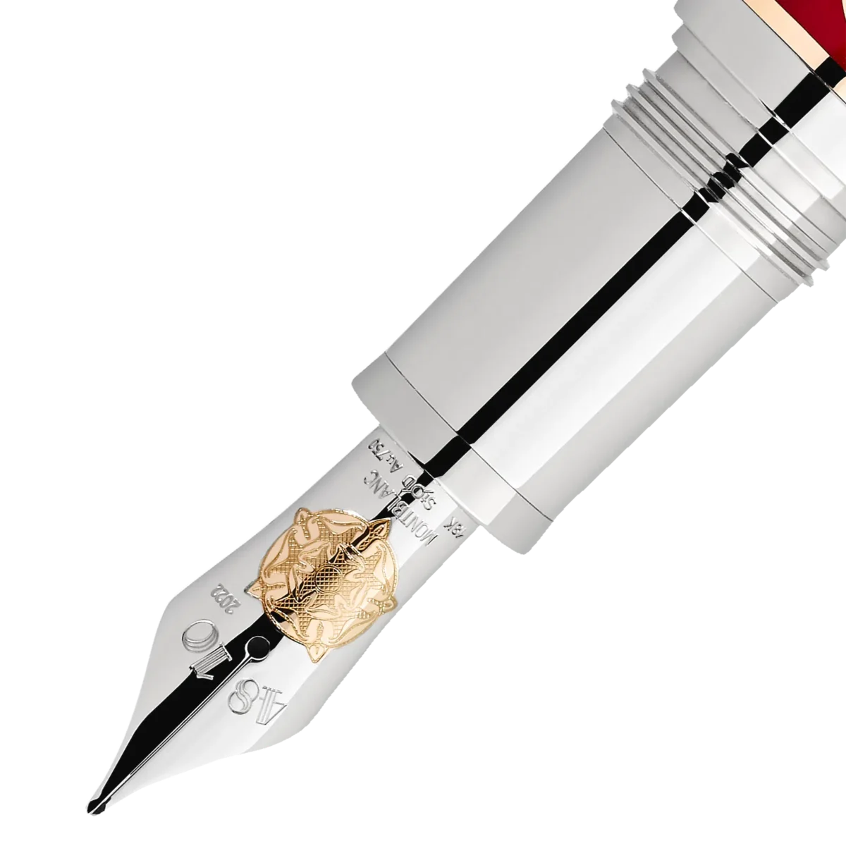Die Montblanc Patron of Art Edition 2022 ist Königin Victoria und Prinz Albert gewidmet. Die Limited Edition 888 ist eine bemerkenswerte Paar-Edition, wobei eine Edition Königin Victoria und die andere ihren Gemahl Prinz Albert ehrt. Die Montblanc Patron of Art Homage to Victoria Limited Edition 888 feiert Victoria, insbesondere ihren Krönungstag. Der Füllfederhalter verfügt über eine Kappe und einen Schaft aus rotem, transluzentem Lack und eine solide Au 750 / 18K-Signatur-Gold-Skelettüberzug. Das Skelett ist von ihrem Krönungskragen und ihrem Monogramm inspiriert, während das Rot von ihrem Krönungskleid inspiriert ist. Die Beschläge sind platinbeschichtet. Die Form des Clips ist eine Hommage an ihr Zepter, während der grüne Tsavorit eine Hommage an ihren Verlobungsring ist. Die Kappe ist von einer Königskrone inspiriert und mit dem Montblanc-Emblem aus Perlmutt verziert. Während der Kappenring wie ein Ehering die Gravur „Albert” und ihr Hochzeitsdatum trägt, ziert eine besondere Gravur den Konus. Als Hommage an Victorias Spitznamen „England’s Rose” ist die handgefertigte, zweifarbige Feder aus massivem 750er/18 Karat Gold mit einer Rose geprägt. Mit „Signature Gold” und/oder „Signature Gold-Beschichtung” beschreibt Montblanc den edlen Farbton von Gelbgold, der zu einem geschätzten Farbton für die Schreibgeräte des Hauses geworden ist.