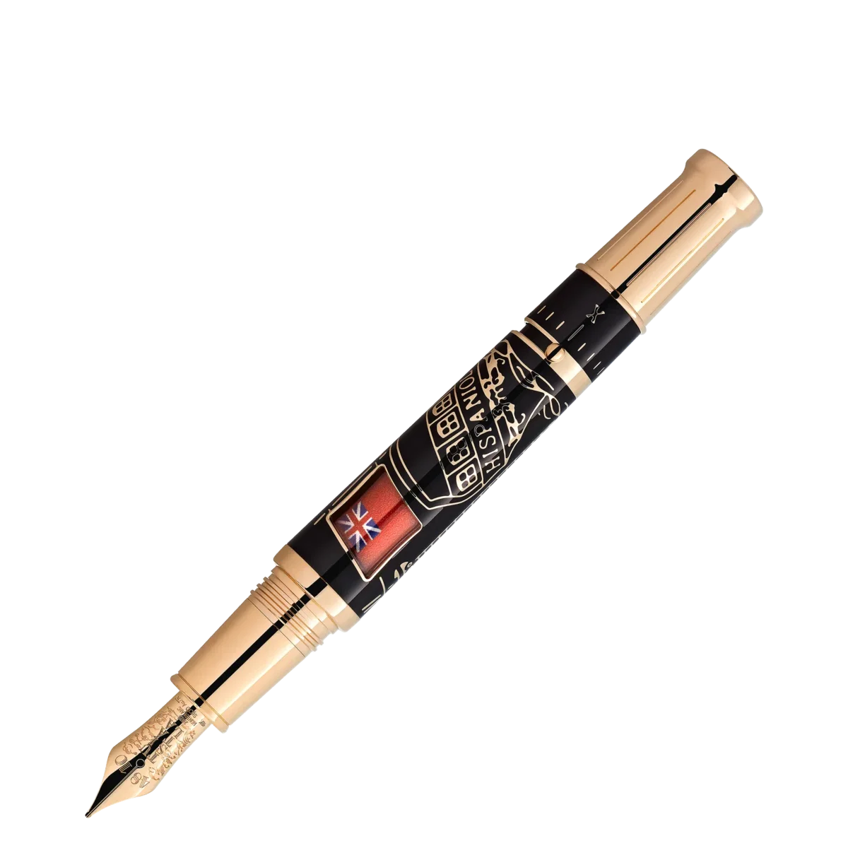 Robert Louis Stevenson, 1850 in Edinburgh, Schottland, geboren, hatte zwei große Wünsche: Freiheit und das Eintauchen in andere Welten. Er verfasste Essays und Reiseberichte sowie seine legendären Abenteuergeschichten, die von markanten Charakteren bevölkert sind, deren Namen Lesern auf der ganzen Welt einen Schauer über den Rücken jagen: Long John Silver, Captain Flint, Jekyll und Hyde. Die Montblanc Writers Edition Homage to Robert Louis Stevenson ist diesem fantasievollen Geschichtenerzähler gewidmet. Der Roman „Die Schatzinsel“ inspirierte viele Designdetails der Edition. Die Gesamtform des Schreibgeräts und die Ringe auf dem Konus vermitteln den Eindruck eines historischen, ausziehbaren Fernrohrs. Diese Edition erzählt die Geschichte von „Die Schatzinsel“ nach und zeigt die berühmte Hispaniola auf dem Schaft, eingefasst in kostbaren schwarzen Lack. Die Hispaniola begibt sich auf eine Reise und hisst eine britische Flagge, die hinter einem kleinen Fenster zu sehen ist. In Anlehnung an die Handlung der Meuterei der Piraten kann die Flagge mit einem kleinen Knopf gedreht werden, um eine Piratenflagge zu enthüllen. Vertikale Linien, die an die Planken des Schoners „Hispaniola“ und eine traditionelle Seekiste erinnern, zieren die charakteristische goldbeschichtete Kappe. Hinter dem charakteristischen goldbeschichteten Clip laufen die Linien in einer Kompassrose zusammen, während der Clip die Form eines Belaying-Pins imitiert, an dem die Leinen der Takelage eines Schiffes befestigt würden. Die Kappe wird von dem Montblanc Emblem aus Perlmutt gekrönt. Der Kappenring ist mit einer Gravur von Stevensons Unterschrift verziert. Als Hinweis auf Robert Louis Stevensons Leidenschaft für die Seefahrt und seine Neuansiedlung in der Südsee sind auf der handgefertigten Feder aus massivem 750er Gold Wolken, Möwen und der Titel „Tusitala” eingraviert, den die Samoaner dem großen Schriftsteller und Weltreisenden gaben.Mit „Signature Gold“ und/oder „Signature Gold-Beschichtung“ beschreibt Montblanc den edlen Farbton von Gelbgold, der zu einem geschätzten Farbton für die Schreibgeräte des Hauses geworden ist.