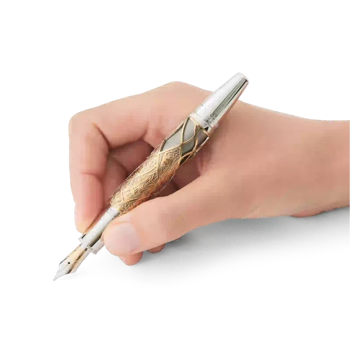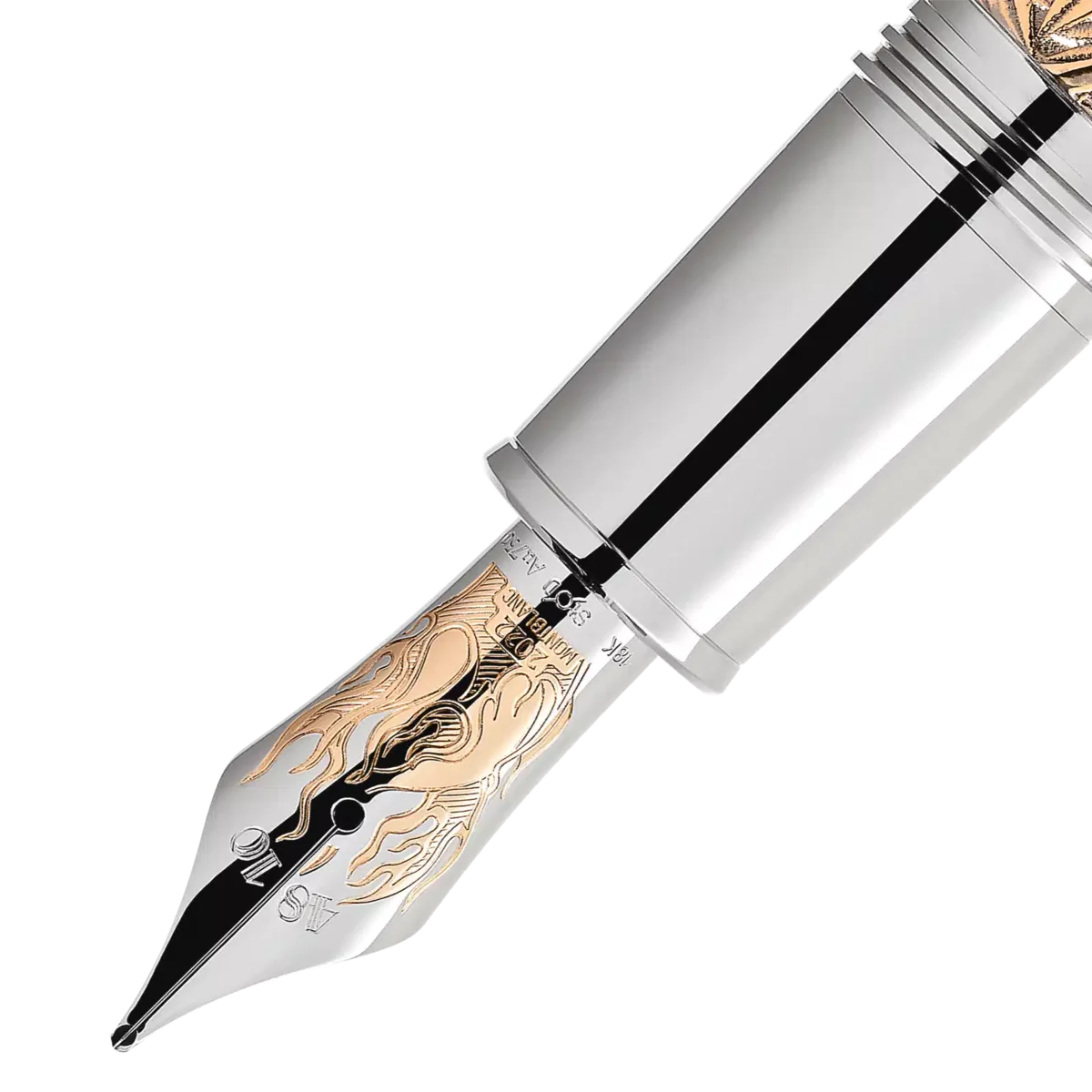 „Es war einmal …“ Die Montblanc Writers Edition Homage to the Brothers Grimm ist Jacob und Wilhelm Grimm gewidmet und würdigt ihre Arbeit an deutschen und europäischen Volksmärchen, darunter einige der berühmtesten Märchen wie „Schneewittchen“, „Aschenputtel“ und „Dornröschen“. Die Gesamtform des Schreibgeräts erinnert an einen alten Wanderstock. Diese Edition aus Metall mit einer speziellen Vintage-Beschichtung ist von der Geschichte „Dornröschen“ inspiriert, was sich in den ineinander verschlungenen Blättern und Dornen um die Kappe und den Schaft widerspiegelt. Die Kappe wird vom Montblanc Emblem aus kostbarem Perlmutt gekrönt. Der platinbeschichtete Clip, der an ein knorriges Stück Holz erinnert, offenbart überraschenderweise die Silhouette des Profils der Brüder Grimm, wenn man ihn dreht. Als Hommage an die Magie des Geschichtenerzählens trägt die handgefertigte Au 750 massive zweifarbige Goldfeder mit Rhodiumbeschichtung die Flammen eines Feuers, das oft der Schauplatz war, an dem Volksmärchen weitergegeben wurden.