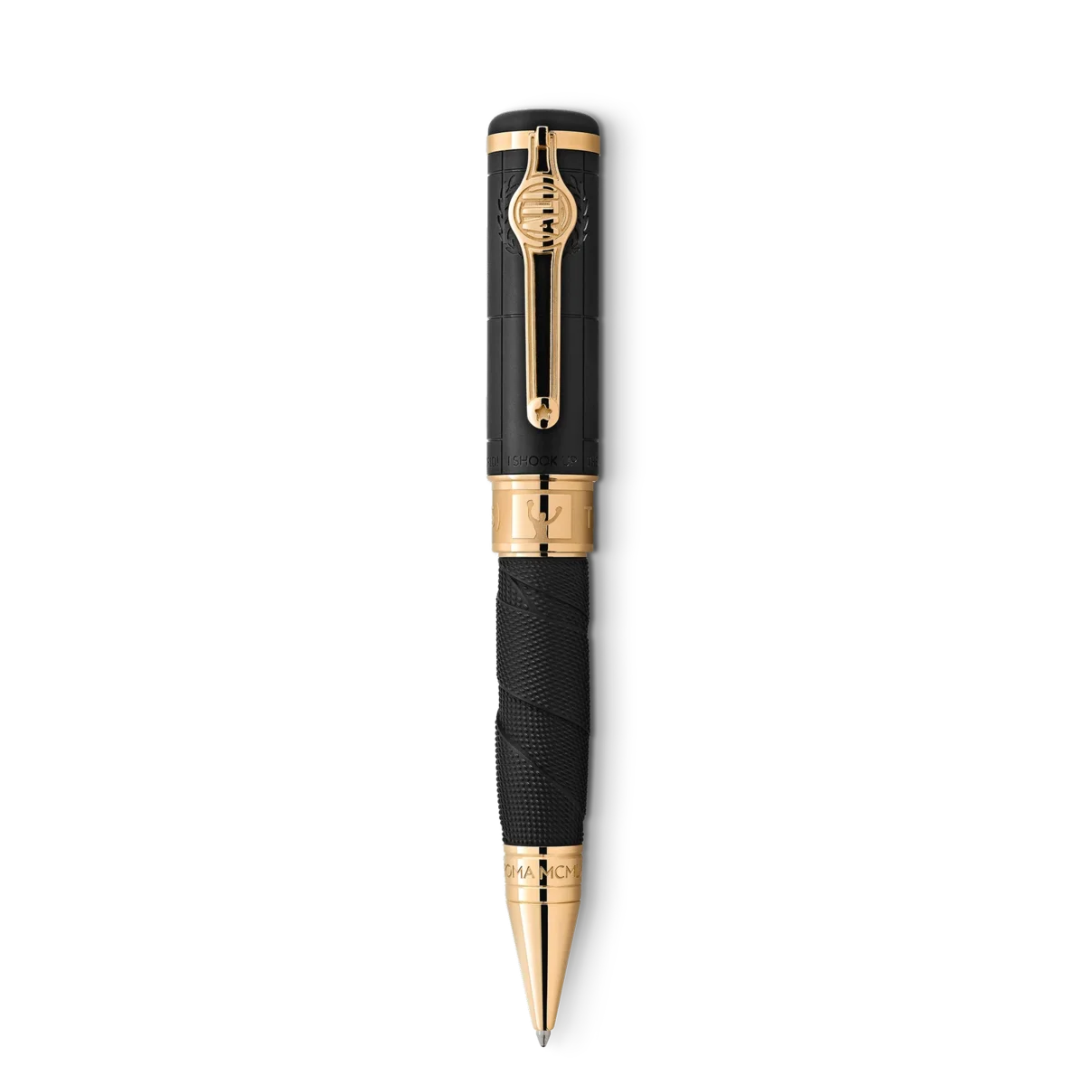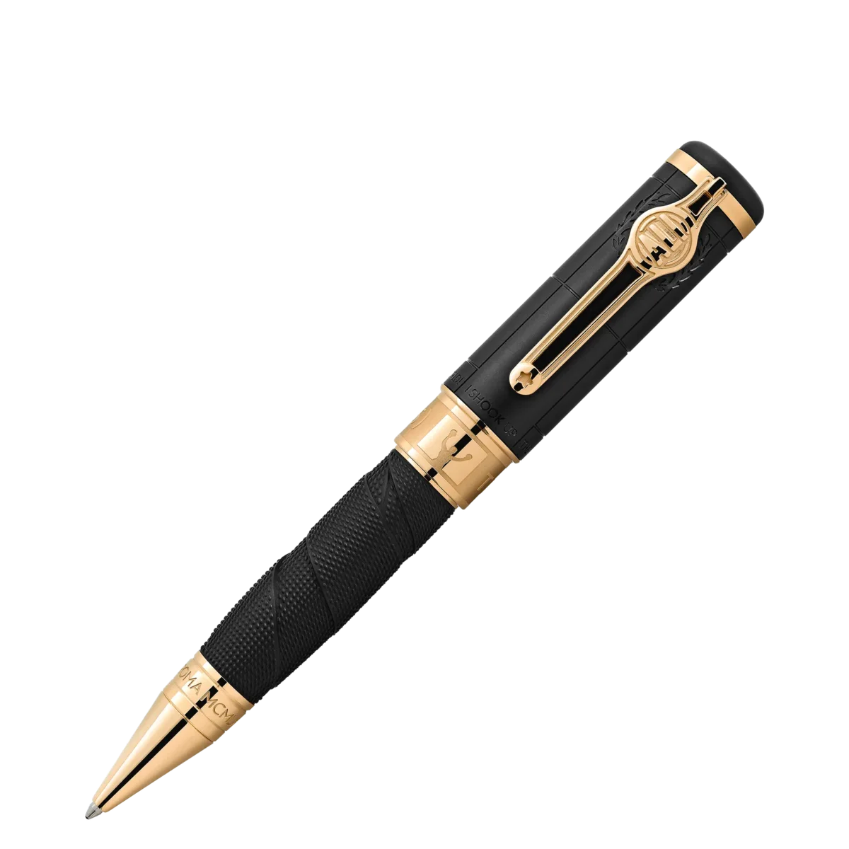 Nur wenige Sportler werden so gefeiert und geehrt wie der dreifache Weltmeister im Schwergewicht Muhammad Ali, dessen legendäre Momente im Sport und im Kampf für Bürgerrechte ihn zu einem der einflussreichsten Sportler und Menschenfreunde des 20. Als Sportler erschütterte Ali die Welt mit seiner Kraft, seinem Können und seiner Persönlichkeit und wurde mit nur 22 Jahren Weltmeister im Schwergewicht. Seine größten Erfolge erzielte er jedoch durch sein humanitäres Engagement. Die Kappe aus edlem schwarzem Harz ähnelt einem Boxsack, während der Schaft wie das Boxband aussieht, mit dem Sportler ihre Hände umwickeln. Der Kappenkörper weist verschiedene Designelemente auf, darunter ein berühmtes Zitat von Ali und ein Schmetterling, der von seinem typischen Kampfstil inspiriert ist: „Float like a Butterfly, sting like a bee” (Schwebe wie ein Schmetterling, steche wie eine Biene). Der spitze Kegel greift dieses Motiv auf und ist mit vier Linien graviert, die die Seile eines Boxrings darstellen. Die Inschriften auf der Kugelschreiberspitze beziehen sich auf Alis Sieg bei den Olympischen Spielen 1960 in Rom und seinen ersten Weltmeistertitel im Schwergewicht, den er 1964 in Miami gewann. Die Details seines Sieges, nämlich der Sieg durch technischen K.o. in der siebten Runde, sind auf dem Kappenring zu finden. Zur Feier seines ersten Titels ist das Montblanc-Emblem aus weißem Harz mit einer „1“ verziert. Um diesen Erfolg zu unterstreichen, ist der Clip wie ein Box-Meisterschaftsgürtel geformt und trägt seinen Namen. Ident-Nr. MB129335 Physikalisches Gewicht 60,57 g Abmessungen 140 mm * 17,3 mm