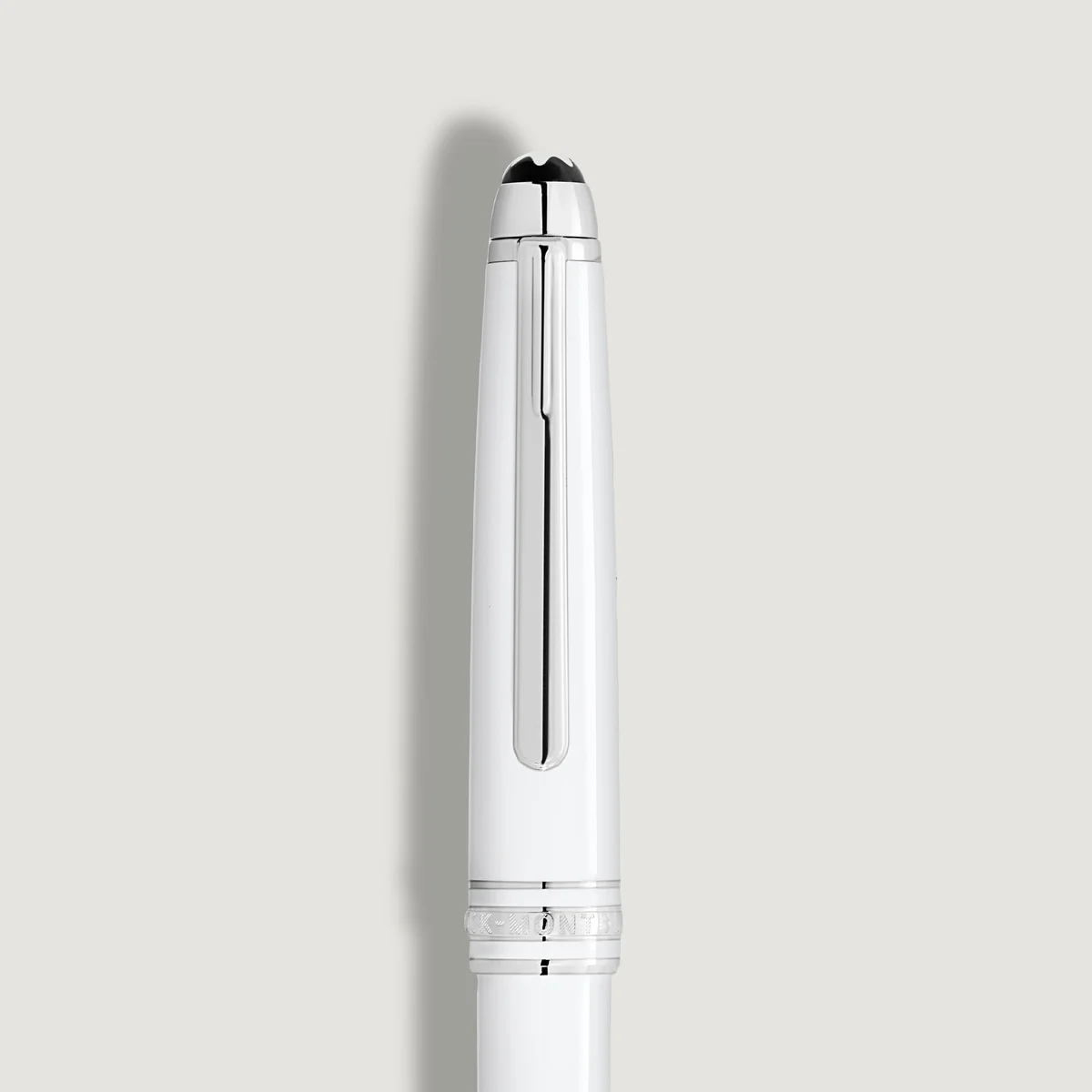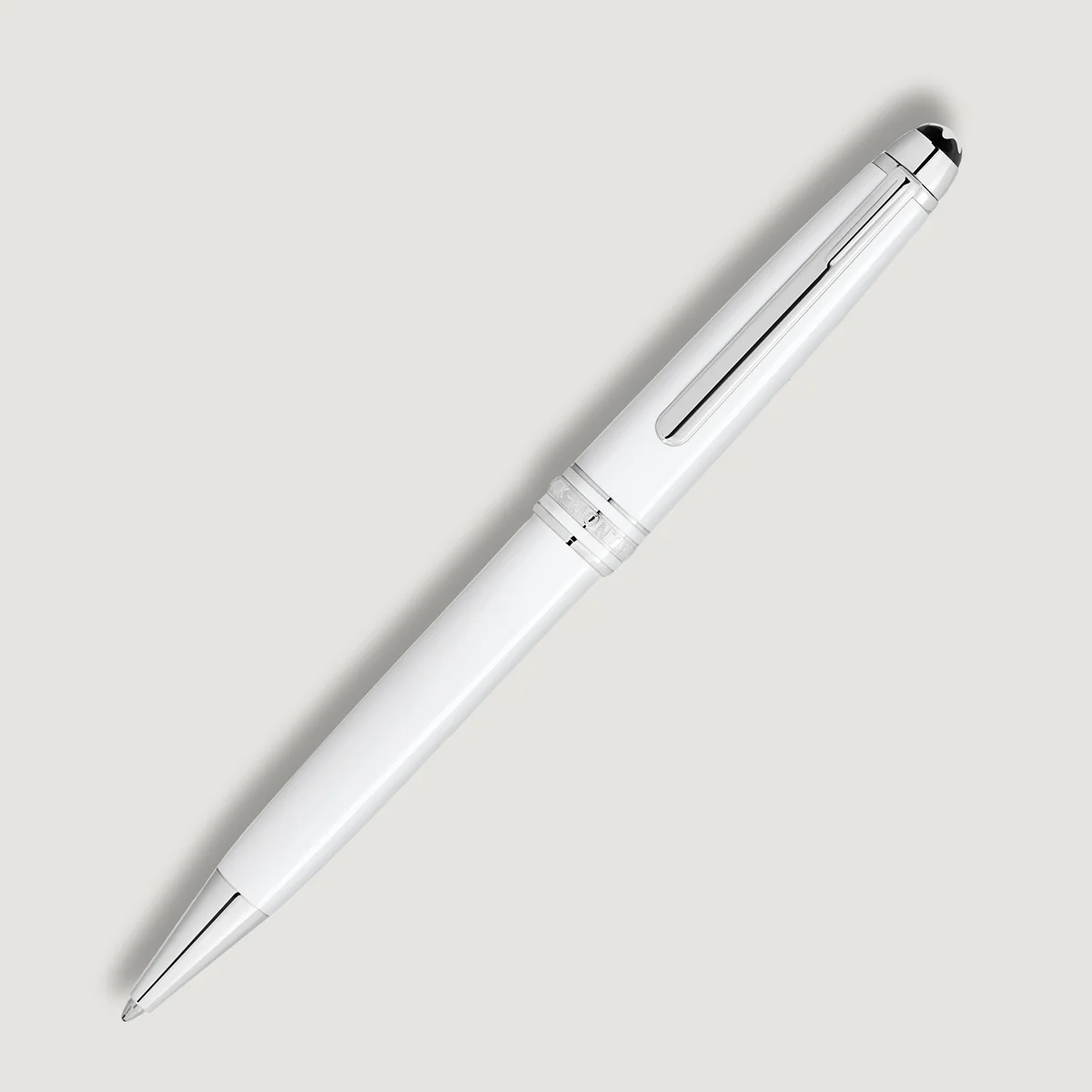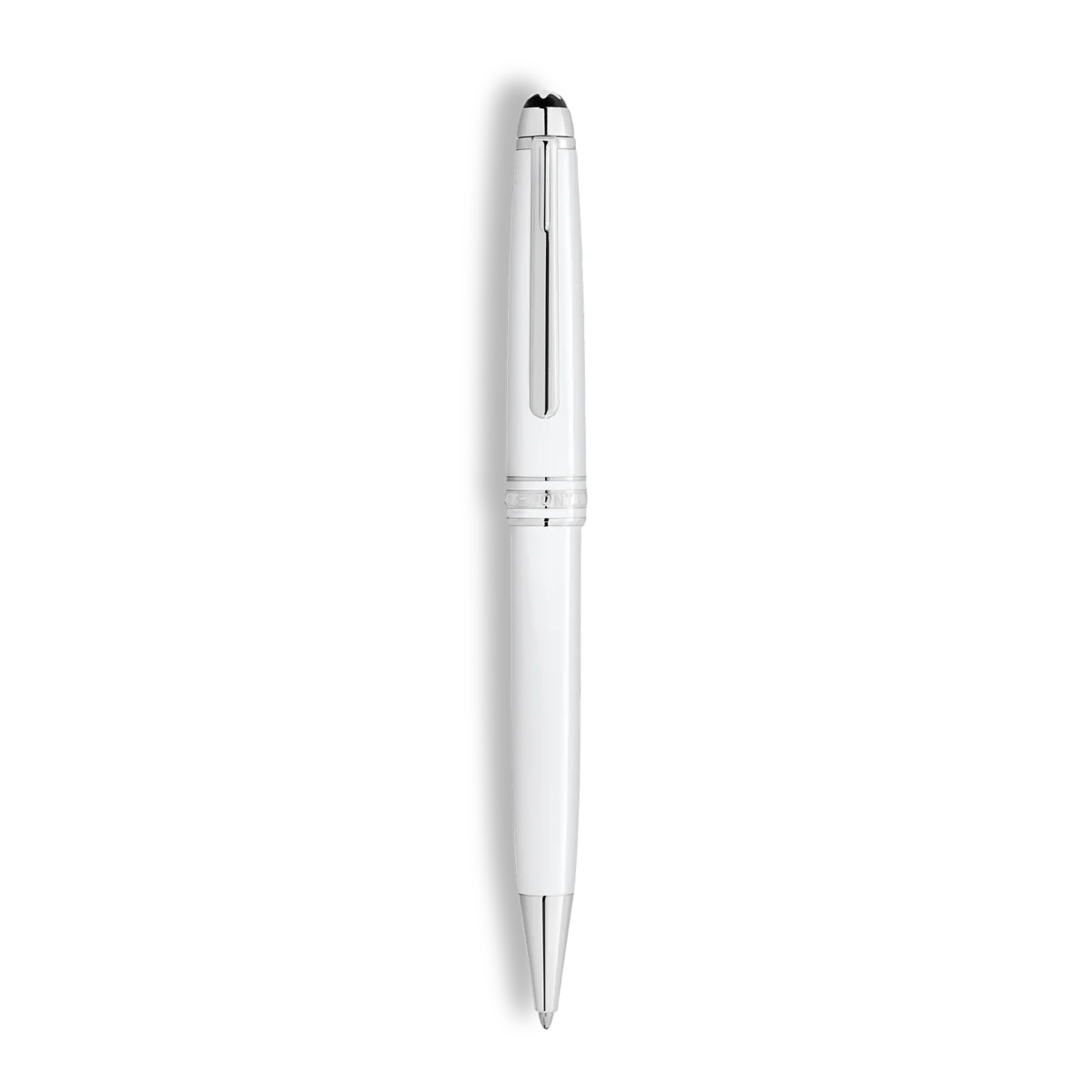 Der Meisterstück Classique Kugelschreiber aus weißem Edelharz mit eleganten platinbeschichteten Beschlägen und dem weißen Montblanc Emblem auf der Kappe ist eine unverwechselbare Designikone.