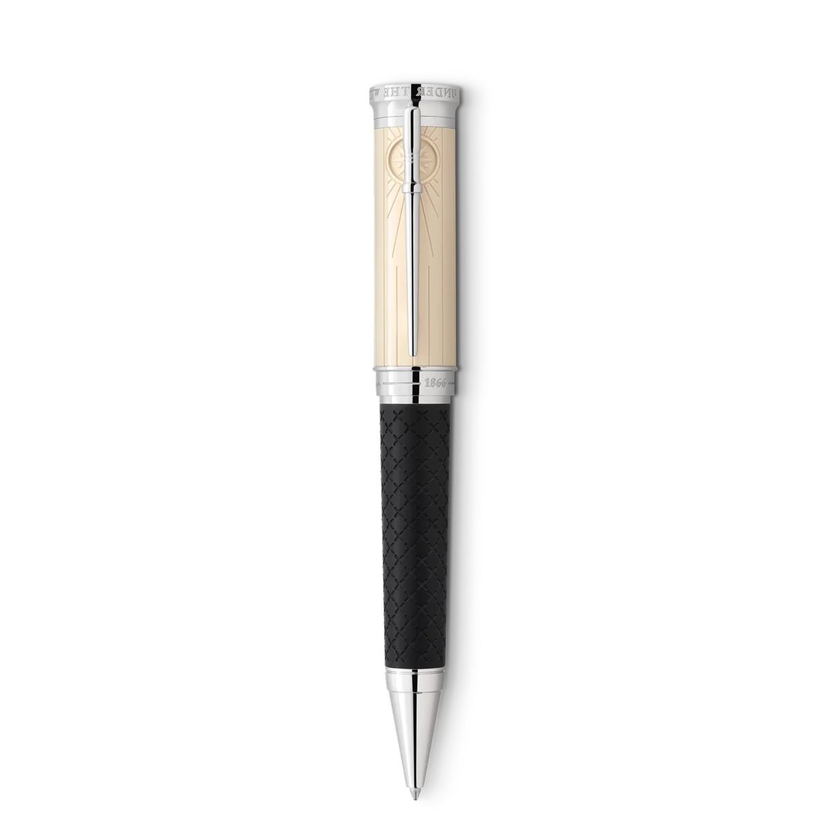 Robert Louis Stevenson, 1850 in Edinburgh, Schottland, geboren, hatte zwei große Wünsche: Freiheit und das Eintauchen in andere Welten. Er verfasste Essays und Reiseberichte sowie seine legendären Abenteuergeschichten, die von markanten Charakteren bevölkert sind, deren Namen den Lesern auf der ganzen Welt einen Schauer über den Rücken jagen: Long John Silver, Captain Flint, Jekyll und Hyde. Die Montblanc Writers Edition Homage to Robert Louis Stevenson ist diesem fantasievollen Geschichtenerzähler gewidmet. Der Roman „Die Schatzinsel“ inspirierte viele Designdetails der Edition. Die Gesamtform des Schreibgeräts und die Ringe auf dem Konus vermitteln den Eindruck eines historischen, ausziehbaren Fernrohrs. Der schwarze Schaft aus Edelharz ist mit eingravierten Kreuzen verziert, darunter ein größeres „X“, wie es die Position des Schatzes auf einer Karte markiert. Vertikale Linien, die an die Planken des Schoners „Hispaniola“ und eine traditionelle Seekiste erinnern, zieren die Kappe der Writers Edition. Hinter dem platinbeschichteten Clip laufen die Linien in einer Kompassrose zusammen, während der Clip die Form eines Belaying-Pins imitiert, an dem die Leinen der Takelage eines Schiffes befestigt würden. Die Kappe wird von dem Montblanc-Emblem gekrönt, das mit dem Symbol der Piraten, einem Totenkopf mit gekreuzten Knochen, verziert ist, der in der Mitte hervorgehoben ist. Der Kappenring ist mit einer Gravur von Stevensons Unterschrift neben dem Erscheinungsdatum seines ersten Werks „The Pentland Rising“ aus dem Jahr 1866 verziert. Die Daten 1850–1894 sind auf der Kappe eingraviert, um an das Leben von Robert Louis Stevenson zu erinnern.