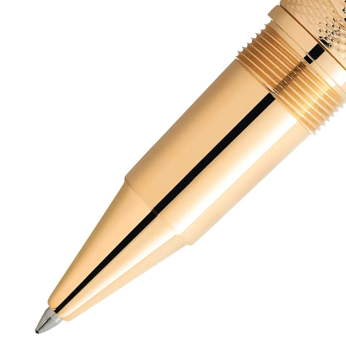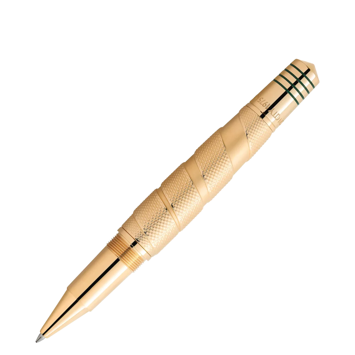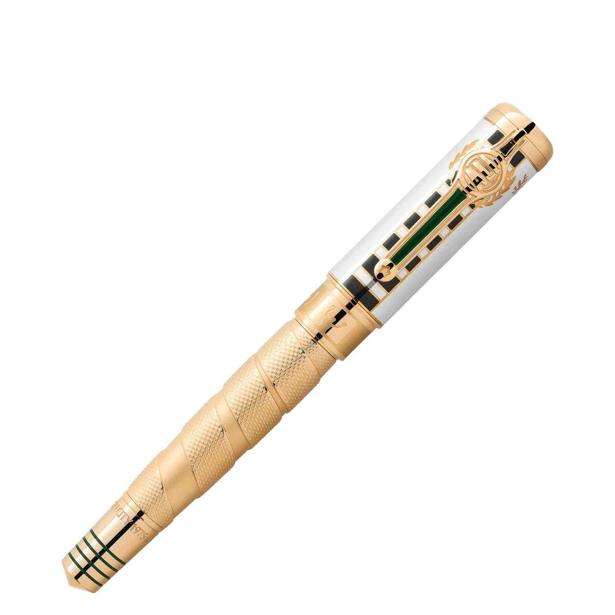 Nur wenige Sportler werden so gefeiert und geehrt wie der dreimalige Weltmeister im Schwergewicht Muhammad Ali, dessen legendäre Momente im Sport und im Kampf für Bürgerrechte ihn zu einem der einflussreichsten Sportler und Humanisten des 20. Jahrhunderts machten. Als Sportler erschütterte Ali die Welt mit seiner Kraft, seinem Können und seiner Persönlichkeit und wurde mit nur 22 Jahren Weltmeister im Schwergewicht. Sein größter Triumph war jedoch das Ergebnis seines humanitären Engagements. Inspiriert von dem Gewand, das Ali 1974 bei seinem legendären Kampf in Kinshasa, Zaire, trug, repräsentiert der kostbare Lack auf der Kappe dieses unverwechselbare Muster, während das Muster auf dem goldbeschichteten Schaft an die Boxbänder erinnert, mit denen Sportler ihre Hände umwickeln. Der goldbeschichtete Schmetterling auf der Kappe ist von seinem typischen Kampfstil inspiriert: „Float like a Butterfly, sting like a bee” (Schwebe wie ein Schmetterling, steche wie eine Biene). Der spitze Kegel greift dieses Konzept auf, und die vier lackierten Linien ähneln den Seilen eines Boxrings. Die Inschriften auf dem Kegel beziehen sich auf Alis Sieg im Kampf von 1974 mit dem Spitznamen „Rumble in the Jungle”, als Ali seinen zweiten Weltmeistertitel im Schwergewicht gewann. Die Details seines Sieges, nämlich der Sieg durch technischen K.o. in der achten Runde, sind auf dem Kappenring zu finden. Der Konus weist auch auf einen berühmten Kampf Alis aus dem Jahr 1975 hin, der den Spitznamen „Thrilla in Manila“ trug. Zur Feier seines zweiten Titels ist das Montblanc-Emblem aus weißem Edelharz mit einer „2“ verziert. Um diesen Erfolg zu unterstreichen, ist der Clip wie ein Box-Meisterschaftsgürtel geformt und trägt seinen Namen.