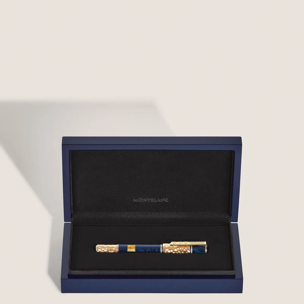 Große Künstler haben im Laufe der Geschichte die menschliche Erfahrung in einer universellen Sprache der Form und Schönheit zum Ausdruck gebracht. Die Montblanc Masters of Art Collection würdigt ihren unvergänglichen Beitrag zum Streben nach Perfektion in der Kunst – ein Streben, das Montblanc sowohl feiert als auch selbst verfolgt. Ein Künstler, dessen Vision die Wiener Jugendstil-Bewegung und das Goldene Zeitalter geprägt hat, ist Gustav Klimt. Die Montblanc Masters of Art Homage to Gustav Klimt Limited Edition 4810 würdigt seine künstlerischen Anfänge in der Wiener Secession und greift in ihrem Design Elemente aus seinen Meisterwerken „Pallas Athene“ und „Der Kuss“ auf. Mit seiner Rebellion gegen stereotype Konzepte in Kunst und Gesellschaft war Gustav Klimt ein Pionier der Avantgarde. Er verband realistische Darstellung, Ornamentik und Abstraktion in einem Stil, der seinen Höhepunkt in seinen großformatigen, subtil sinnlichen Frauenbildern fand. Eines seiner ersten Gemälde, in dem er dem Ornament und der Porträtierten den gleichen Stellenwert einräumte, war ein Porträt seiner Partnerin und Muse Emilie Flöge aus dem Jahr 1902, dargestellt in einem verträumten, fast mystischen Blau. Dieses Kunstwerk lieferte den Blauton für die Montblanc Masters of Art Homage to Gustav Klimt Limited Edition 4810. Die Kreise, Wirbel, Dreiecke und Linien, die durch den durchscheinenden, dunkelblauen Lack des Schreibgeräts schimmern, stammen aus seinem berühmten Gemälde „Der Kuss“, in dem zwei Liebende durch die Kraft der Emotionen in ornamentalen, geometrischen Formen zu verschmelzen scheinen. Die Kappe und der Schaft des Schreibgeräts bestehen aus durchscheinendem blauem Lack und gelbgoldbeschichtetem, gehämmertem Metall und nutzen die Komplementärfarben in Anlehnung an die berühmten Werke aus Gustav Klimts Goldener Phase, darunter „Adele Bloch-Bauer I“, „Der Stoclet-Fries“ und „Der Kuss“. Klimt verwendete eine neue Technik, um seine Farben mit einzelnen Goldblattabschnitten zu bereichern, wodurch der Eindruck von in Gold gefassten Edelsteinen entstand. Bei der Limited Edition 4810 ist der gelbgoldbeschichtete, gehämmerte Kegel mit einem synthetischen grünen Spinell besetzt, dessen Farbe an den Frühling erinnert, die Jahreszeit des Neuanfangs. Klimts Secession-Monogramm, ein goldfarbener Tampondruck seiner Initialen GK, ist eine Hommage an seine Leistungen für die Wiener Secession. Der Clip der Homage to Gustav Klimt Limited Edition 4810 wurde speziell in Anlehnung an Gustav Klimts Pallas Athene entworfen. Da Athene sowohl die Göttin des Krieges als auch der Künste ist, wird sie dargestellt, wie sie den Kampf für die künstlerische Freiheit beginnt. Die leicht geschwungenen Linien, die in drei Spiralen auf dem gelbgoldbeschichteten Clip enden, entsprechen der Verzierung auf dem geschmiedeten Metallrahmen. Ident-Nr. MB130226 Physisches Gewicht 97,7 g Abmessungen 146,9 mm * 17,6 mm