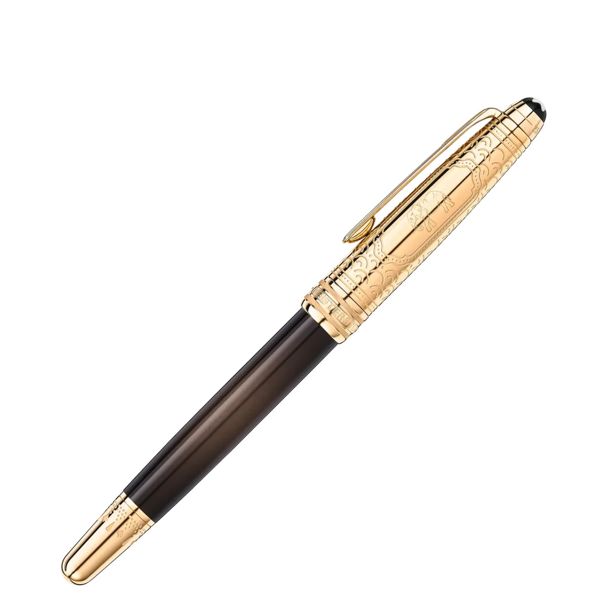 Die Kollektion „Meisterstück Around the World in 80 Days“ ist vom berühmten Abenteuerroman von Jules Verne inspiriert. Der Doué Classique Rollerball mit goldbeschichteter Metallkappe und anthrazitfarbenem Lackgehäuse greift die zweite Etappe der Reise von Bombay nach Yokohama auf. Die Hauptfiguren reisen in diesem Teil des Abenteuers auf einem majestätischen Elefanten, der auf einer Kartusche auf der Kappe abgebildet ist. Die Kappe aus goldbeschichtetem Metall ist mit einem eingravierten Muster verziert, das Glück symbolisiert. Der Clip ist mit einem rot lackierten Diamanten-Kartensymbol verziert, und auf dem Konus sind ein Muster und Kartensymbole eingraviert, die Mr. Foggs Wette symbolisieren, die Reise in 80 Tagen zu schaffen. Auf der Kappe ist die Länge der Reise eingeprägt: 25 Tage von Bombay nach Yokohama und insgesamt 80 Tage.