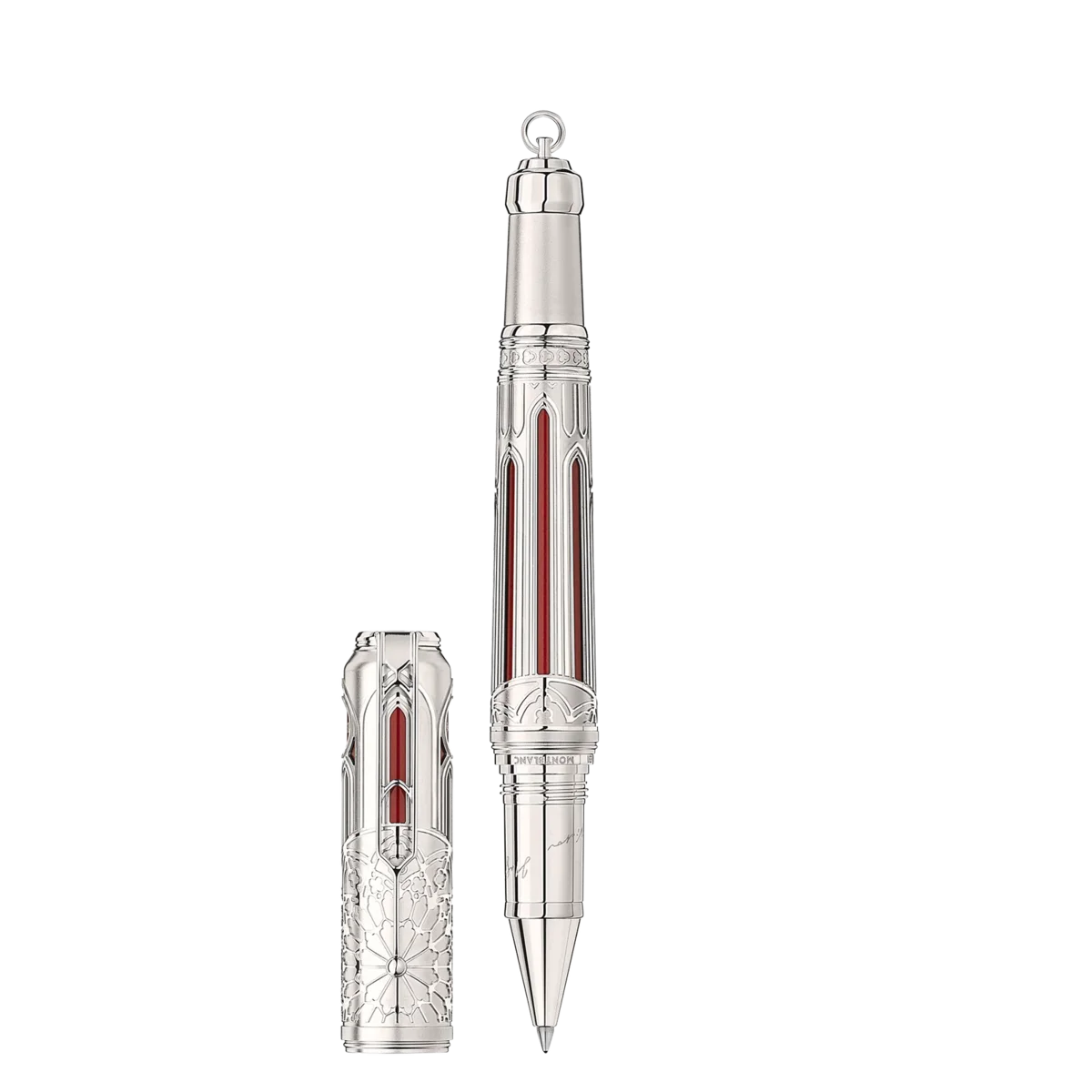 Die Montblanc Writers Edition Homage to Victor Hugo Limited Edition 1831 ist diesem literarischen Genie gewidmet, dessen Leben und Werk die französische Nation geprägt haben. Die Edition ist in vielen Details von Victor Hugos Roman und von Notre-Dame inspiriert. Die Kappe und der Schaft sind mit gotischen Bögen verziert, und eine Rosette auf der Kappe ist eine Hommage an das Rosettenfenster von Notre-Dame. Das Ende des Clips, das wie der Klöppel einer Glocke geformt ist, erinnert an den Glöckner Quasimodo und die Glocken von Notre-Dame. Der Konus der Limited Edition 1831 ist mit einem gravierten Kleeblattfries verziert, der ebenfalls Teil der Architektur von Notre-Dame ist. Die Form des Konus mit einem einzigen Kettenglied am Ende erinnert an die Pfosten, an die Quasimodo gekettet war. Der gelbe Lack auf der Unterseite des Kegels ist eine Anspielung auf den gelben Pass für Gefangene, den Jean Valjean erhielt. Eine Gravur der Zeile „Chaque homme dans sa nuit s’en va vers sa lumière” aus Les Contemplations auf der Kappe symbolisiert die Idee der Erlösung. Die Kappe wird außerdem vom Montblanc Emblem aus Perlmutt gekrönt. Zu Ehren des Erscheinungsjahres von Hugos Roman Notre-Dame de Paris (1831) ist die Edition auf 1.831 Stück limitiert.