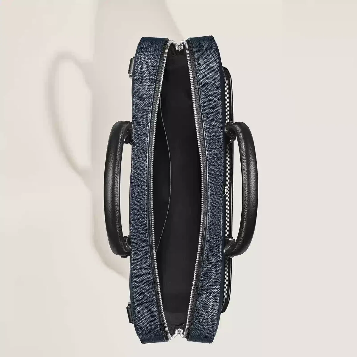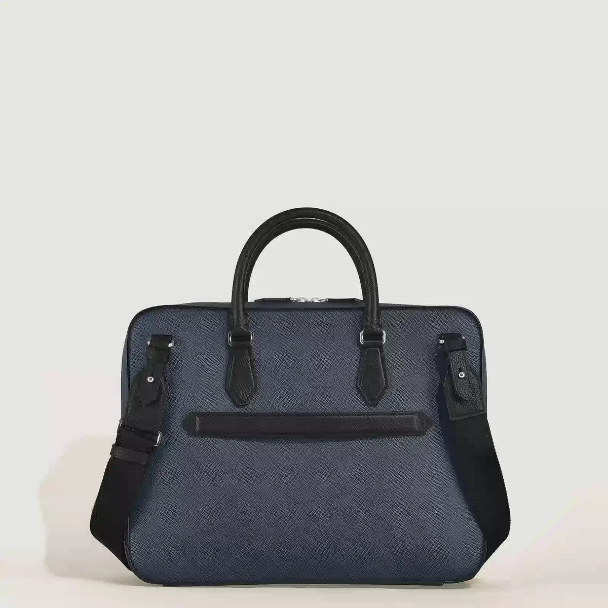 Diese elegante Tasche verfügt über ein geräumiges Hauptfach für den Transport von A4-Dokumenten, Laptops bis zu 13 Zoll, elektronischen Geräten und anderen beruflichen Utensilien. Sie ist aus zweifarbig geprägtem Sartorial-Leder in Schwarz und Blau gefertigt und wurde speziell für geschäftliche Anforderungen entwickelt. Ihre Schreibutensilien können in speziellen Schlaufen verstaut werden, während andere Gegenstände sicher in einer Reißverschlusstasche oder in den beiden zusätzlichen offenen Fächern untergebracht werden können.