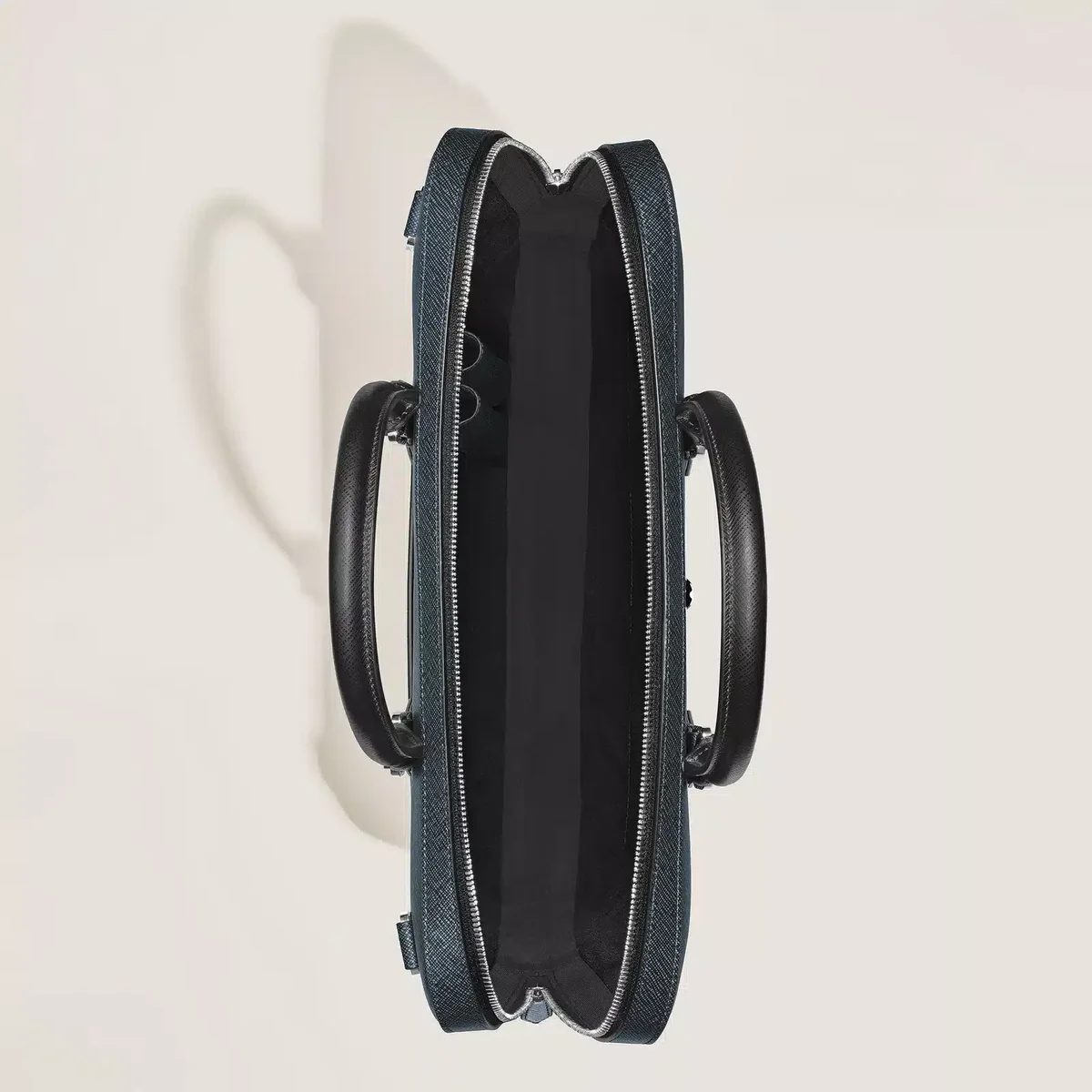 Diese schlanke Dokumententasche verbindet die Tradition der Schreibkunst von Montblanc mit eleganter, moderner Funktionalität. Sie ist aus zweifarbig geprägtem Sartorial-Leder in Schwarz und Blau gefertigt und speziell auf die Bedürfnisse von Geschäftsleuten zugeschnitten. Das geräumige Hauptfach bietet ausreichend Platz für A4-Unterlagen, elektronische Geräte und Schreibutensilien. Der abnehmbare, verstellbare Gurt bietet vielseitige Trageoptionen und macht die Mappe zu einer raffinierten und praktischen Wahl für Berufstätige.