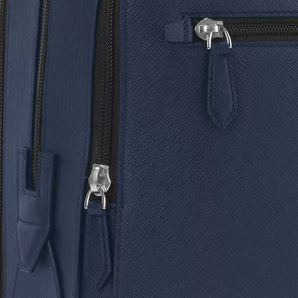 Dieser Rucksack vereint Funktionalität mit raffiniertem City-Style und ist der ideale Begleiter für die Stadt. Das safiano-geprägte, tintenblaue Leder sorgt für einen Hauch von Eleganz, während die drei Fächer der Tasche reichlich Platz für Dokumente, Geräte und Schreibutensilien bieten. Das Außenfach ist mit dem Montblanc Emblem in einer neuen, größeren Größe versehen. Dank des Satellitensystems lässt sich die Tasche leicht an Trolleys befestigen.