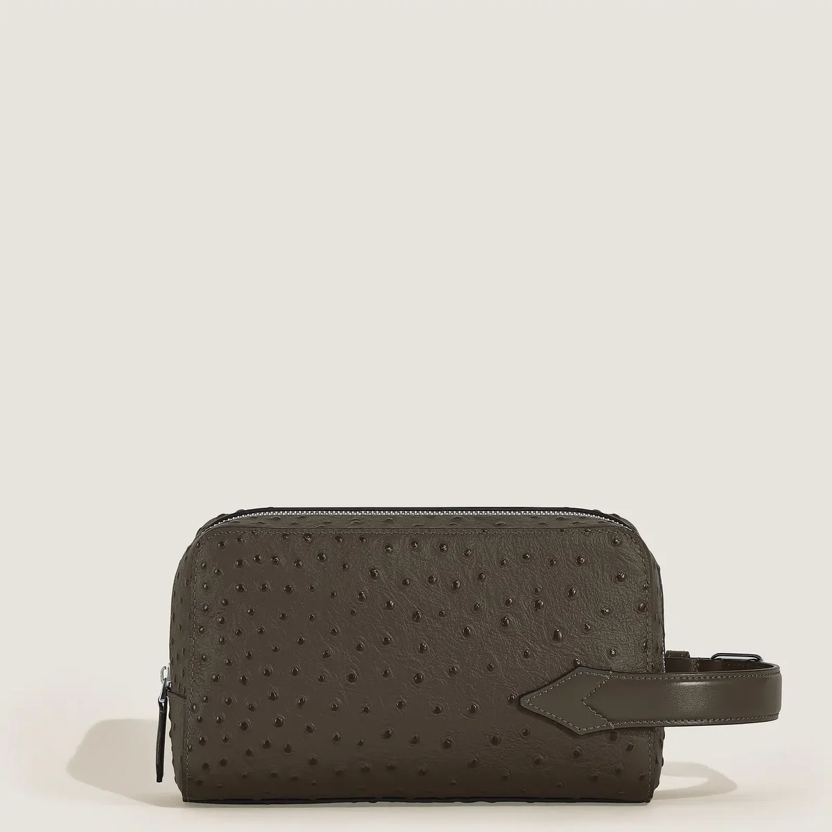 Die neue Clutch-Tasche, deren Kernstück die Kunst des Schreibens ist, wurde aus stilvollem, khakifarbenem Leder mit Straußenprägung gefertigt. Die Eckdetails verleihen dem Design eine unverwechselbare und raffinierte Note. Sie hat die perfekte Größe für die wichtigsten Alltagsgegenstände und verfügt über ein Hauptfach mit einer offenen Tasche und einem abnehmbaren Handgelenkriemen, wodurch sie Eleganz mit vielseitiger Funktionalität verbindet.