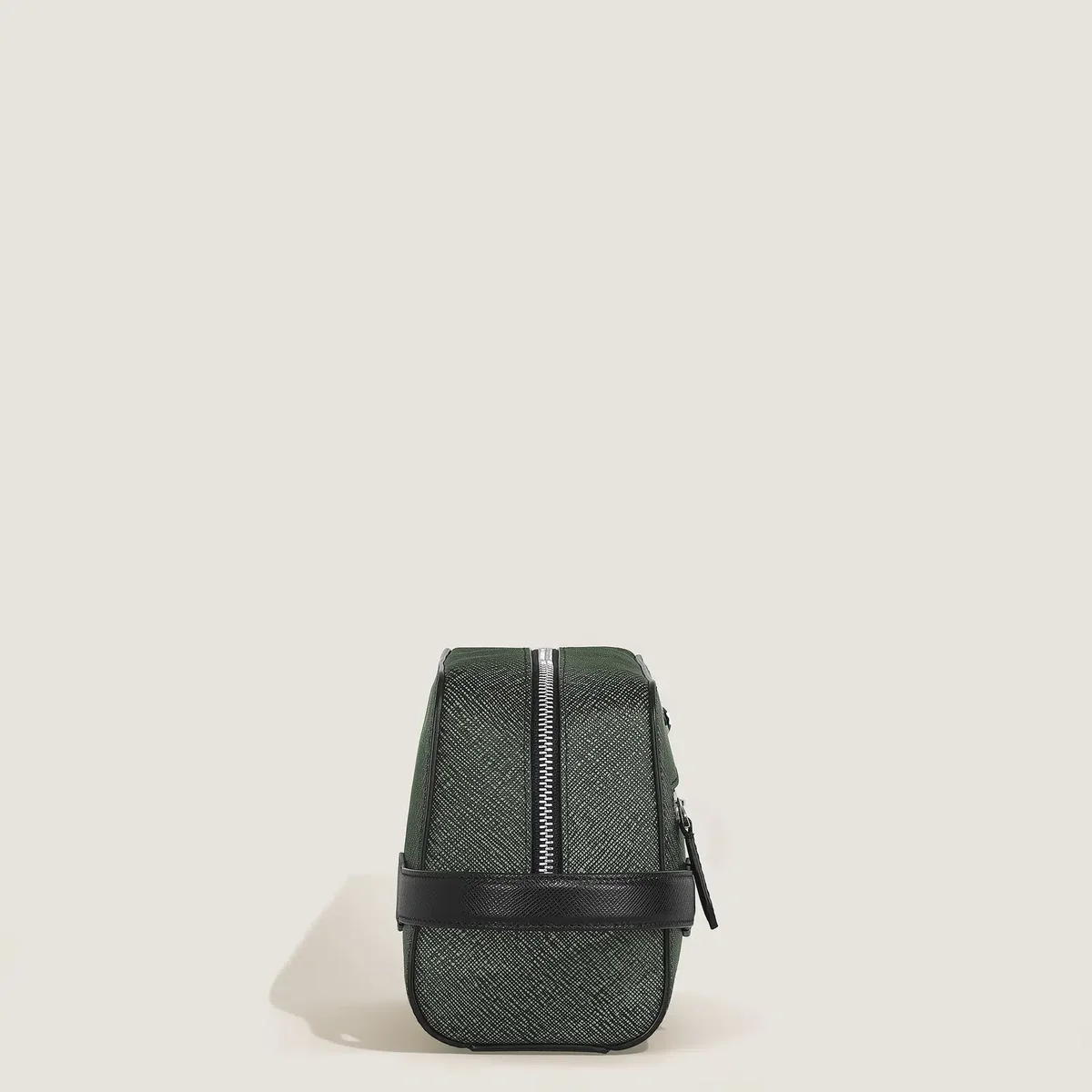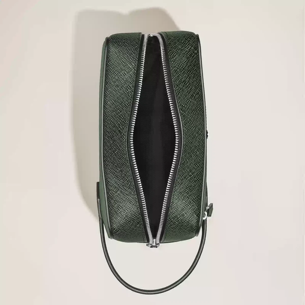 Ob auf Geschäftsreisen oder im Urlaub, diese Clutch ist ein unverzichtbarer Reisebegleiter. Sie ist aus geprägtem Sartorial-Leder in einer raffinierten zweifarbigen Kombination aus edlem Khaki und Schwarz gefertigt und verfügt über einen geräumigen Innenraum und eine Außentasche mit Reißverschluss für Ihre wichtigsten Utensilien. Dank der Ledergriffe können Sie sie in der Hand tragen oder in einer Reisetasche verstauen.
