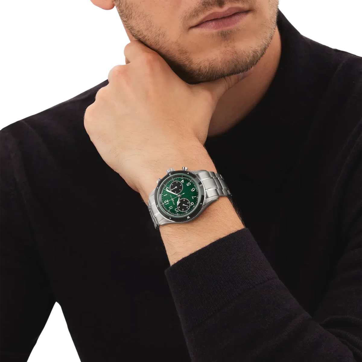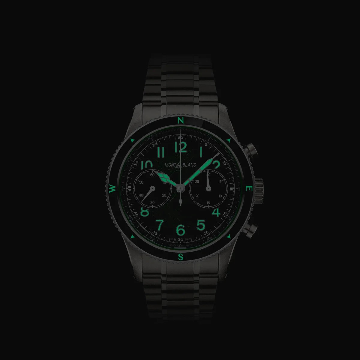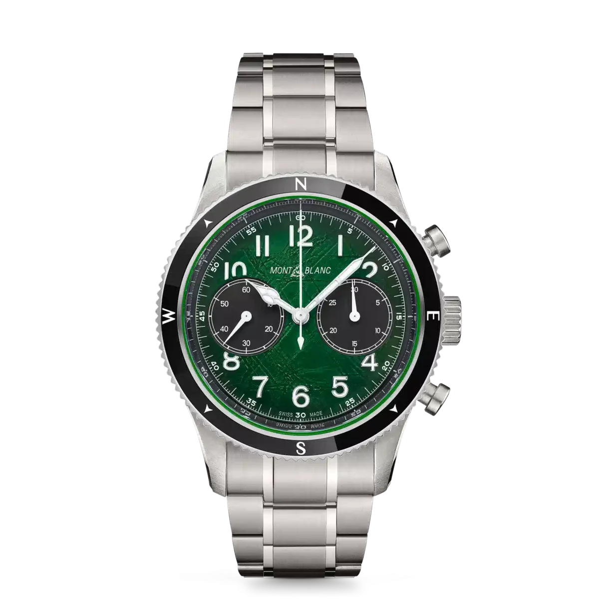 Das sfumato-grüne Zifferblatt mit Gletschermuster dieser Montblanc 1858 Automatic Chronograph 0 Oxygen fängt den Geist der Bergbesteigung und die Schönheit der Gletscherlandschaft der Antarktis ein und ist von der tiefgrünen Farbe der smaragdgrünen Eisberge oder „Jade-Berge” inspiriert. Die Uhr ist in einem 42-mm-Edelstahlgehäuse untergebracht, das vollständig sauerstofffrei ist. Das Zifferblatt ist mit einer Bi-Compax-Chronographenkonfiguration mit einer schwarzen kleinen Sekunde bei 9 Uhr und einem schwarzen 30-Minuten-Chronographenzähler bei 3 Uhr verziert. Passend zu den Hilfszifferblättern verfügt dieser Zeitmesser über eine schwarze, bidirektionale Keramiklünette mit lumineszierenden Himmelsrichtungen. Er ist mit einem austauschbaren Edelstahlarmband mit Verjüngung und Feineinstellung sowie einem gravierten Gehäuseboden mit der Sondergravur „Spirit of Exploration“ ausgestattet. Ident-Nr. MB133298