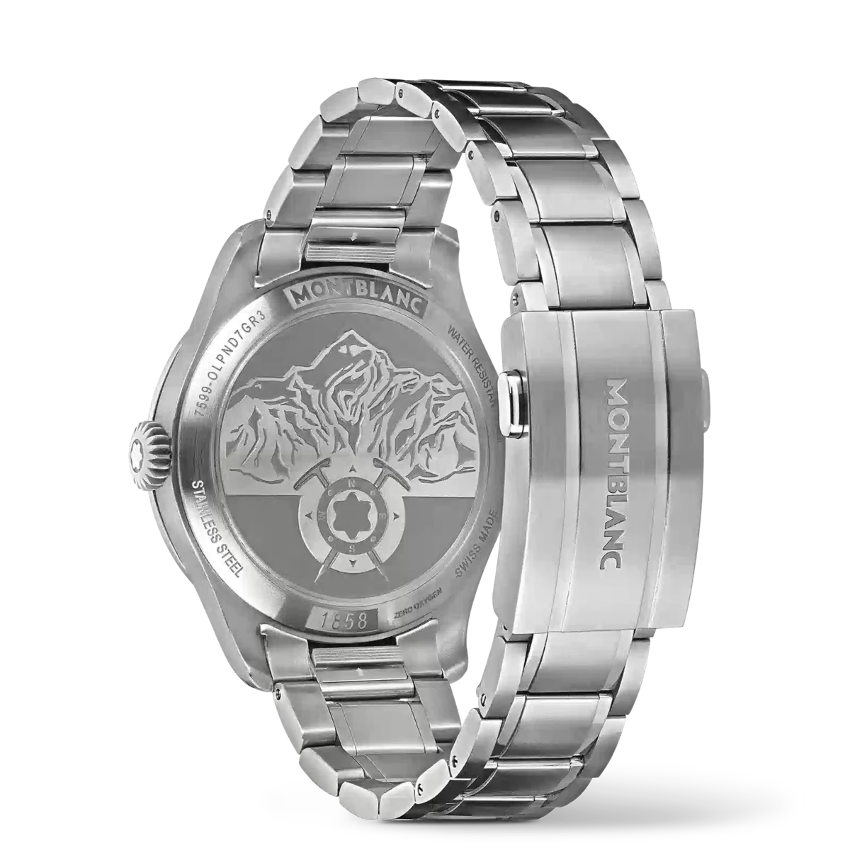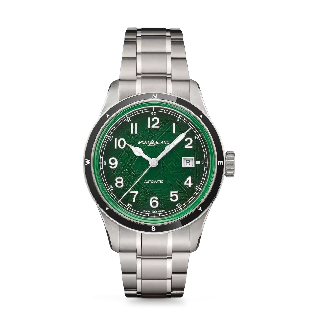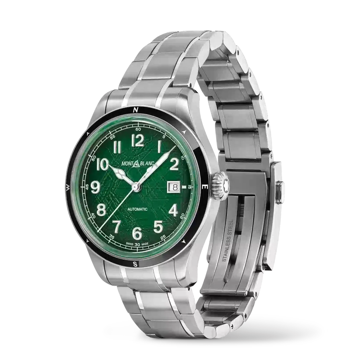 Das sfumato-grüne Zifferblatt mit Gletschermuster dieser Montblanc 1858 Automatic Date 0 Oxygen fängt den Geist der Bergbesteigung ein und ist von der tiefgrünen Farbe der smaragdgrünen Eisberge oder „Jade-Berge“ inspiriert. Die Uhr ist in einem 41-mm-Edelstahlgehäuse untergebracht, das vollständig sauerstofffrei ist, und verfügt über eine feste schwarze Keramiklünette mit lumineszierenden Himmelsrichtungen. Sie ist mit einem austauschbaren Edelstahlarmband mit Verjüngung und Feineinstellung sowie einem gravierten Gehäuseboden mit der Sondergravur „Spirit of Exploration” ausgestattet.