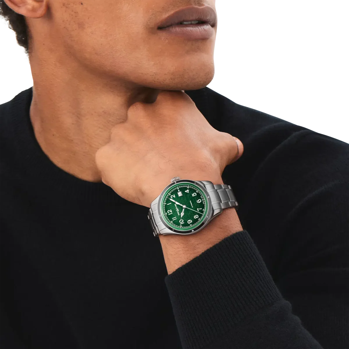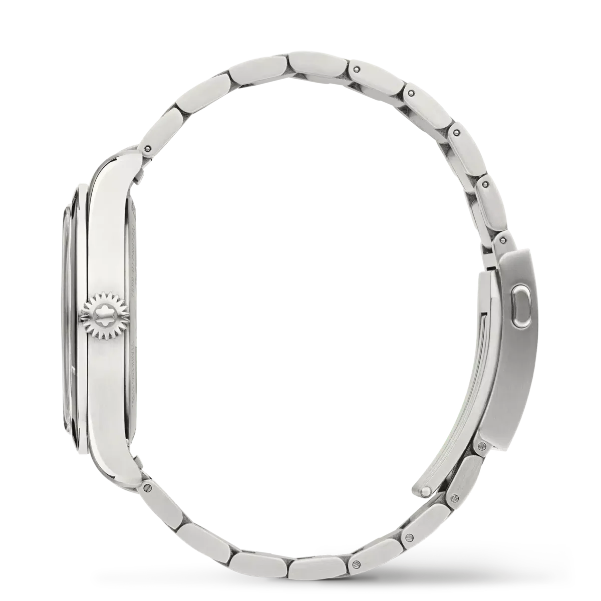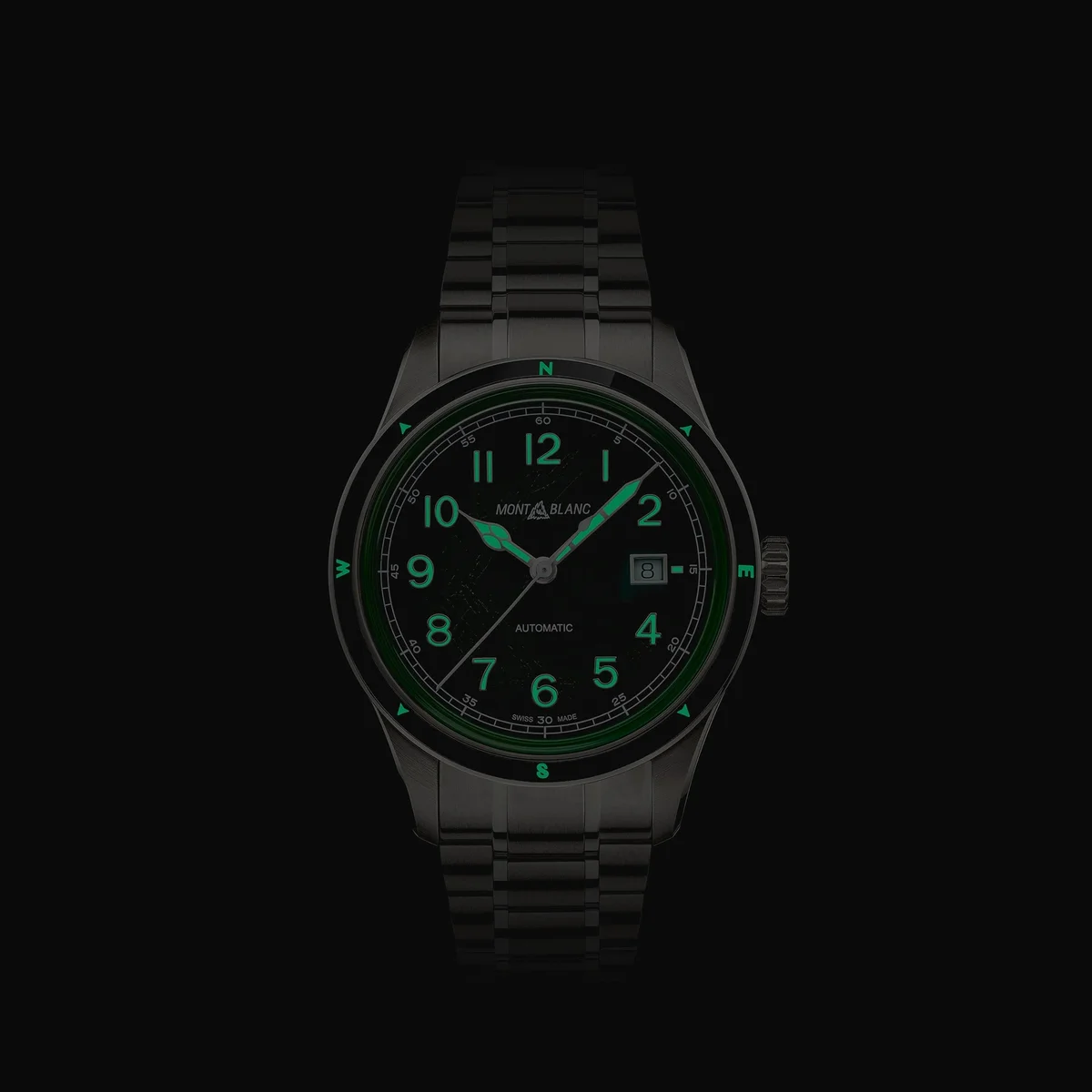 Das sfumato-grüne Zifferblatt mit Gletschermuster dieser Montblanc 1858 Automatic Date 0 Oxygen fängt den Geist der Bergbesteigung ein und ist von der tiefgrünen Farbe der smaragdgrünen Eisberge oder „Jade-Berge“ inspiriert. Die Uhr ist in einem 41-mm-Edelstahlgehäuse untergebracht, das vollständig sauerstofffrei ist, und verfügt über eine feste schwarze Keramiklünette mit lumineszierenden Himmelsrichtungen. Sie ist mit einem austauschbaren Edelstahlarmband mit Verjüngung und Feineinstellung sowie einem gravierten Gehäuseboden mit der Sondergravur „Spirit of Exploration” ausgestattet.