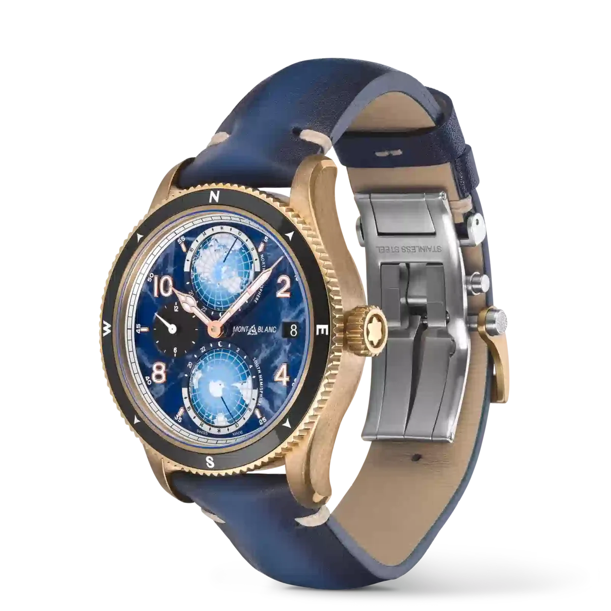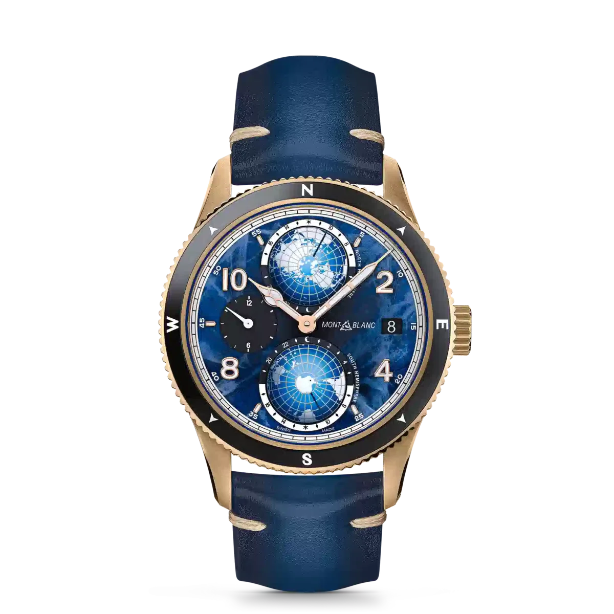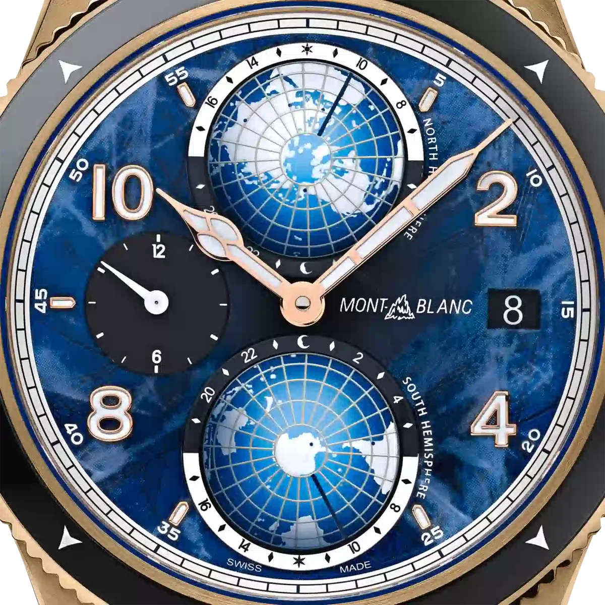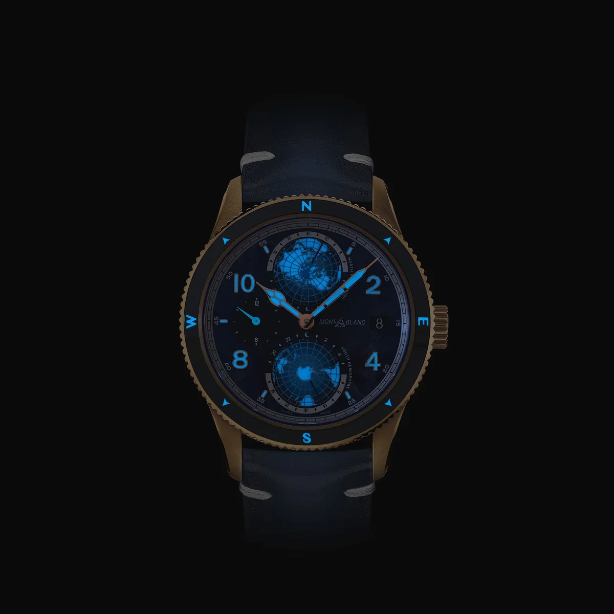 Die Montblanc 1858 Geosphere 0 Oxygen Limited Edition ist vollständig sauerstofffrei, um die Leistung und Präzision der Uhr auch unter härtesten Bedingungen in den Bergen langfristig zu verbessern. Der vollständig sauerstofffreie Uhrwerk verhindert nicht nur das Beschlagen, das bei starken Temperaturschwankungen in der Höhe auftreten kann, sondern auch Oxidation. Ohne Sauerstoff halten alle Komponenten deutlich länger und sorgen für eine höhere Präzision über einen längeren Zeitraum. Die Uhr verfügt über ein 42-mm-Gehäuse aus Bronze mit einer bidirektionalen gerändelten Keramiklünette mit lumineszierenden Himmelsrichtungen und dem Zifferblatt mit Gletschermuster des Hauses. Die Uhr wird vom Automatikwerk MB 29.25 mit Manufakturkomplikation angetrieben. Wie bei allen Modellen der 1858 Geosphere sind sowohl die nördliche als auch die südliche Hemisphäre mit zwei dreidimensionalen Globen dargestellt und verfügen über eine Tag- und Nachtanzeige, sodass der Träger mit einem Blick sehen kann, wie spät es auf der Erde ist. Ident-Nr. MB129415