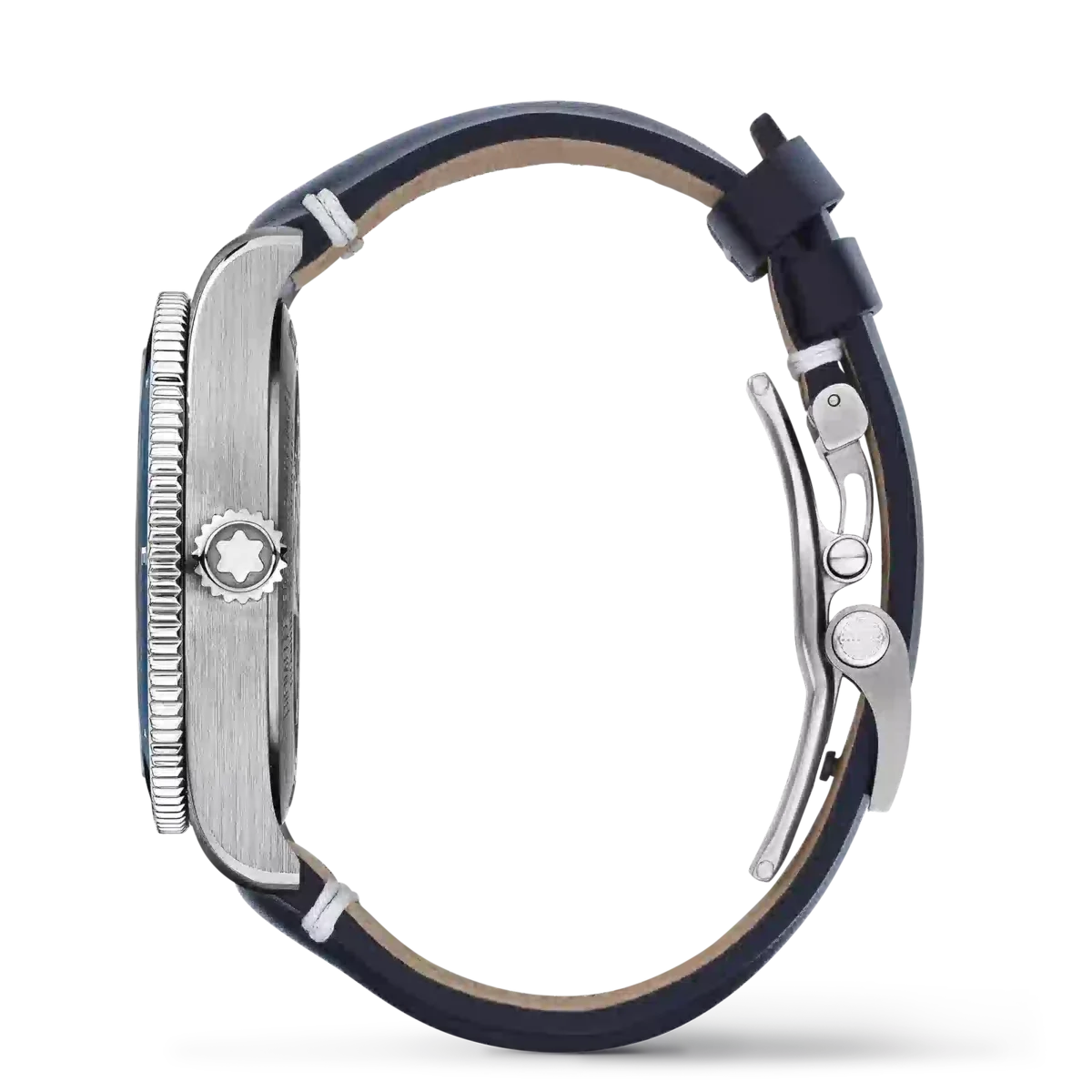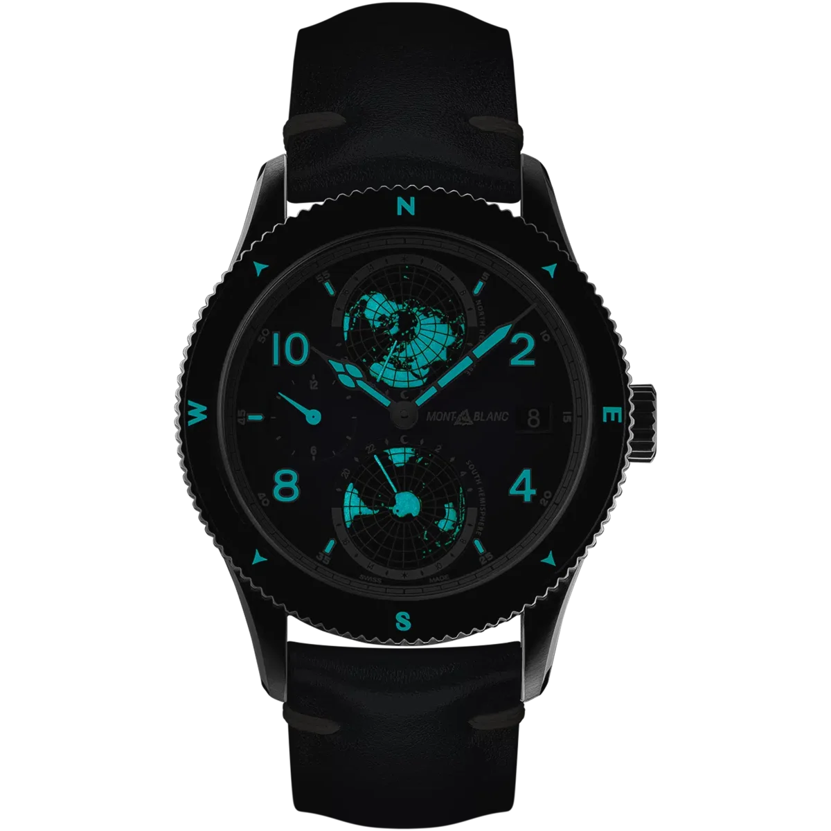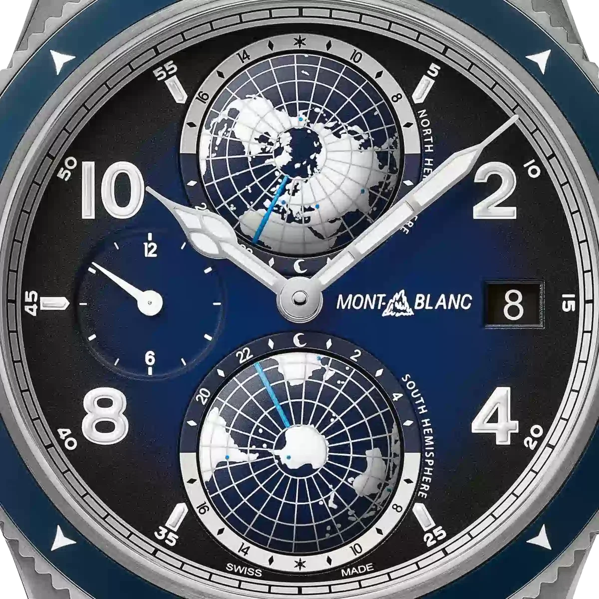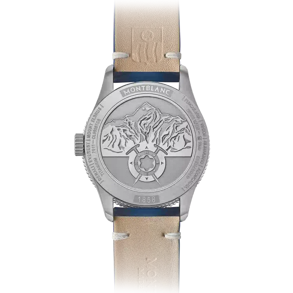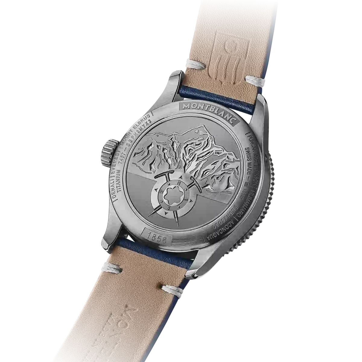 Die Produktlinie Montblanc 1858 ist von den professionellen Minerva-Uhren aus den 1920er- und 1930er-Jahren inspiriert, die für den militärischen Einsatz und für Expeditionen konzipiert wurden. Die Produktlinie Montblanc 1858 interpretiert diese legendären Zeitmesser neu und verkörpert den Geist der Bergbesteigung sowie den modernen Trend der Rückkehr zur Natur. Die Montblanc 1858 Geosphere ist der Herausforderung gewidmet, die sieben höchsten Gipfel der Welt zu besteigen – dem Heiligen Gral des Bergsteigens. Sie verfügt über ein 42-mm-Titangehäuse, kombiniert mit blauen und kontrastierenden eisweißen Designdetails, die von den Farben der Gletscher inspiriert sind. Die Uhr verfügt über eine von den Montblanc-Uhrmachern in Villeret entwickelte Weltzeitkomplikation: zwei gewölbte Kugeln, die sich in entgegengesetzte Richtungen drehen und in 24 Stunden eine vollständige Umdrehung vollführen. Beide sind von einer Skala mit den 24 Zeitzonen sowie einer Tag- und Nachtanzeige in kontrastierenden Farben umgeben. Dies ermöglicht eine intuitive Erfassung der verschiedenen Zeitzonen, unterstützt durch SuperLumiNova®, das für bessere Sichtbarkeit und Leistung bei Nacht auf die Kontinente aufgetragen wurde. Abgerundet wird die Uhr durch ein blaues Sfumato-Kalbslederarmband mit weißen Nähten. Ident-Nr. MB125565
