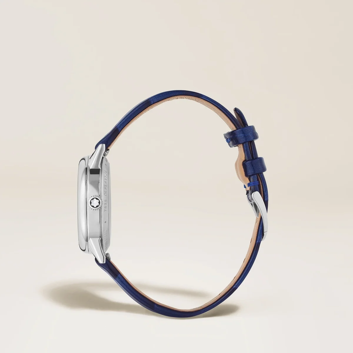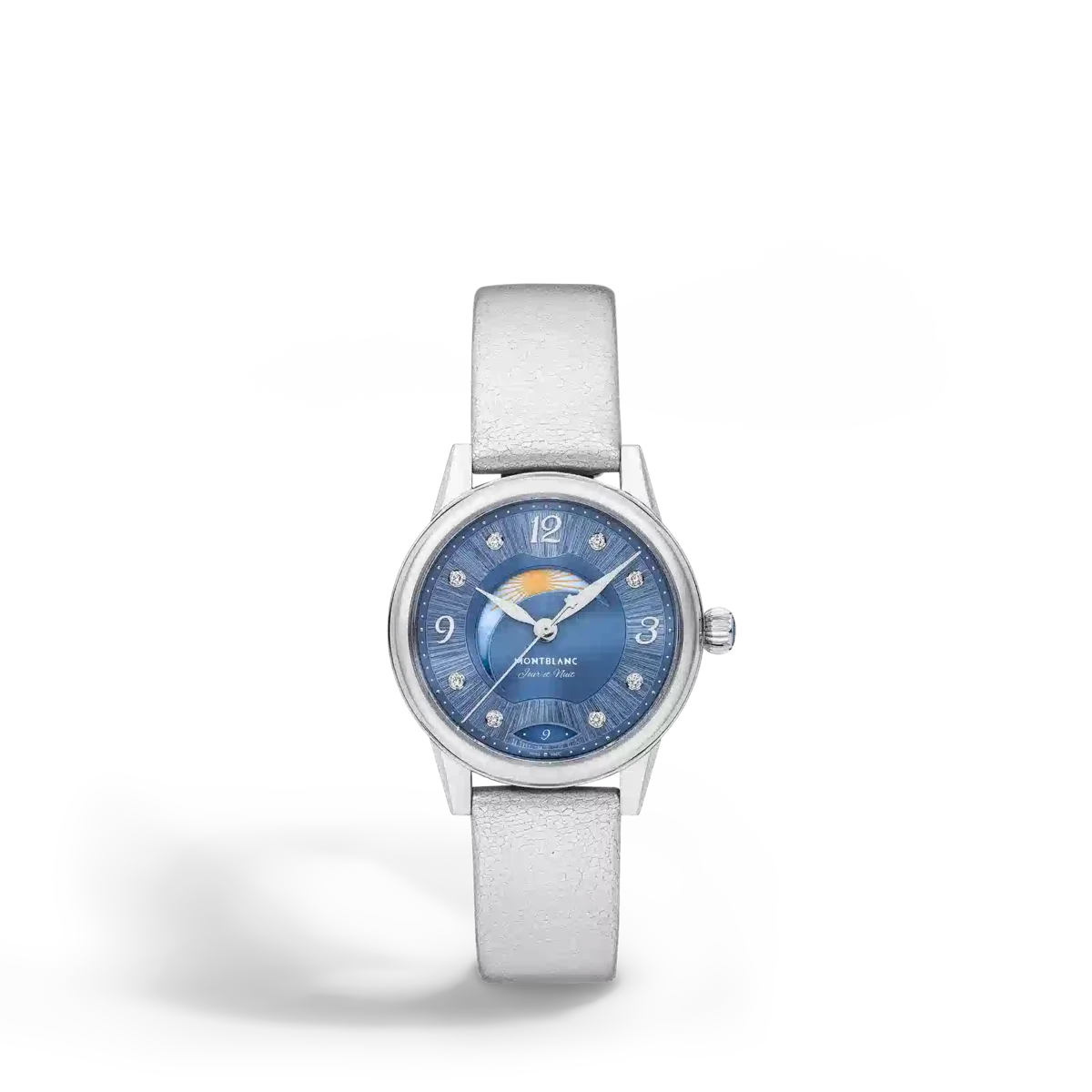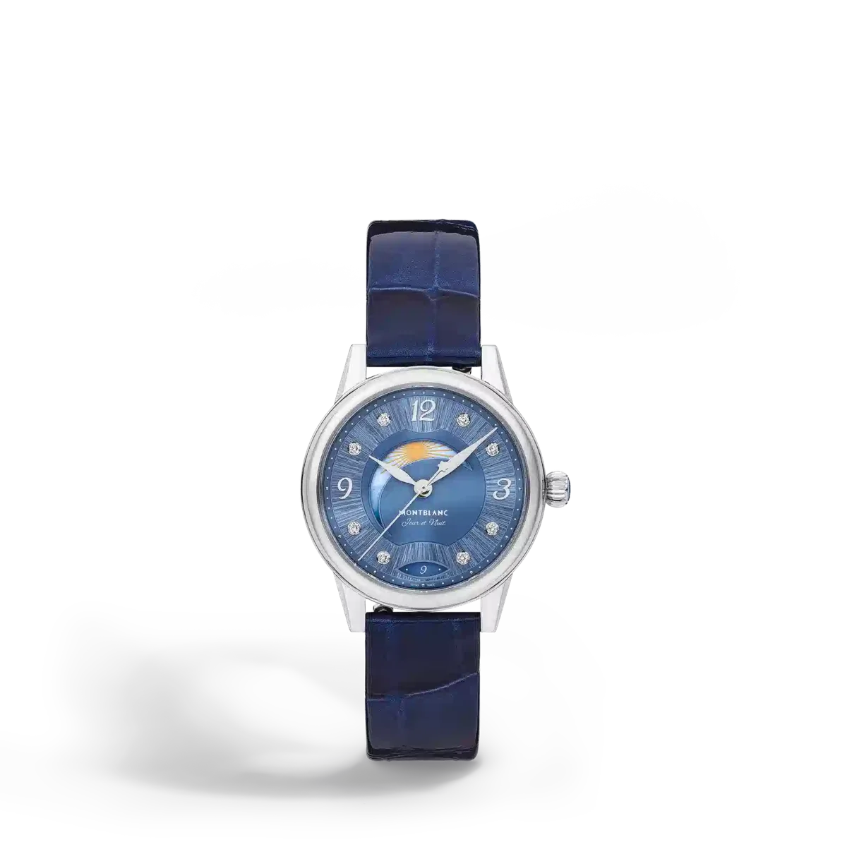 Die Montblanc Bohème Day & Night interpretiert die Codes der hohen Uhrmacherkunst auf elegante und feminine Weise. Sie ist von der Welt der Handschrift und der Aquarellmalerei inspiriert und verfügt über ein 30-mm-Edelstahlgehäuse. Sie verfügt über ein elegantes blaues Zifferblatt mit Sonnenschliff, das mit Diamantindexen, rhodinierten arabischen Ziffern und Zeigern verziert ist. Weitere raffinierte Details sind ein Filet-Sauté-Muster und eine Stanztechnik namens Filé d’étoiles. Ausgestattet mit dem Automatikwerk MB 24.20 zeigt dieses Modell die Stunden, Minuten und Sekunden sowie das Datum in einer mandelförmigen Öffnung mit handgeschriebenen Ziffern an. Die romantische Schriftart wurde auch auf dem Zifferblatt für die Tages- und Nachtanzeige „Jour et Nuit” verwendet. Die himmlische Tag- und Nachtkomplikation zeigt den wechselnden Himmel über einen Zeitraum von 24 Stunden und verleiht der Uhr einen romantischen und künstlerischen Touch, da sie mit Wasserfarben gestaltet ist. Diese Uhr ist mit einem austauschbaren blauen Kalbslederarmband mit Alligatorprägung und einem zusätzlichen Armband ausgestattet. Ident-Nr. MB133334 Bandanstoßbreite 14 mm