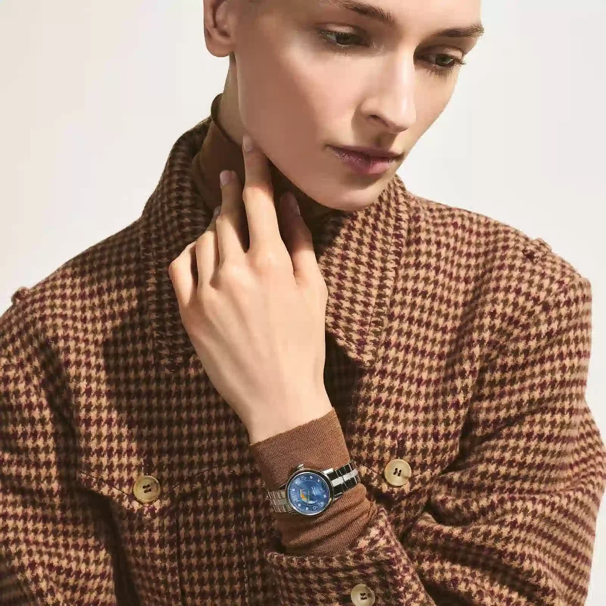 Die Montblanc Bohème Day & Night interpretiert die Codes der hohen Uhrmacherkunst auf elegante und feminine Weise. Sie ist von der Welt der Handschrift und der Aquarellmalerei inspiriert und verfügt über ein 30-mm-Edelstahlgehäuse. Sie verfügt über ein elegantes blaues Zifferblatt mit Sonnenschliff, das mit Diamantindexen, rhodinierten arabischen Ziffern und Zeigern verziert ist. Weitere raffinierte Details sind ein Filet-Sauté-Muster und eine Stanztechnik namens Filé d’étoiles. Ausgestattet mit dem Automatikwerk MB 24.20 zeigt dieses Modell die Stunden, Minuten und Sekunden sowie das Datum in einer mandelförmigen Öffnung mit handgeschriebenen Ziffern an. Die romantische Schriftart wurde auch auf dem Zifferblatt für die Tages- und Nachtanzeige „Jour et Nuit” verwendet. Die himmlische Tag- und Nachtkomplikation zeigt den wechselnden Himmel über einen Zeitraum von 24 Stunden und verleiht der Uhr mit ihren Aquarellfarben einen romantischen und künstlerischen Touch. Diese Uhr ist mit einem austauschbaren Edelstahlarmband mit strukturiertem Mittelglied und Feineinstellungssystem ausgestattet. Ident-Nr. MB134342