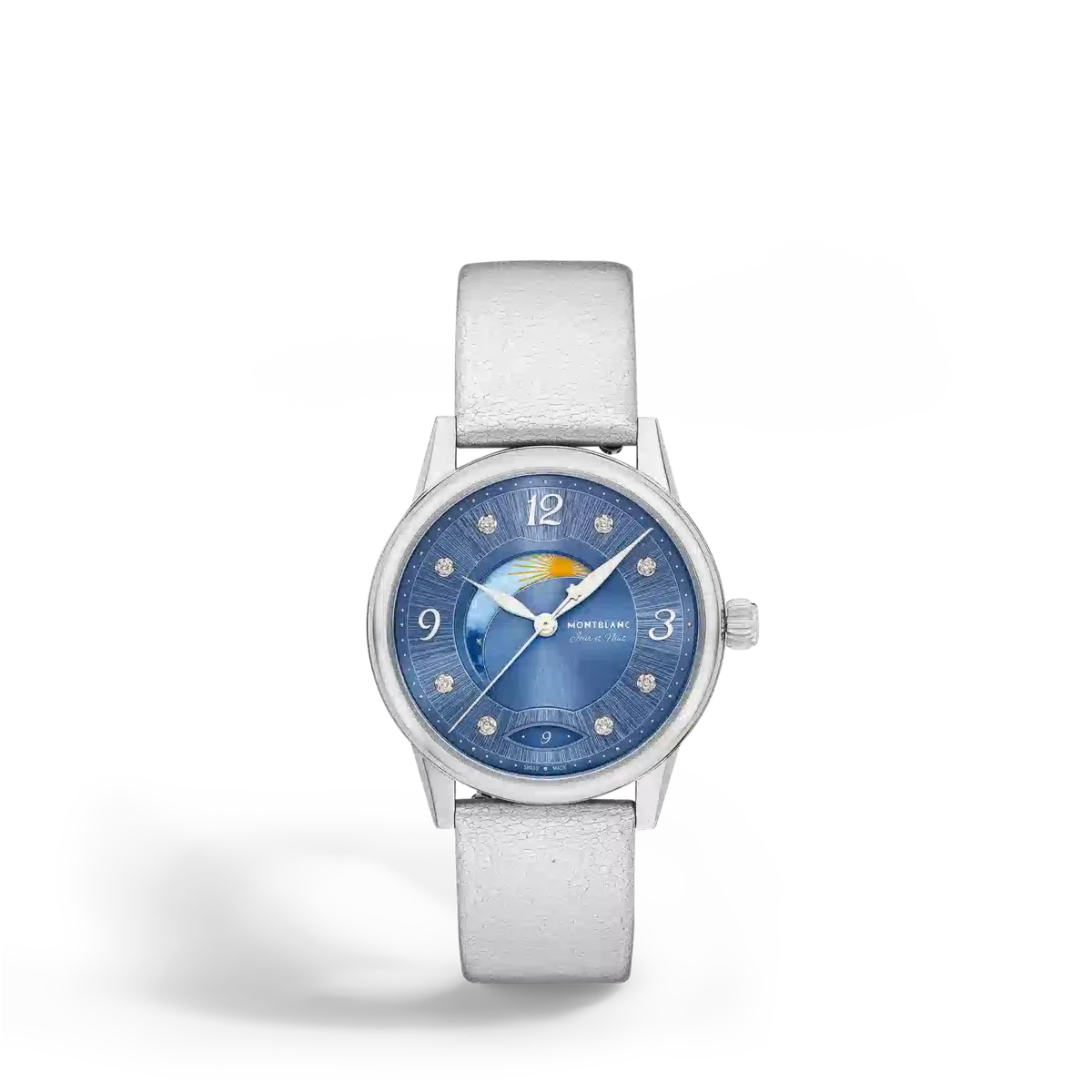 Die Montblanc Bohème Day & Night interpretiert die Codes der hohen Uhrmacherkunst auf elegante und feminine Weise. Sie ist von der Welt der Handschrift und der Aquarellmalerei inspiriert und verfügt über ein 34-mm-Edelstahlgehäuse. Sie verfügt über ein elegantes, blaues Zifferblatt mit Sonnenschliff, das mit Diamantindexen, rhodinierten arabischen Ziffern und Zeigern verziert ist. Weitere raffinierte Details sind ein Filet-Sauté-Muster und eine Stanztechnik namens Filé d’étoiles. Ausgestattet mit dem Automatikwerk MB 24.20 zeigt dieses Modell die Stunden, Minuten und Sekunden sowie das Datum in einer mandelförmigen Öffnung mit handgeschriebenen Ziffern an. Die romantische Schriftart wurde auch auf dem Zifferblatt für die Tages- und Nachtanzeige „Jour et Nuit” verwendet. Die himmlische Tag- und Nachtkomplikation zeigt den wechselnden Himmel über einen Zeitraum von 24 Stunden und verleiht der Uhr einen romantischen und künstlerischen Touch, da sie mit Wasserfarben gestaltet ist. Diese Uhr ist mit einem austauschbaren blauen Kalbslederarmband mit Alligatorprägung und einem zusätzlichen Armband ausgestattet. Ident-Nr. MB133310 Bandbreite 17 mm